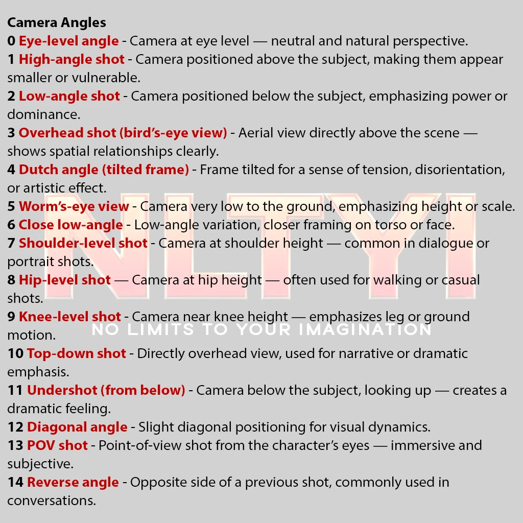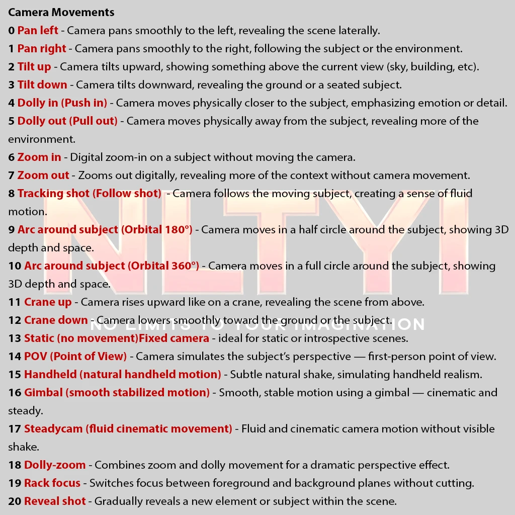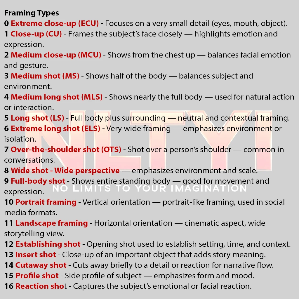ฉันจะให้รายการ 3 รายการ: ประเภทของการกรอบภาพ, มุมกล้อง, และการเคลื่อนไหวของกล้อง. แต่ละอันสอดคล้องกับหมายเลข. ในช่องที่เกี่ยวข้อง, ป้อนหมายเลขที่สอดคล้องกัน.