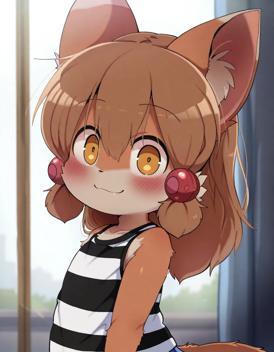 Helpful prompts: body fur, brown fur, animal ear fluff, short hair, brown hair, hair beads, hair bobbles, dog ears, dog tail, yellow eyes,