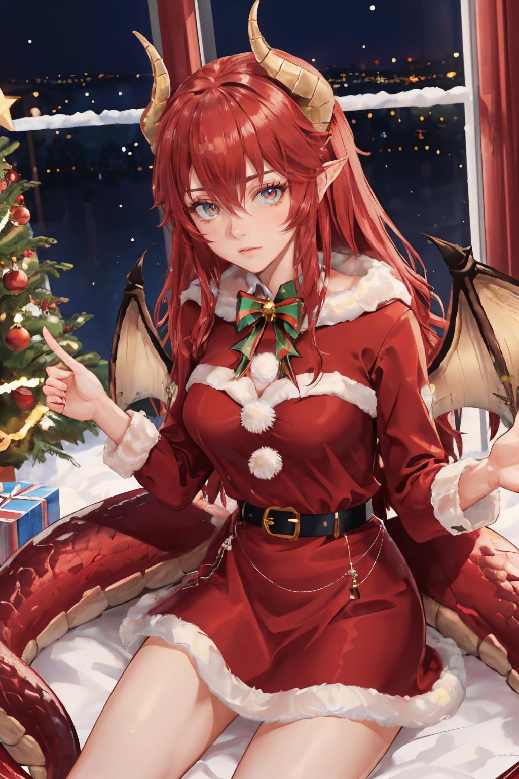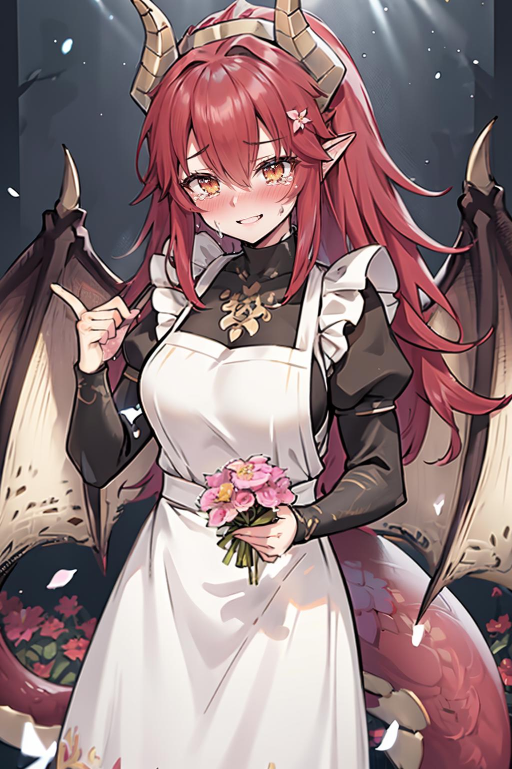 Add "horns, dragon tail, dragon wings, long hair" for her standard appearance.