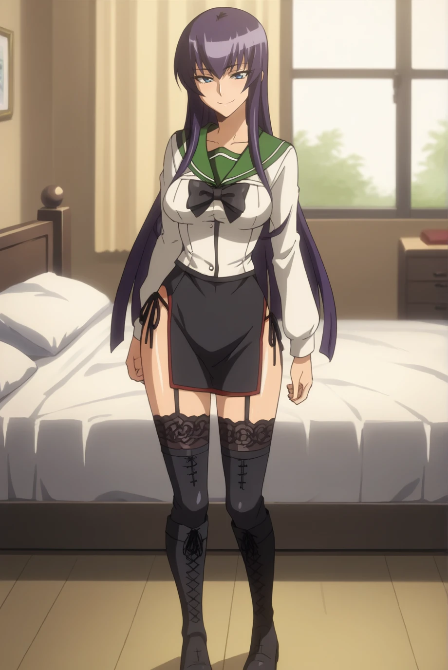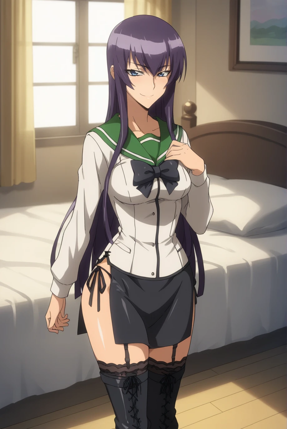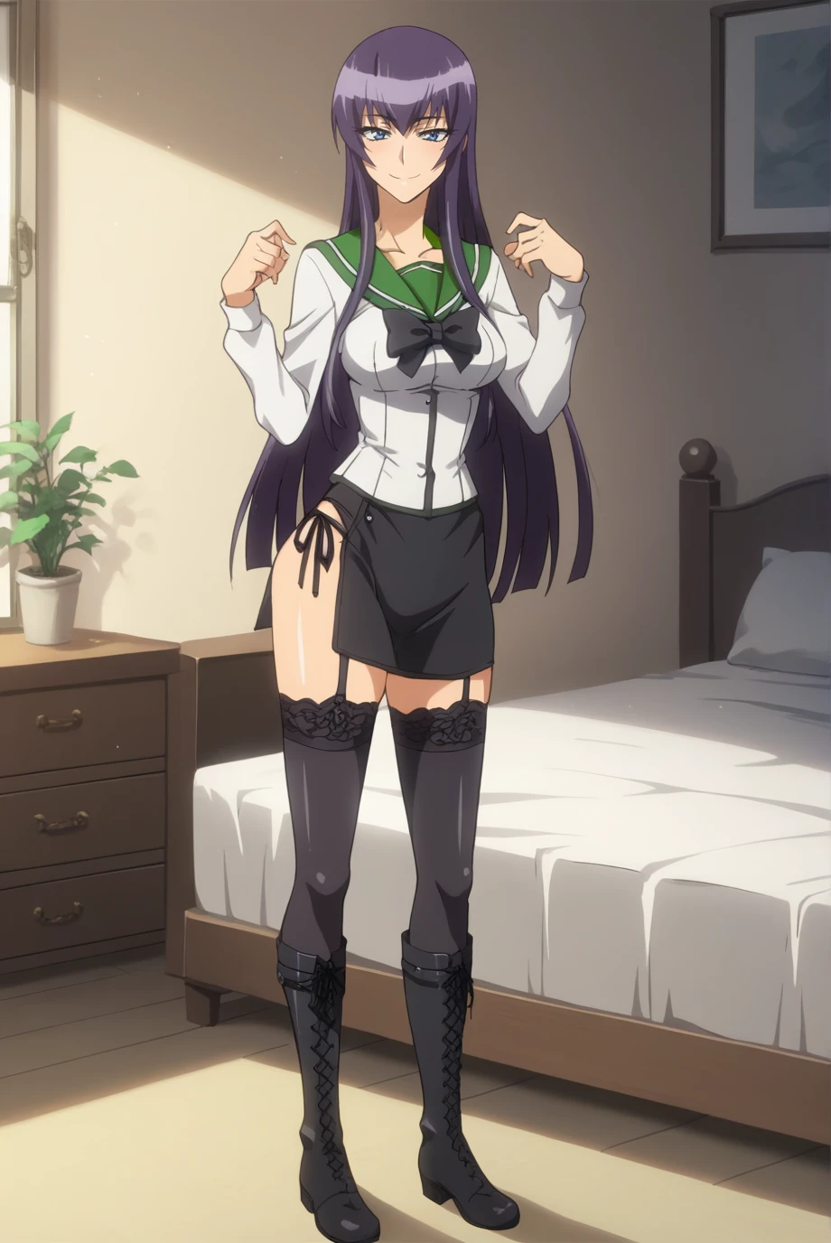 straight hair, side locks, outfit_2, serafuku, green sailor collar, black bowtie, white shirt, long sleeves, miniskirt, side-tie skirt, black skirt, garter straps, black stockings, lace-trimmed legwear, knee boots, black footwear, cross-laced footwear,