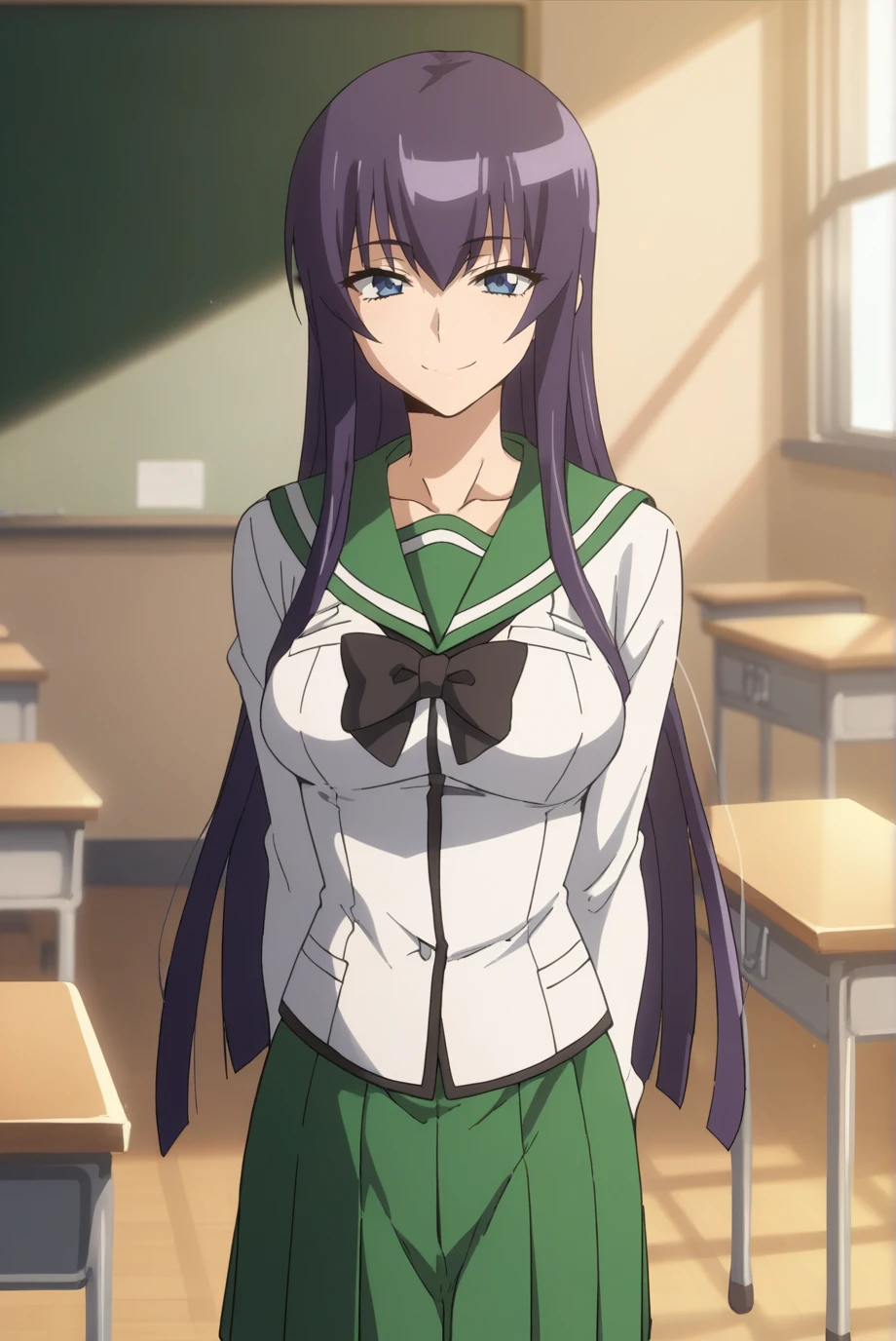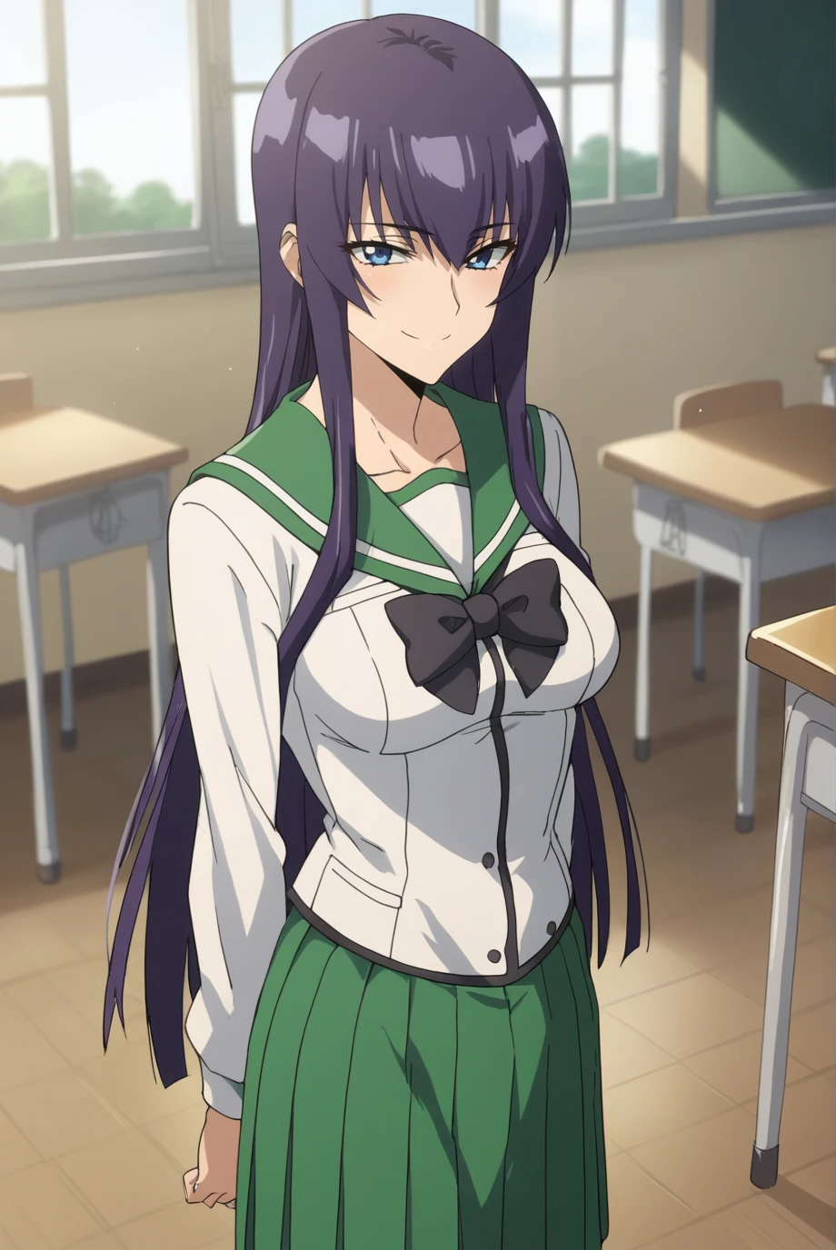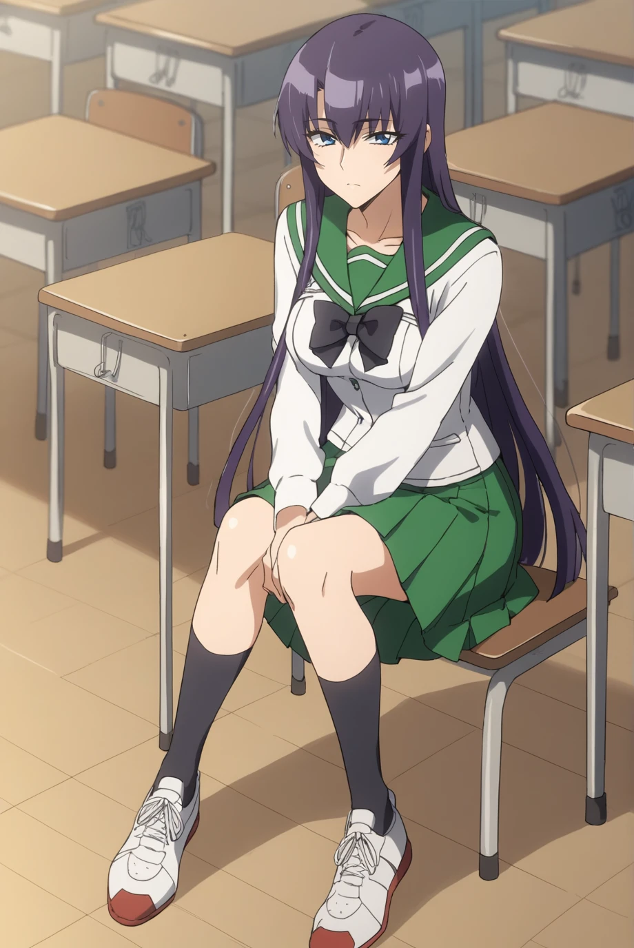 straight hair, side locks, outfit_1, serafuku, green sailor collar, black bowtie, white shirt, long sleeves, green skirt, pleated skirt, long skirt, black kneehighs,
