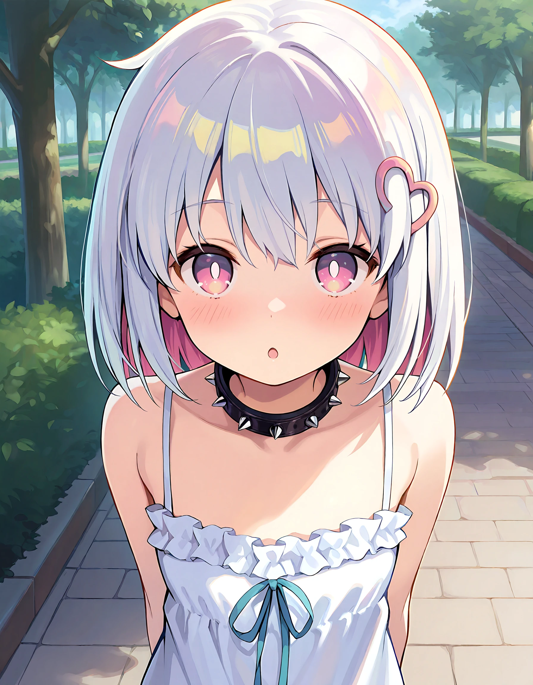sundress, spiked collar, frills, sleeveless dress, frilled dress, bare shoulders, white dress, ribbon,