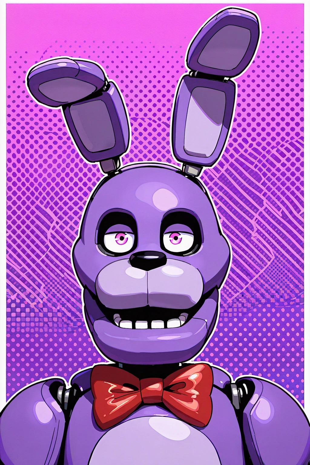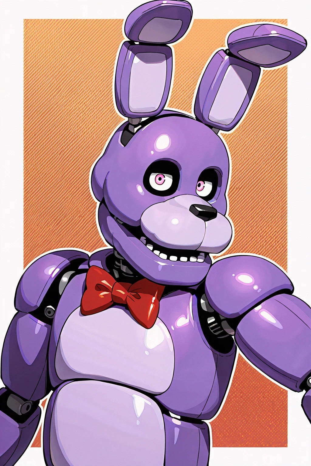 BonnieFNAF1, 1boy, purple-indigo animatronic rabbit, magenta eyes, large rabbit ears, red bowtie, segmented robot joints, weathered metallic appearance, lower teeth, no eyebrows, mecha, bonnie (fnaf),