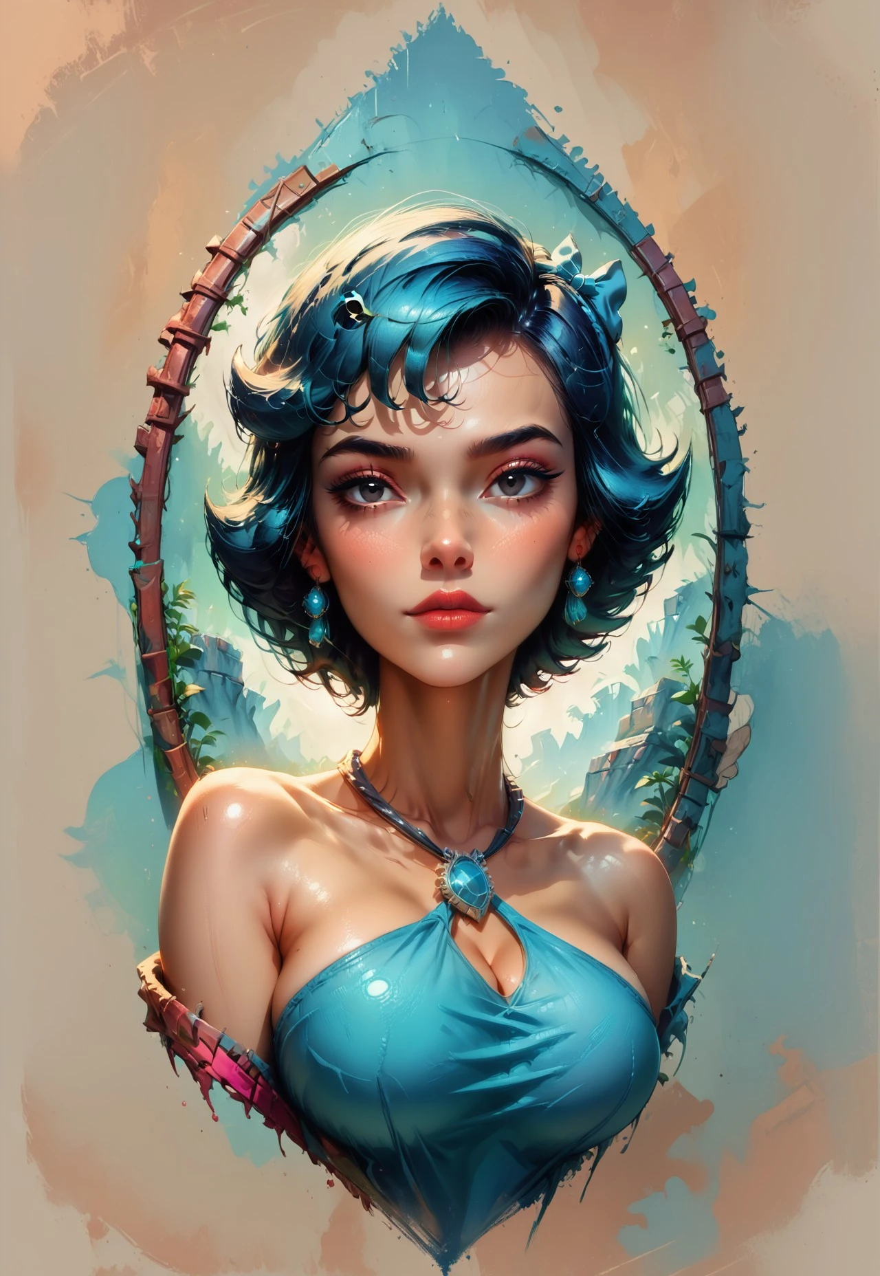 1girl, Betty Rubble, black hair, short hair, blue hair bow, black eyes beautiful face,