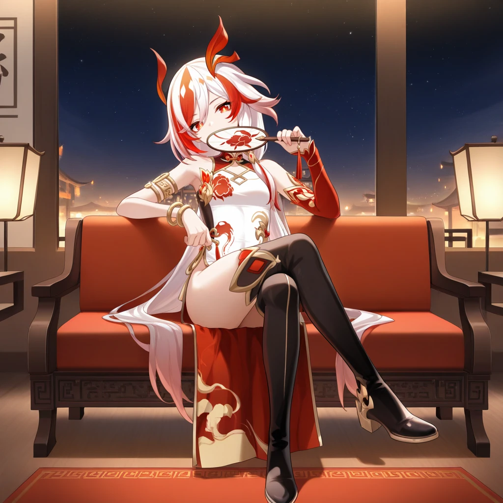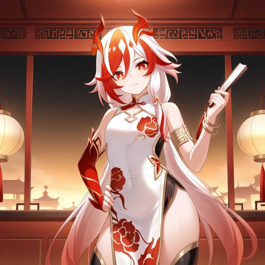 GarudaHi3, Fhg_CN, long hair, multicolored hair, red eyes, yellow pupils, red streaks, white hair, low twintails, fu hua, china dress, sleeveless dress, two-tone collar, white dress, floral print, single arm warmer, red arm warmers, armlet, bracelet, hair ornament, thigh boots, black footwear, pelvic curtain, gradient pelvic curtain, gold trim,Note: Other Red Chinese Outfit will be part of the Spring Outfit LoRA, so look forward to it.
