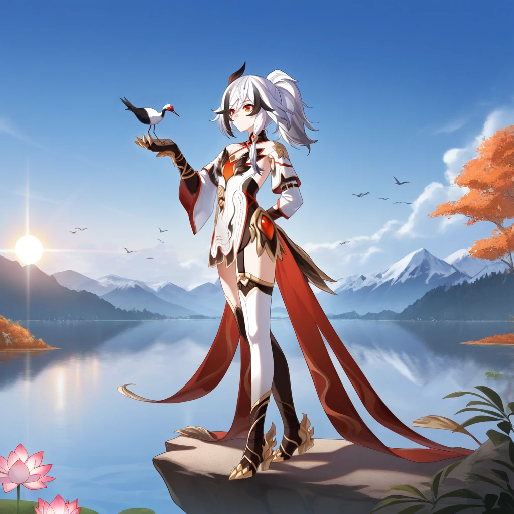 GarudaHi3, Fhg_Def, long hair, multicolored hair, red eyes, yellow pupils, red streaks, pink hair, low twintails, white hair, fu hua, chinese clothes, armored dress, two-tone dress, hair ornament, gorget, sideless dress, jewelry, red feathers, white dress, red dress, side cutout, asymmetrical clothes, brooch, shorts under dress, black shorts, short shorts, black sports bra, sports bra, o-ring, string, detached sleeves, red sleeves, claw ring, red gauntlets, single knee boot, single thigh boot, red footwear, uneven legwear,Crane of Taixuan Outfit: