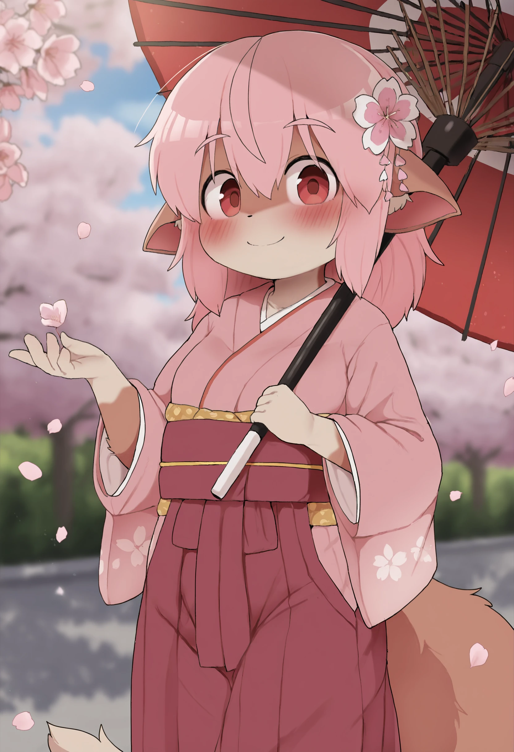 momo-chan:momo \(dagasi\), momo-chan \(dagasi\), fox girl, fox ears, fox tail, ears down, red eyes, gradient eyes, two-tone fur, brown fur, pink hair,