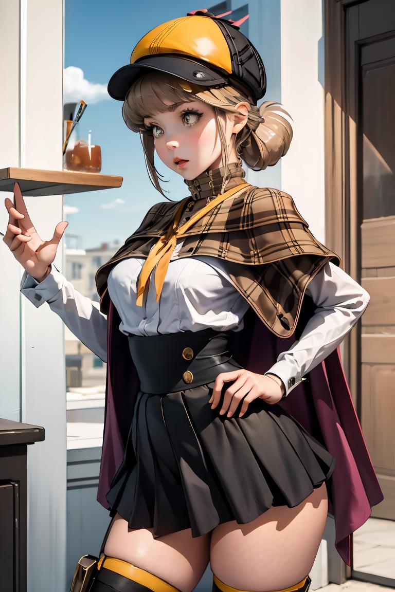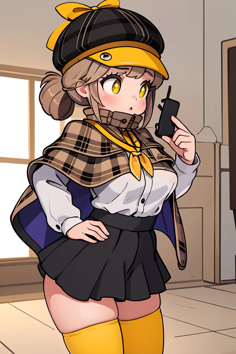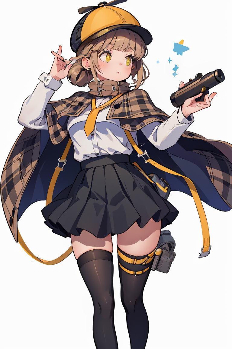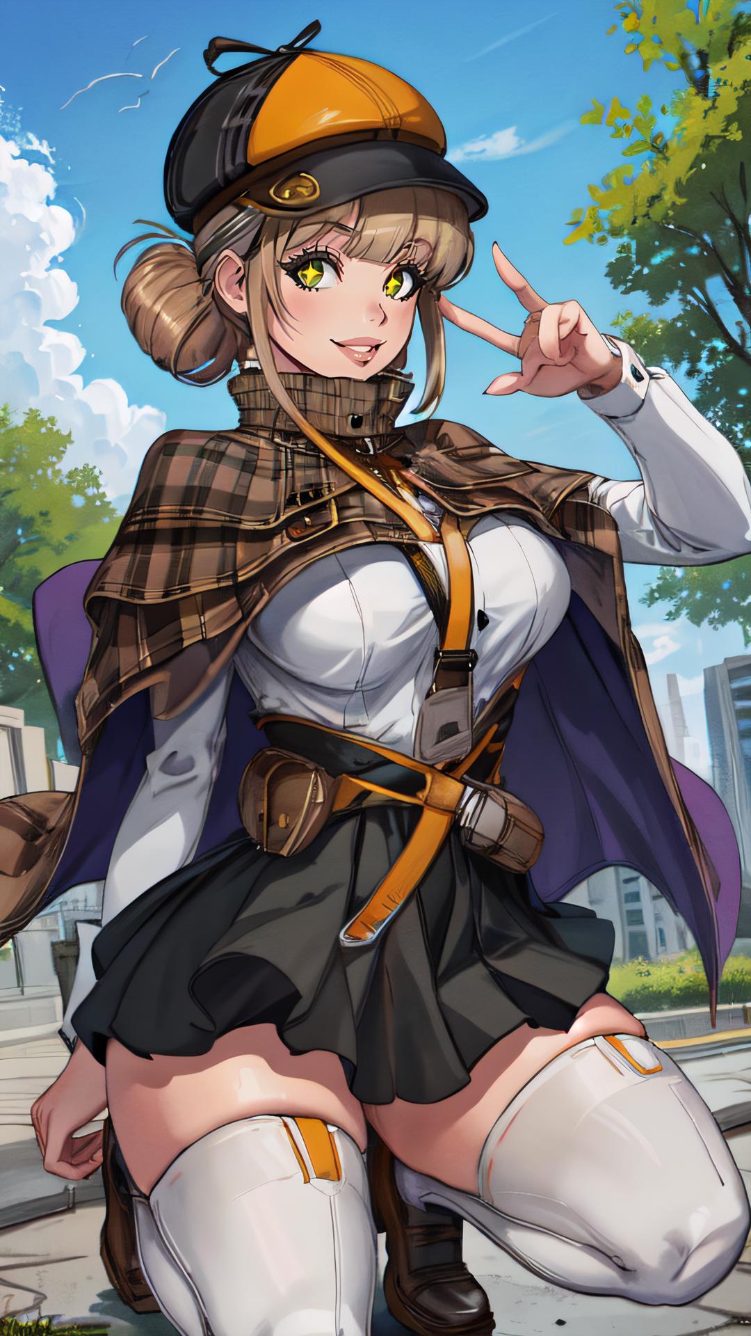Add "defnovel, deerstalker, yellow hat, plaid capelet, white shirt, long sleeves, black skirt, black thighhighs" for her default look.