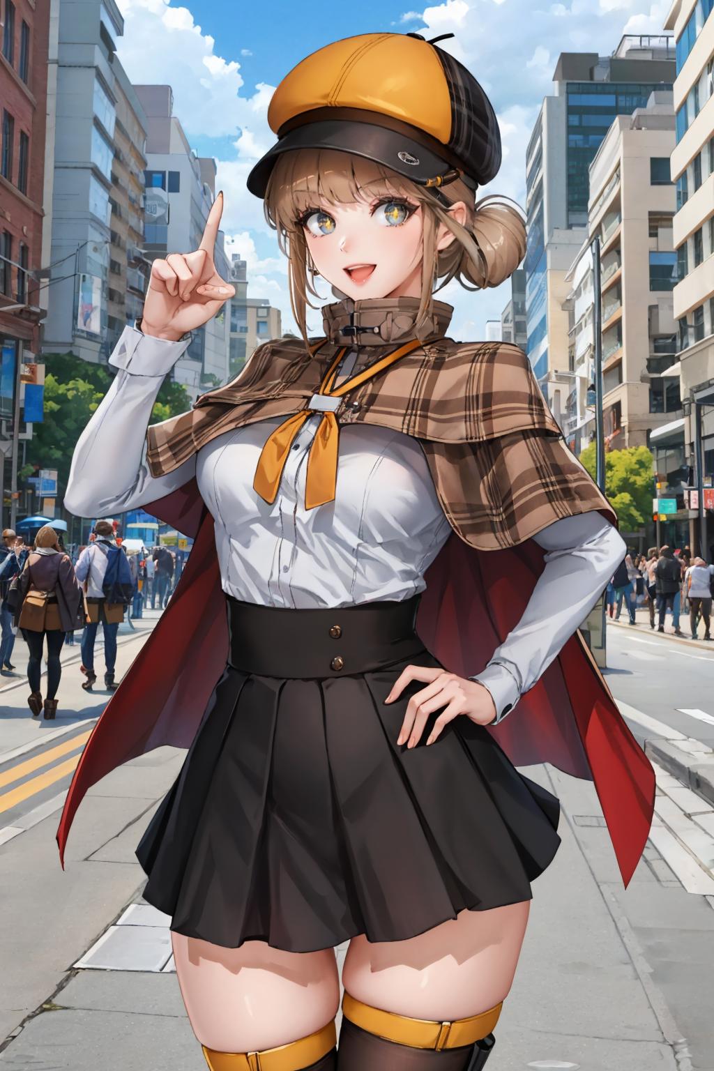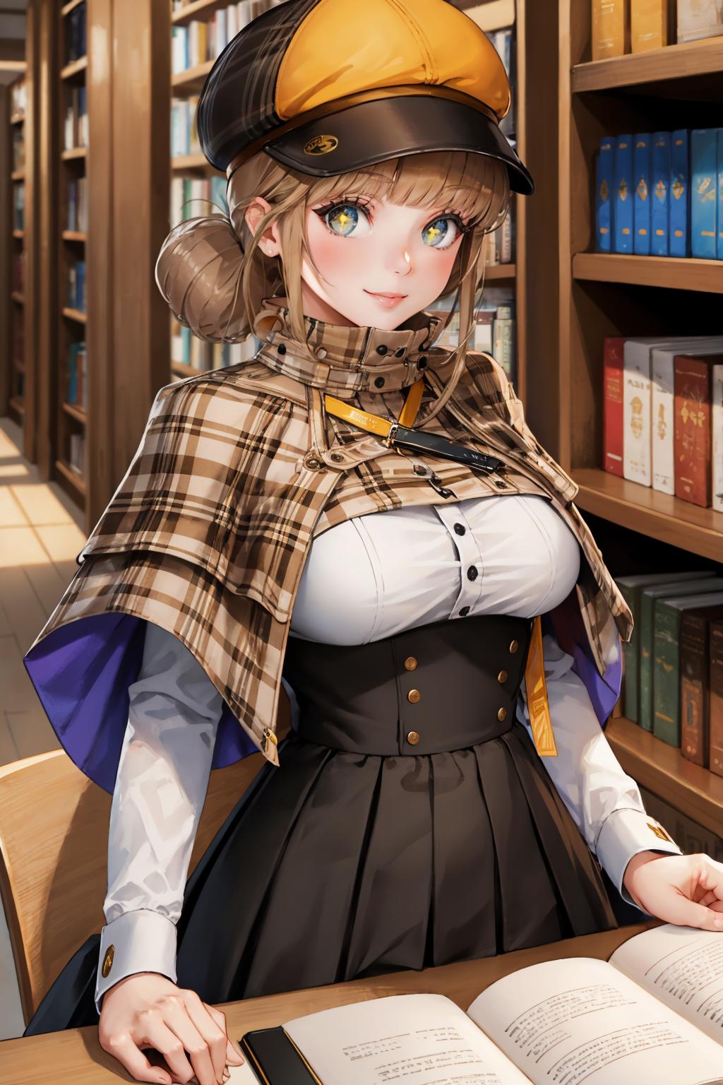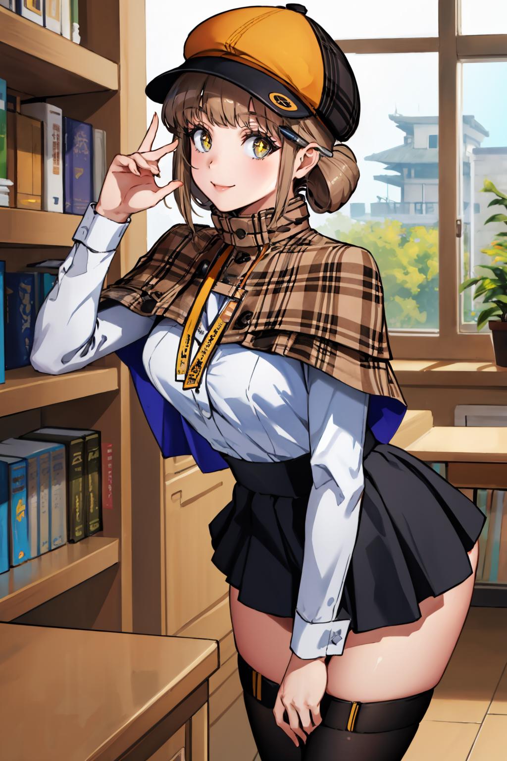 Add "defnovel, deerstalker, yellow hat, plaid capelet, white shirt, long sleeves, black skirt, black thighhighs" for her default look.