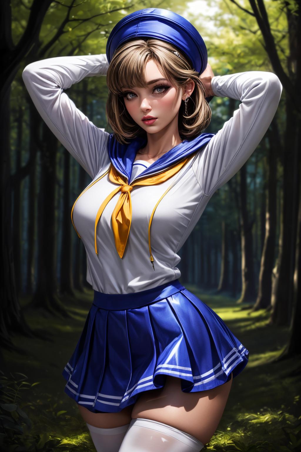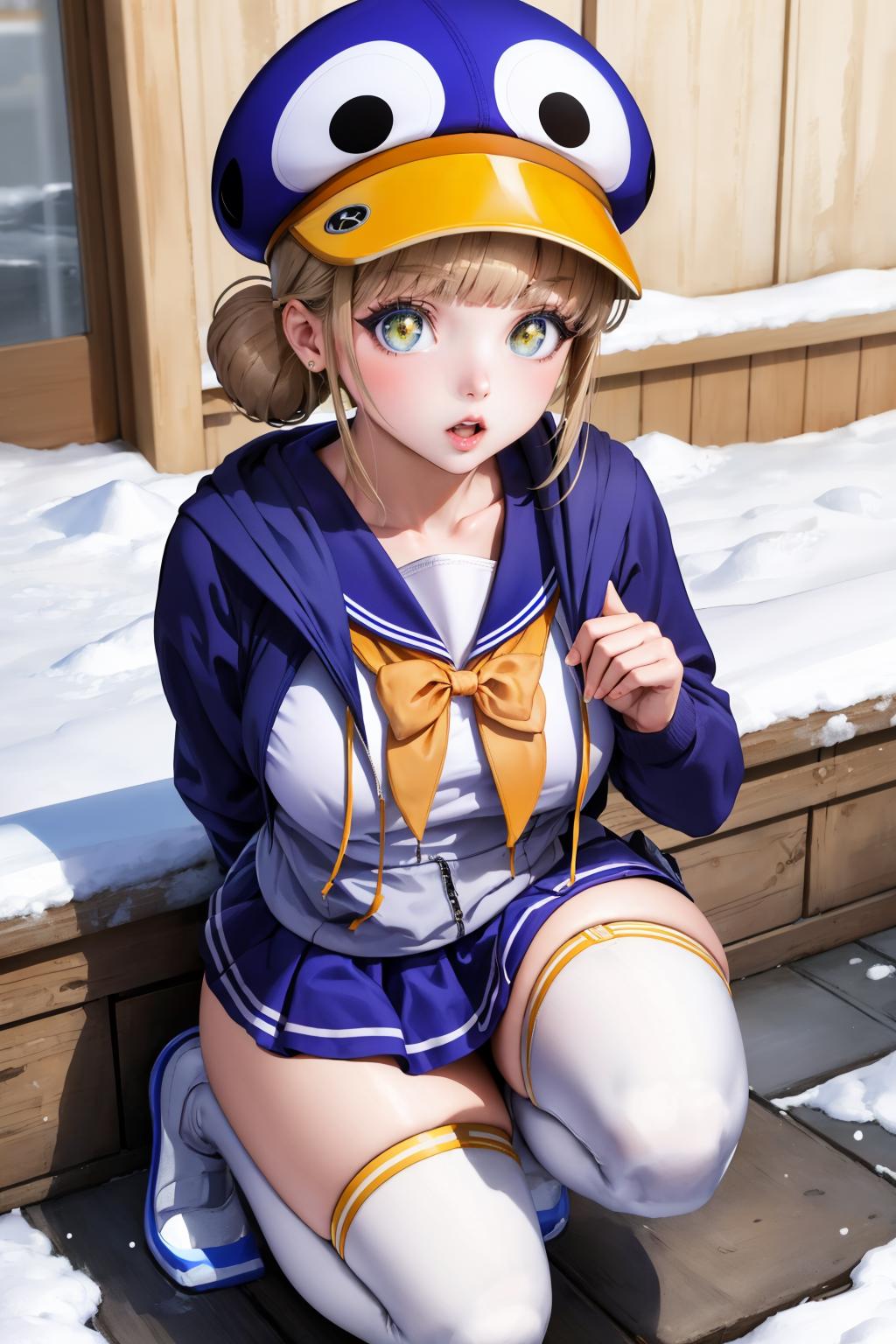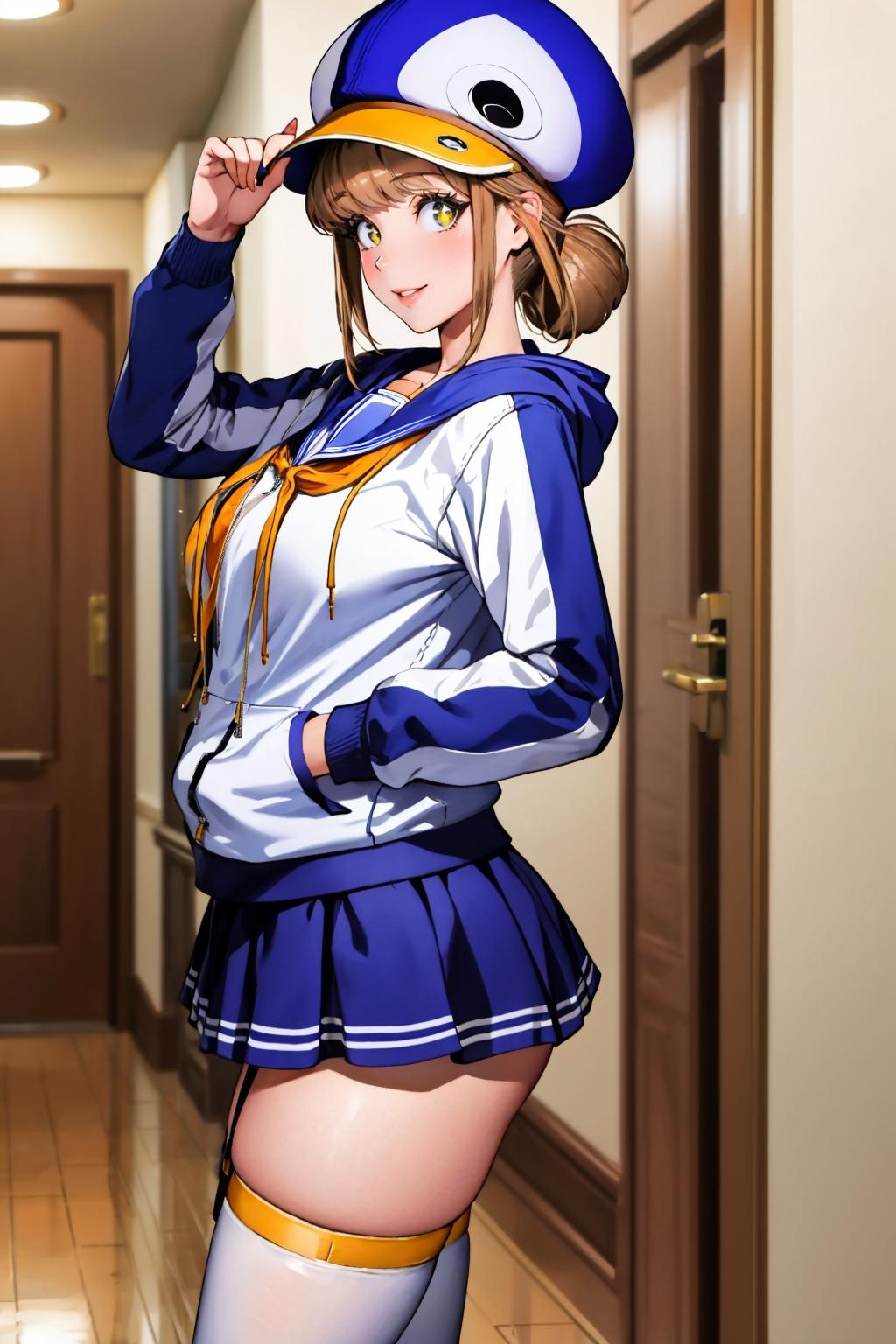 Add "pennovel, blue headwear, hoodie, sailor collar, white thighhighs, blue skirt" for her Penguin Holmes skin.