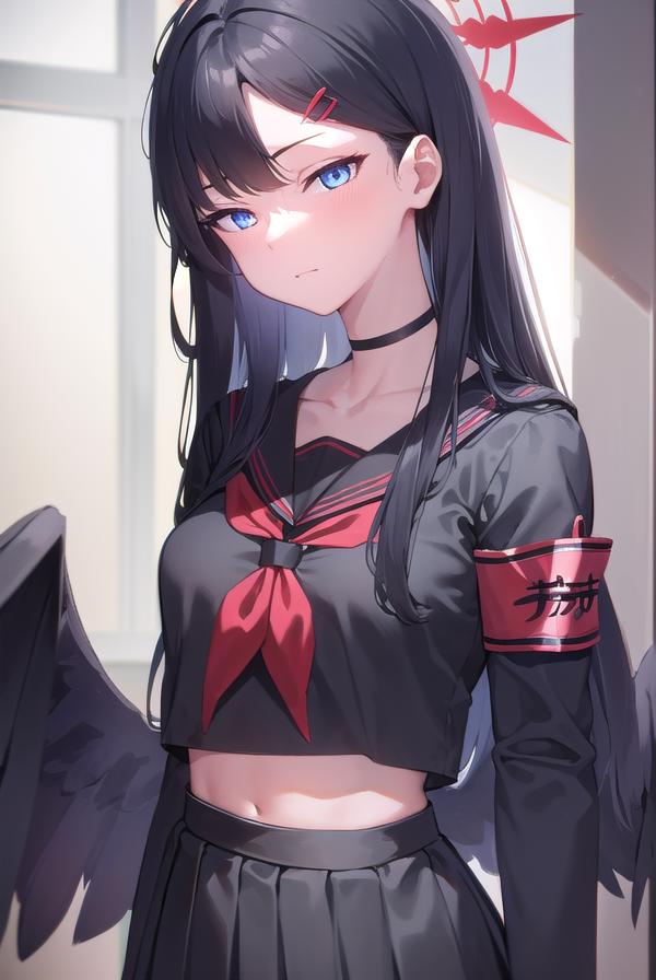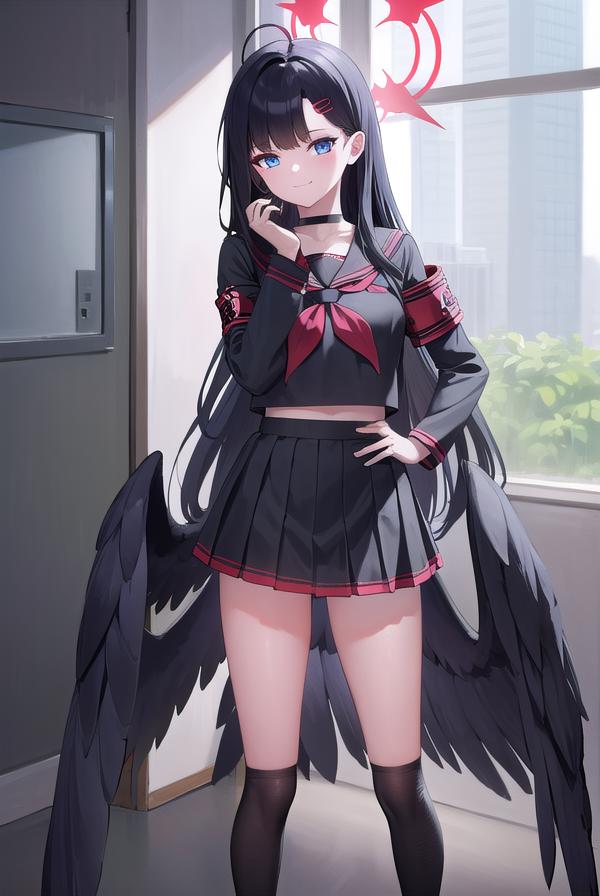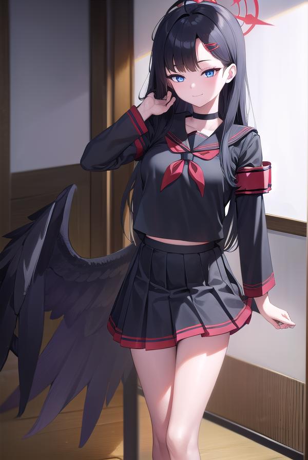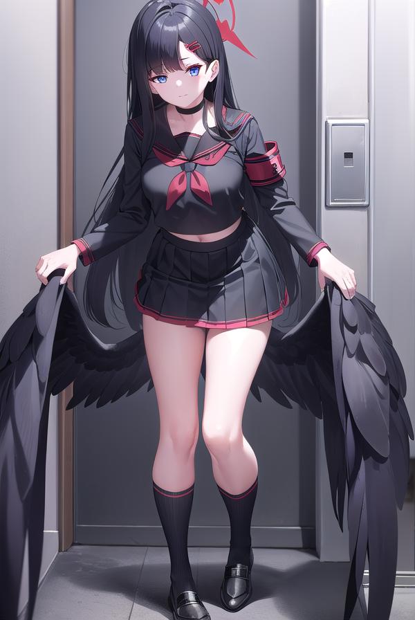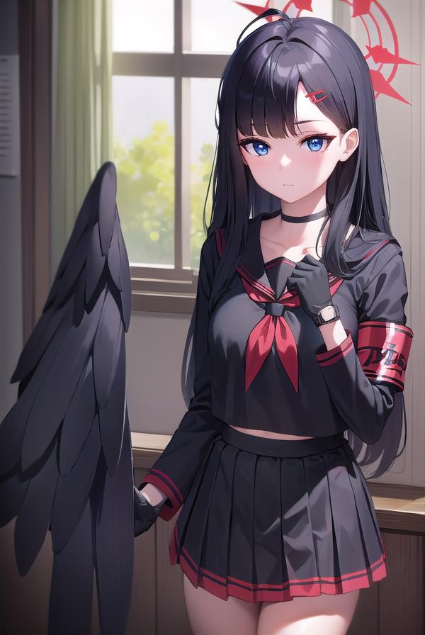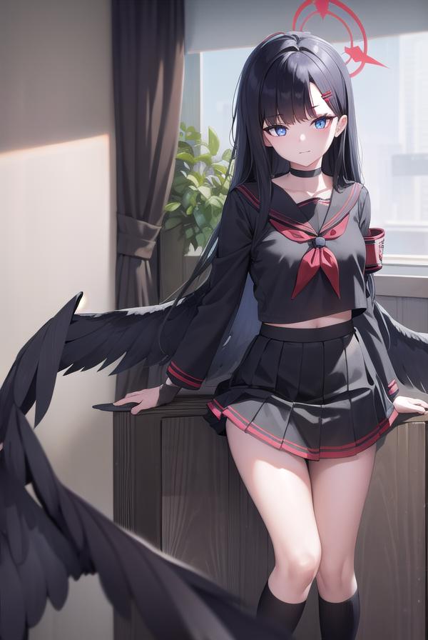 ichika nakamasa, ahoge, black hair, black wings, feathered wings, hair ornament, hairclip, halo, long hair, low wings, red halo, wings,