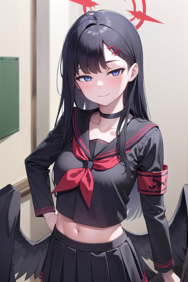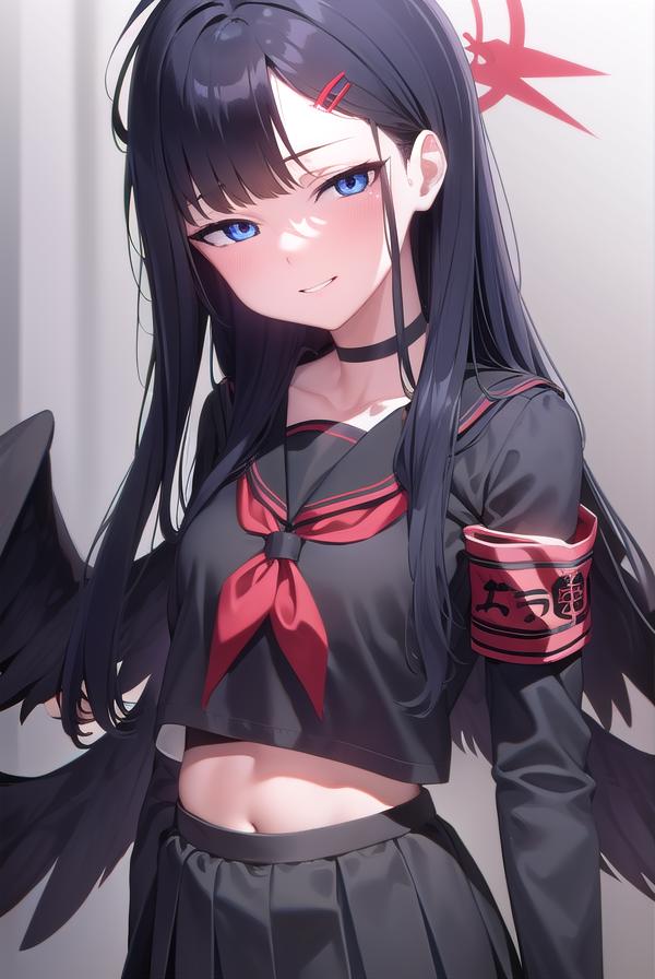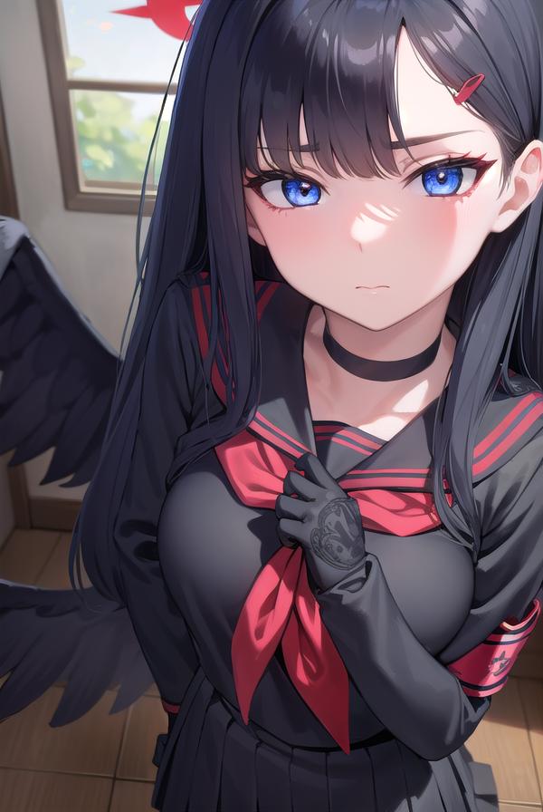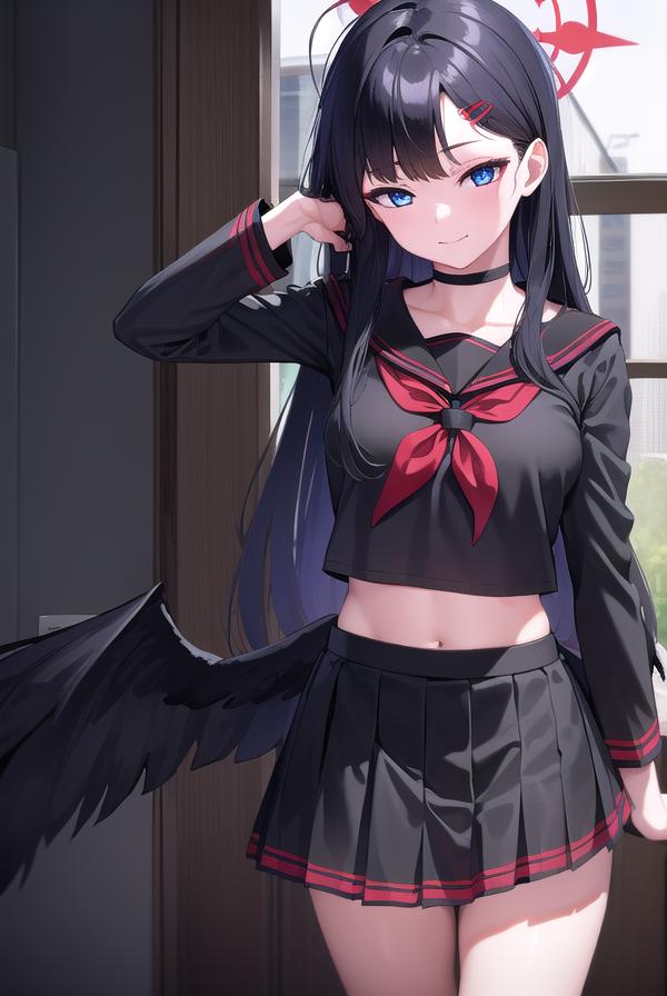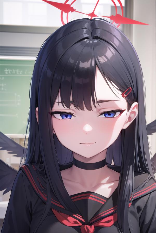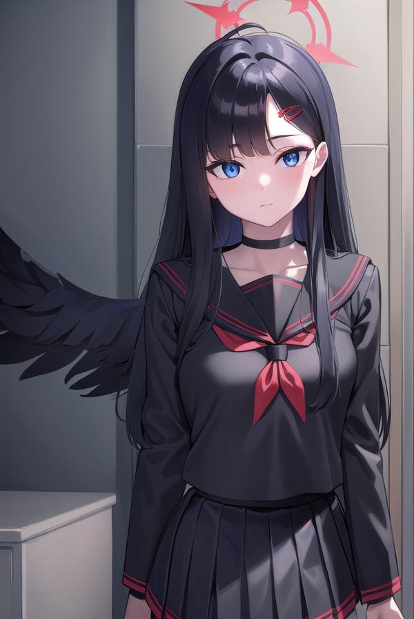 ichika nakamasa, ahoge, black hair, black wings, feathered wings, hair ornament, hairclip, halo, long hair, low wings, red halo, wings,