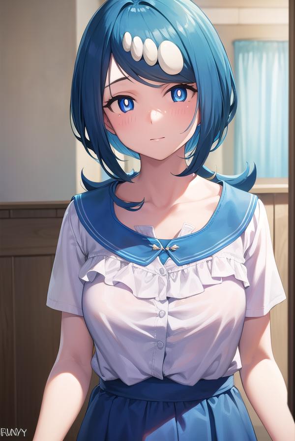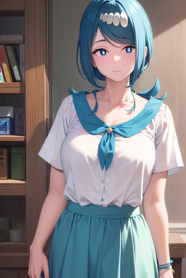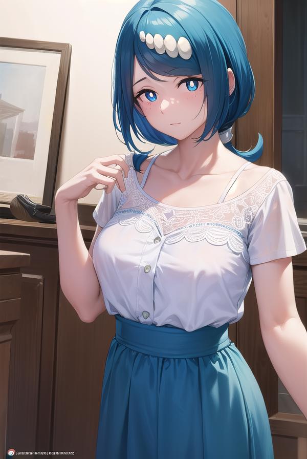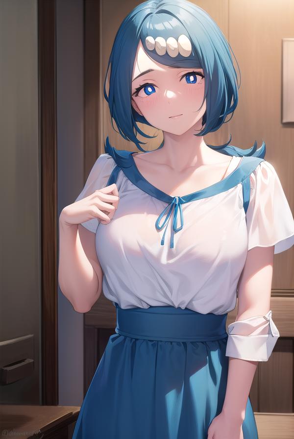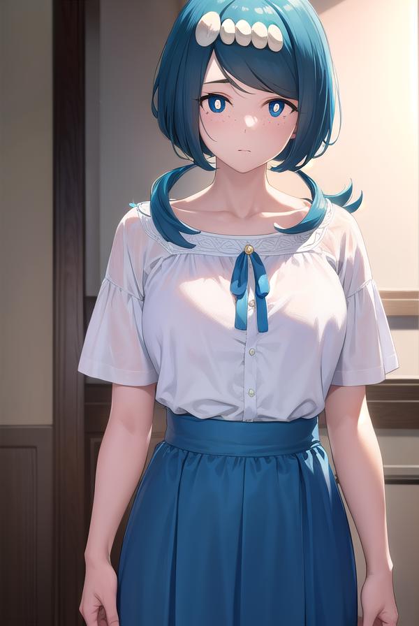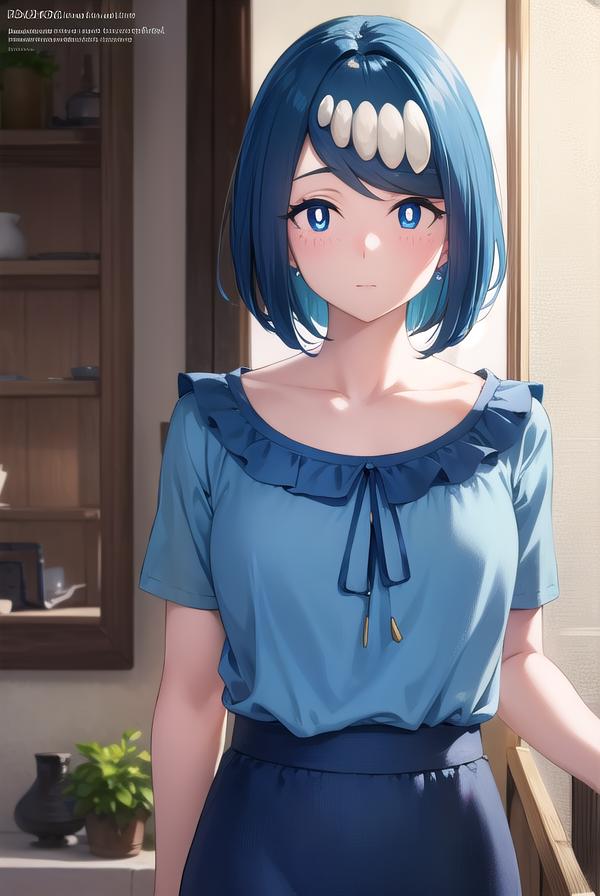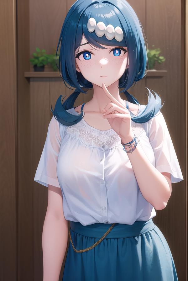 pokemonmotherlana, blue eyes, blue hair, freckles, hair ornament, long hair, swept bangs, (bright pupils:1.5),