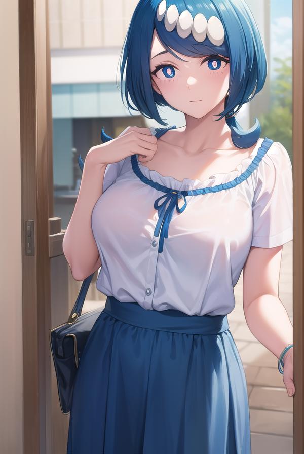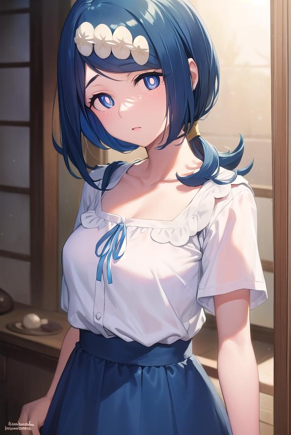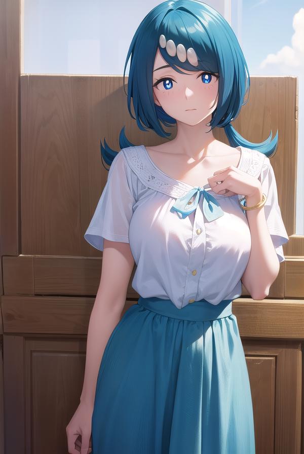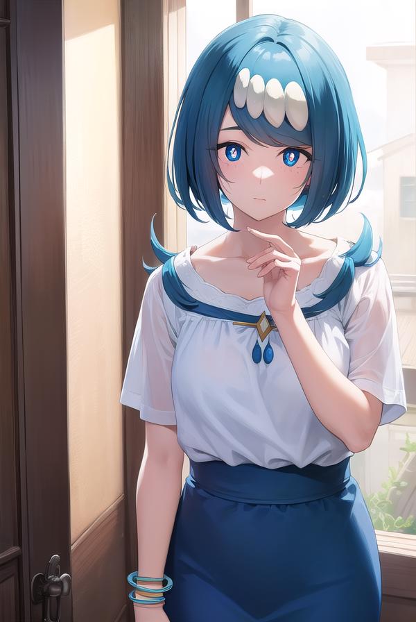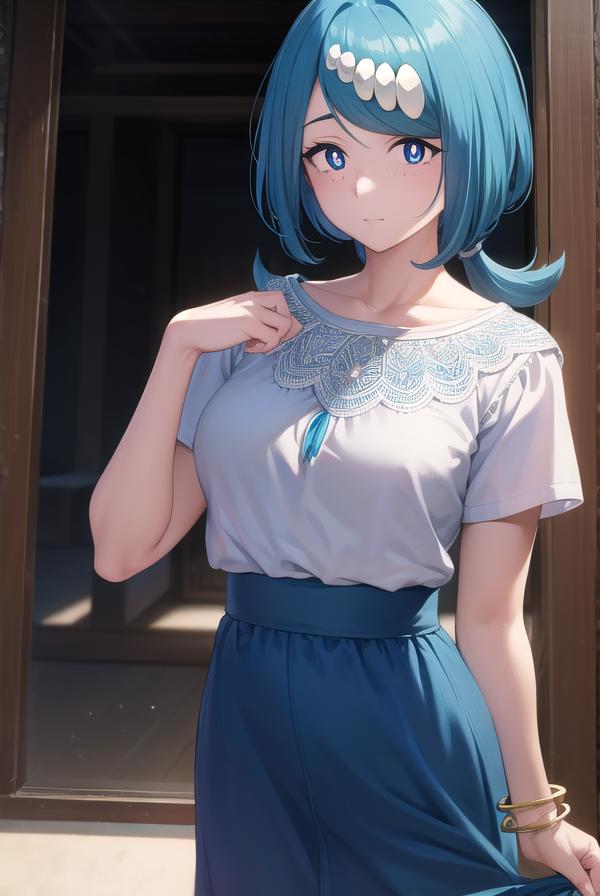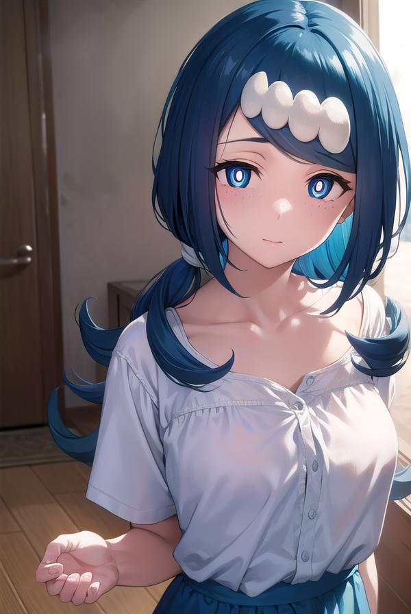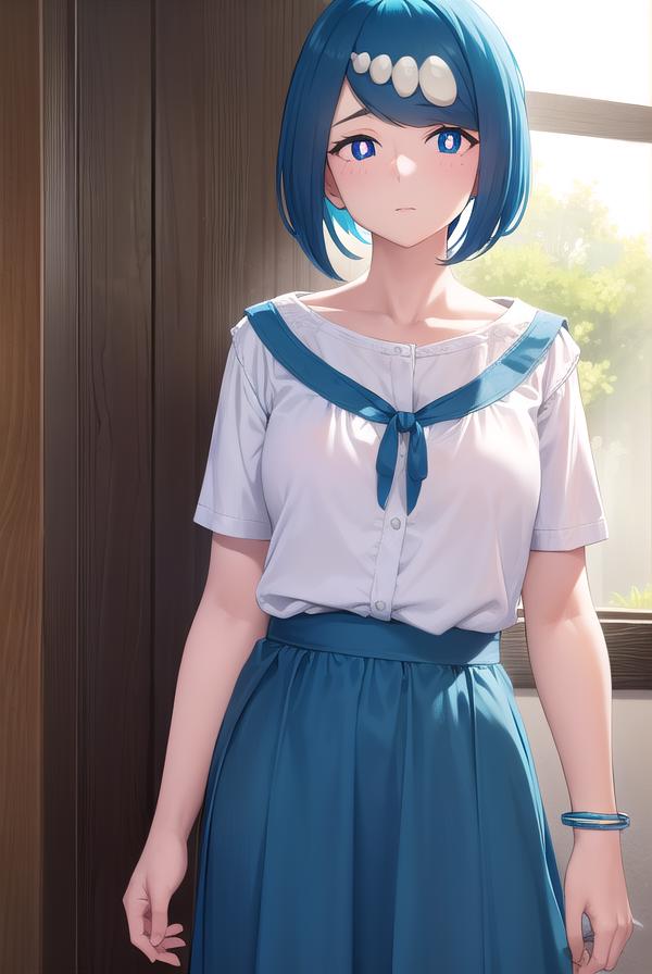 pokemonmotherlana, blue eyes, blue hair, freckles, hair ornament, long hair, swept bangs, (bright pupils:1.5),