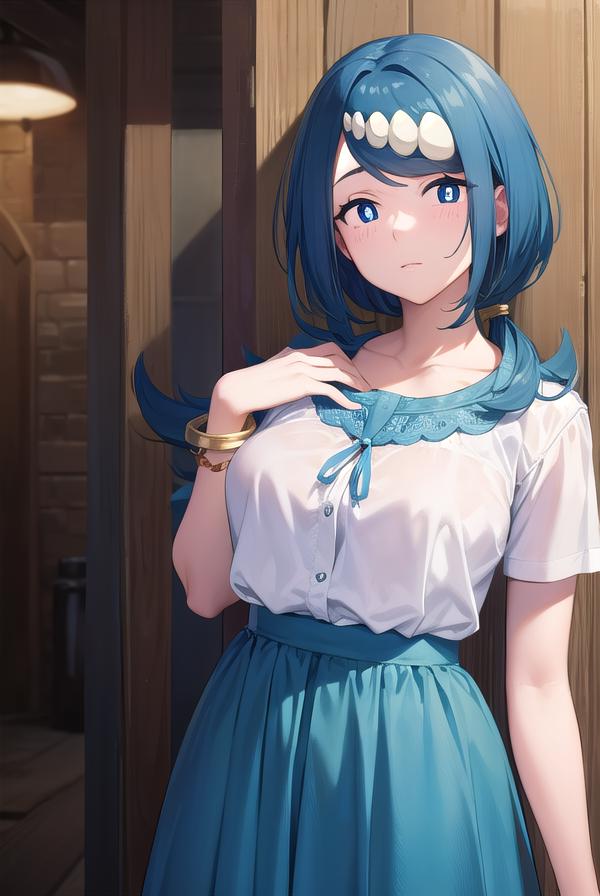 blouse, blue skirt, bracelet, collarbone, dress, jewelry, long skirt, shirt, short sleeves, skirt, white shirt,