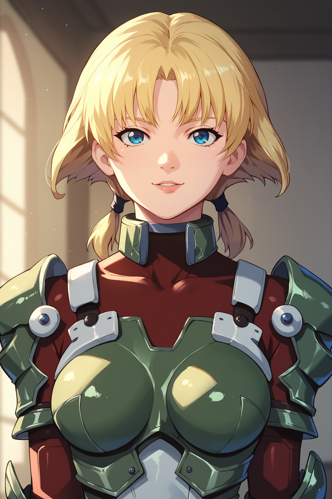 MarleneAngelBGXL, blue eyes, blonde hair, short hair, bangs, low twintails, medium breasts, green armor, shoulders armor, red bodysuit, green guantlets, black gloves, green knee pads, green boots