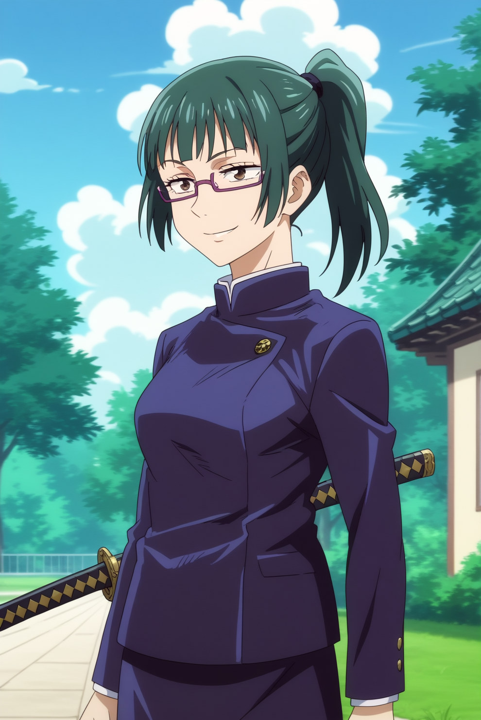 maki zenin,long hair,glasses,school uniform,ponytail,bangs,weapon,katana