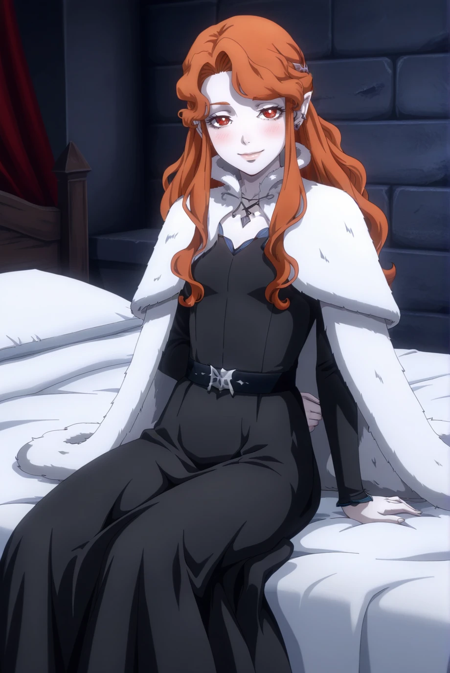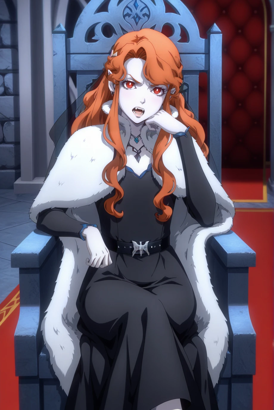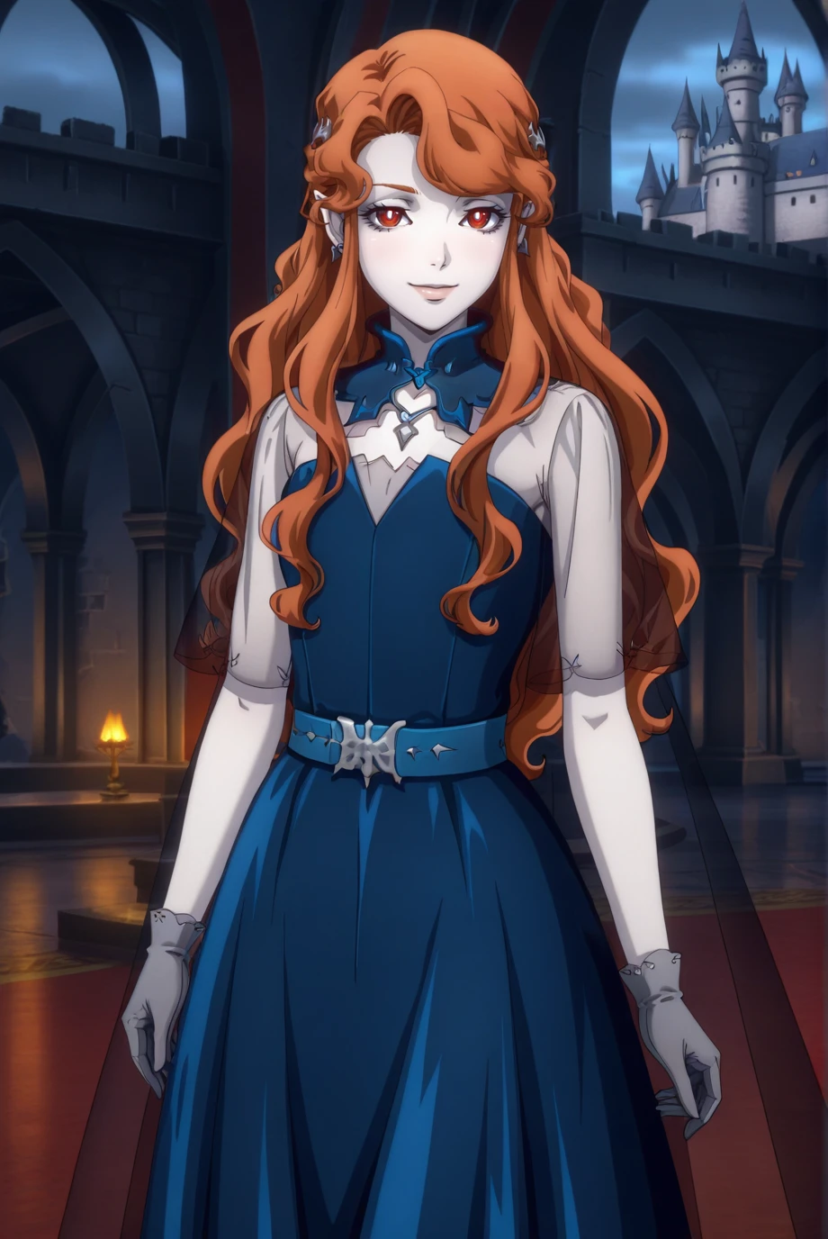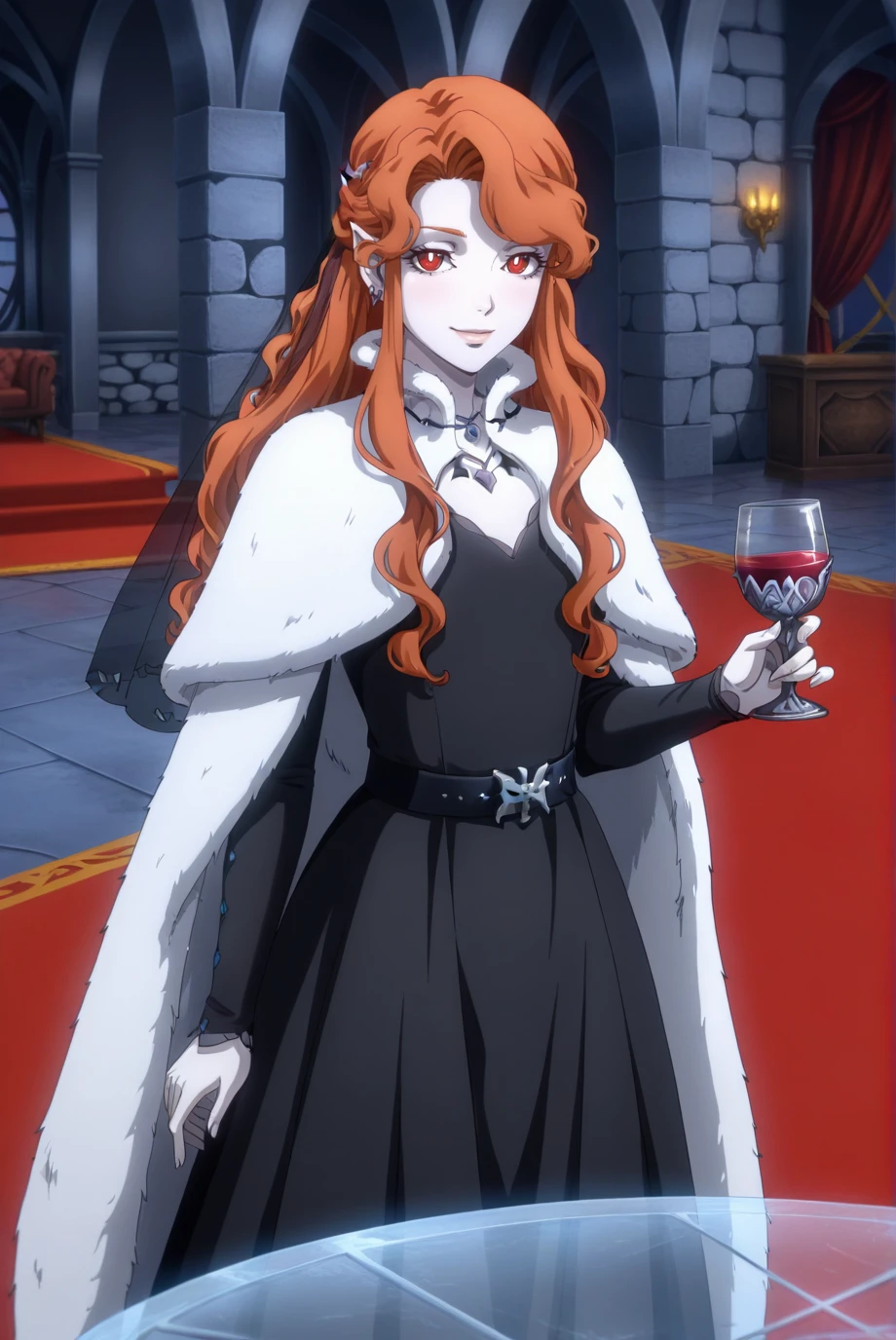 <lora:Lenore-IL-v1-08:0.9>, ChopioLenore, orange hair, long hair, wavy hair, sidelocks, asymmetrical bangs, half updo, eyelashes, lips, pointy ears, red eyes, bright pupils, looking at viewer, anime coloring, vampire, pale skin, hair ornament, earrings,