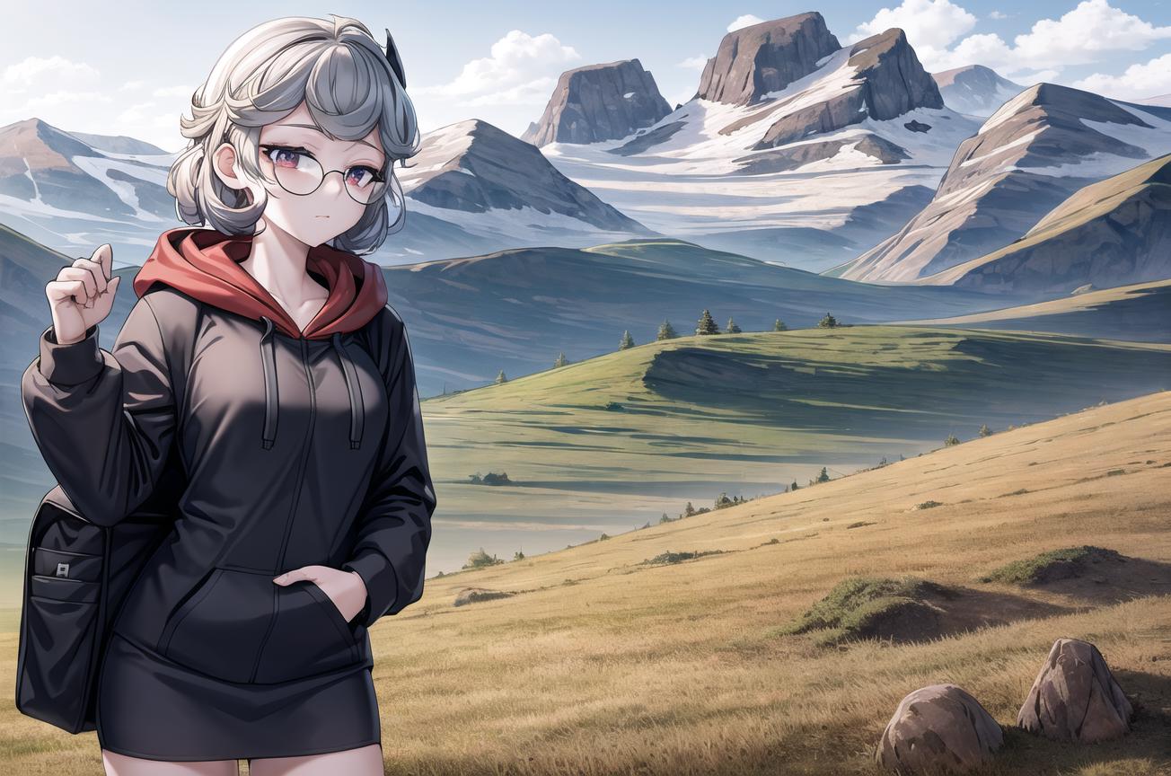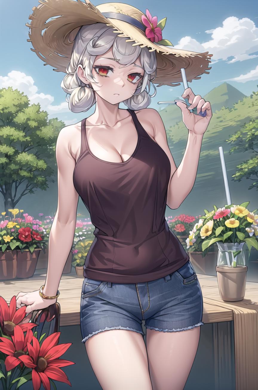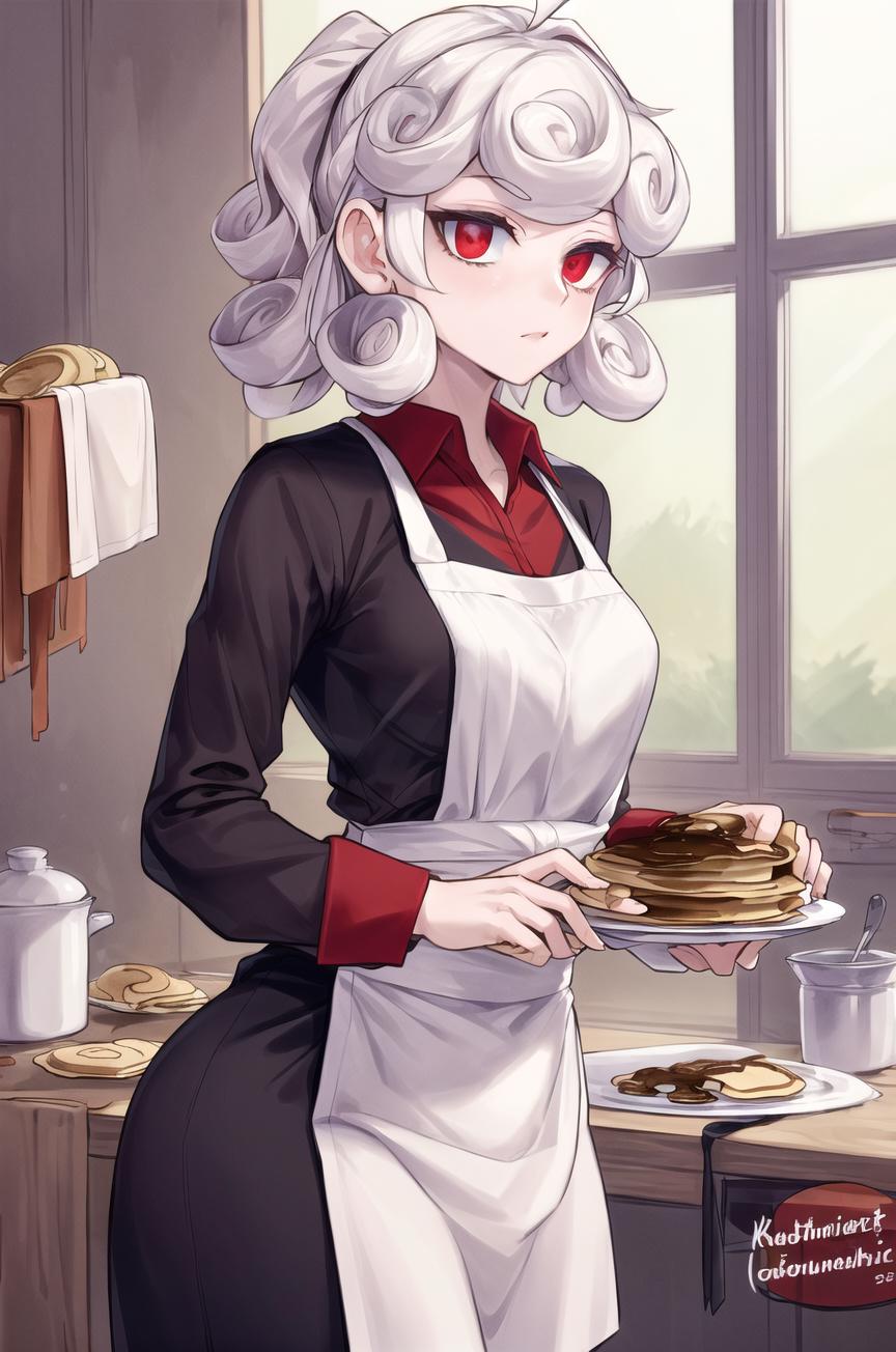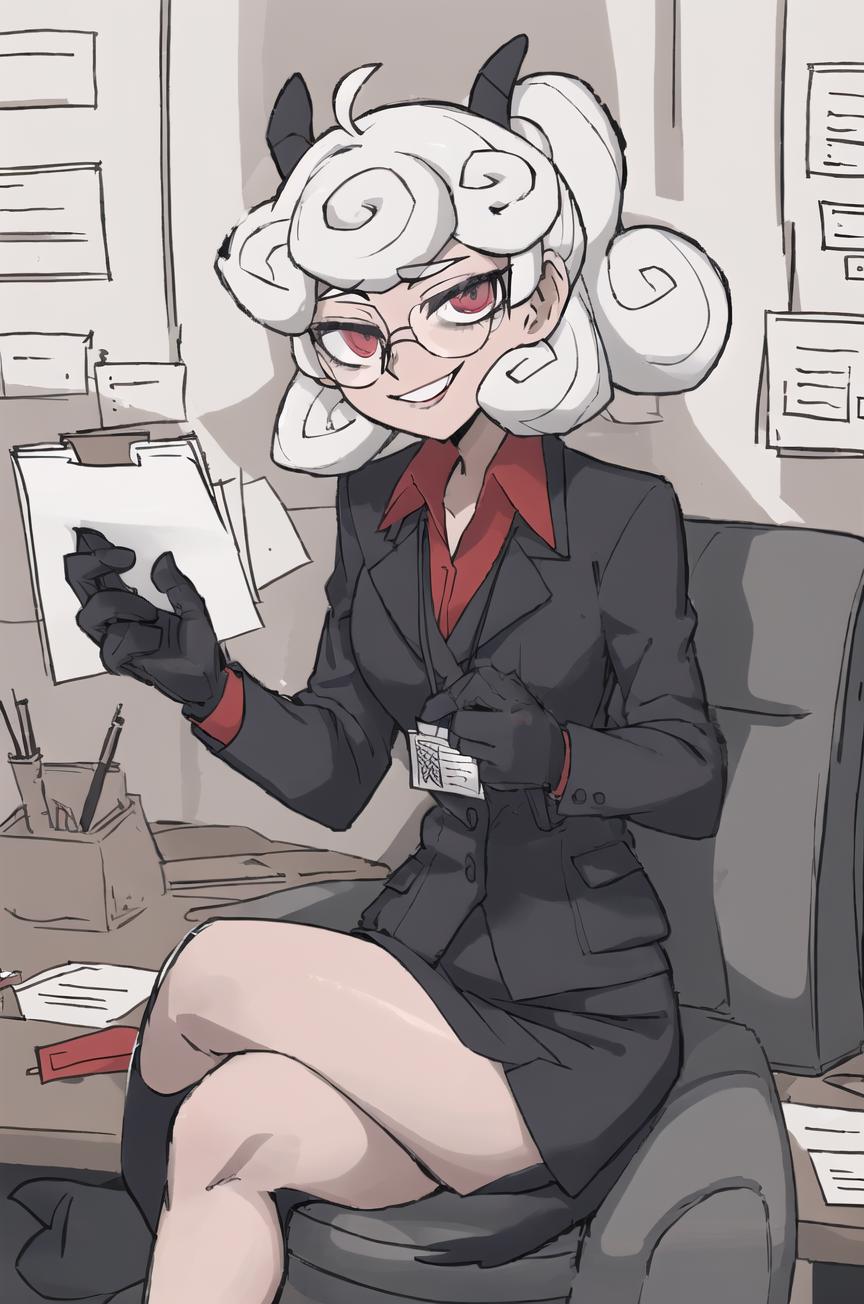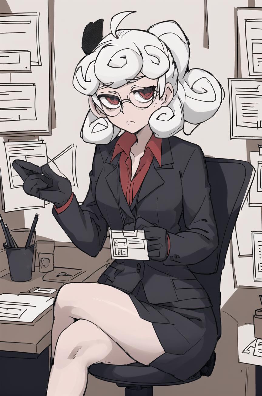 Pandemonika from video game helltaker. A bit overtrained imo. Sweet spot for settings at 0.6-0.8. 0.8 for office outfit. Closer to 0.6 for any other set of clothing. For lower values it's good to add "white hair" and "red eyes". As it might lose those details.