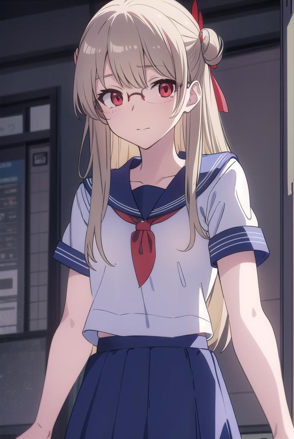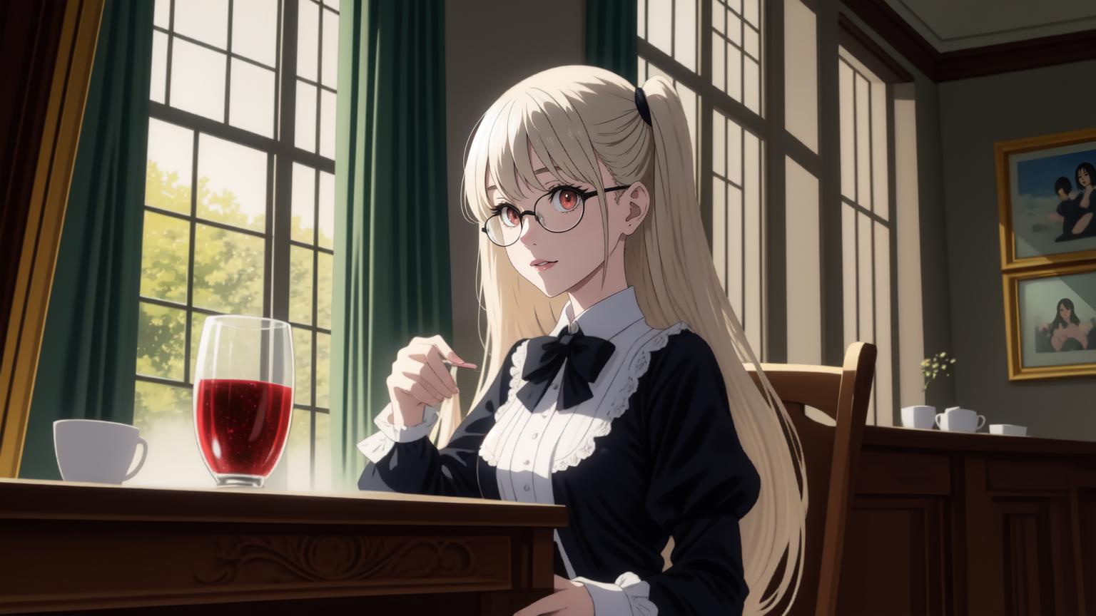 kotone sasaki, long hair, (red eyes:1.5), glasses, blonde hair, hair pin,