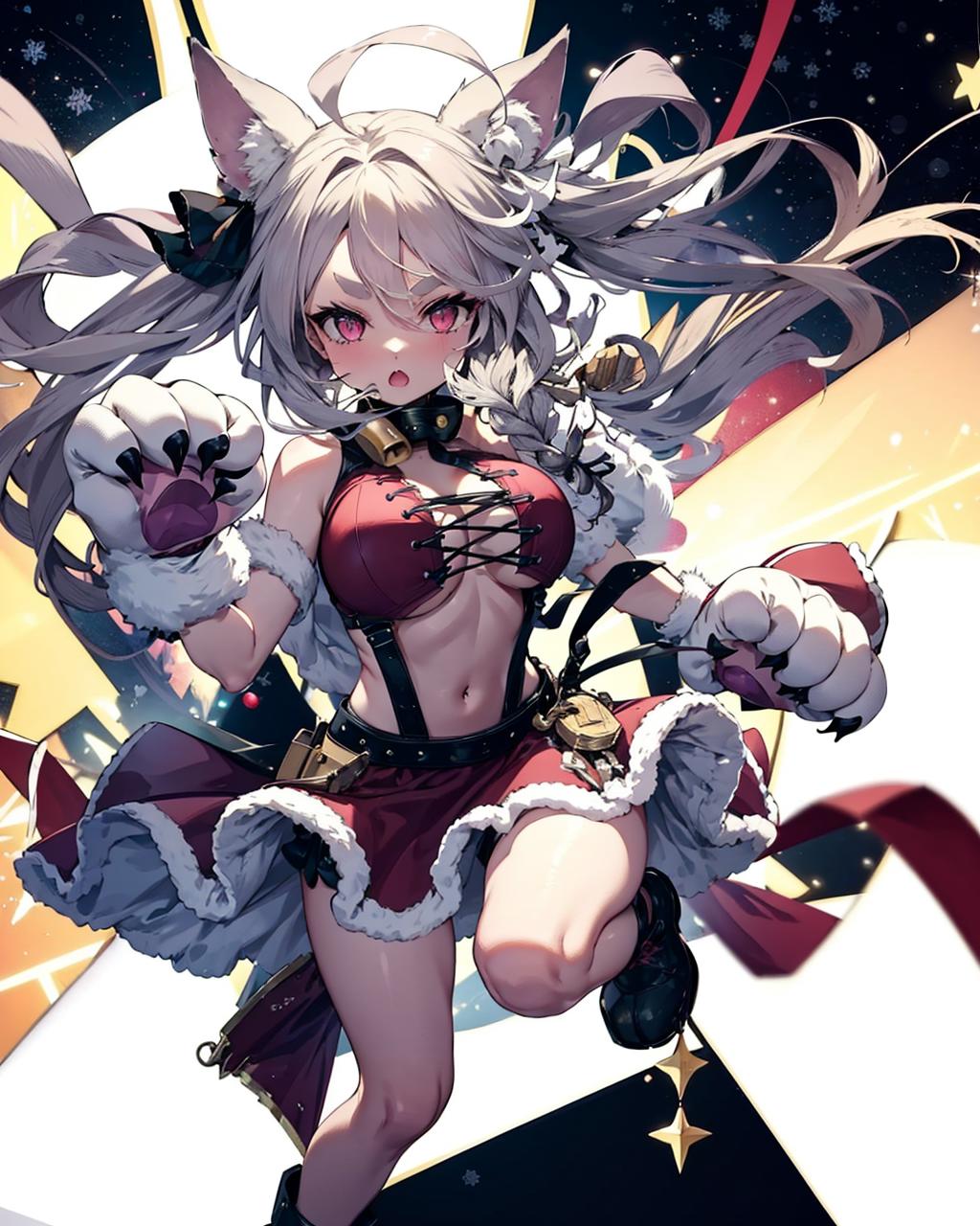 Full outfit: poixmas, midriff, animal_hands, paw_gloves, red_skirt