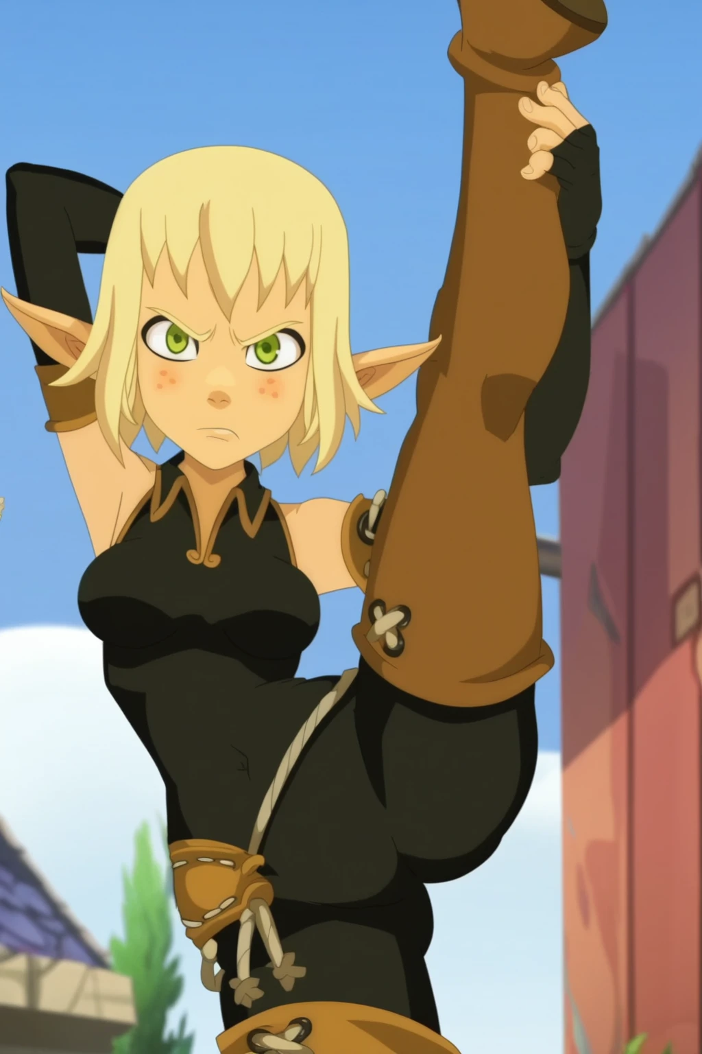 Evangelyne, pointy ears, green eyes, freckles, blonde hair,