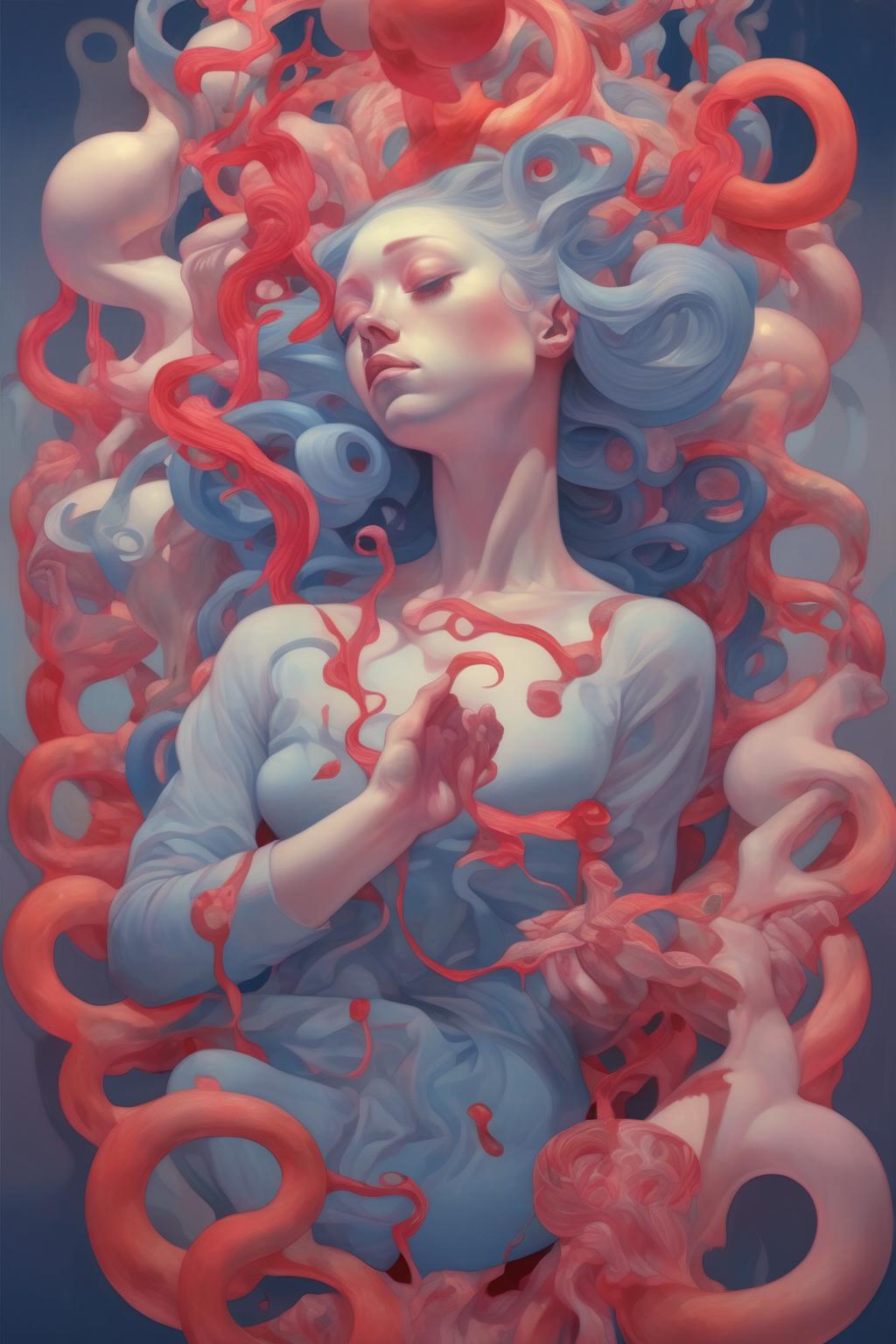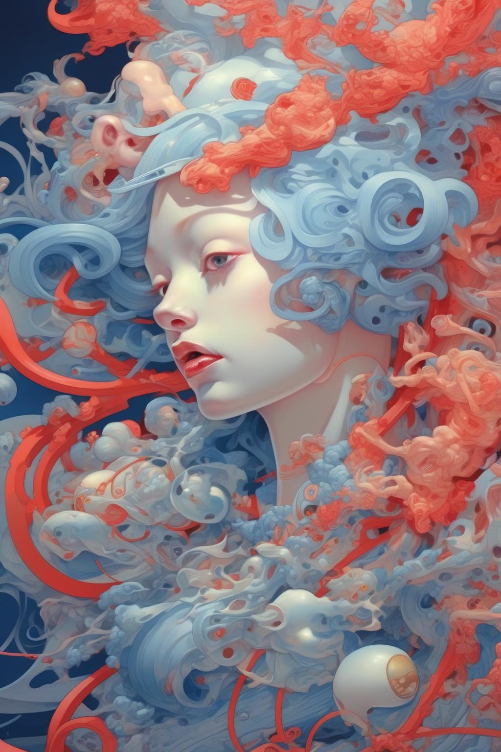 His style can be described as ethereal, fantastical, and highly imaginative. Jean's artwork often features a blend of organic and surreal elements, combining human figures, animals, and intricate patterns into visually captivating compositions.