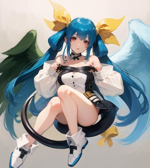 ribbon, hair ribbon, asymmetrical wings, wings, choker, tail, yellow ribbon, thighhighs, belt, thigh strap