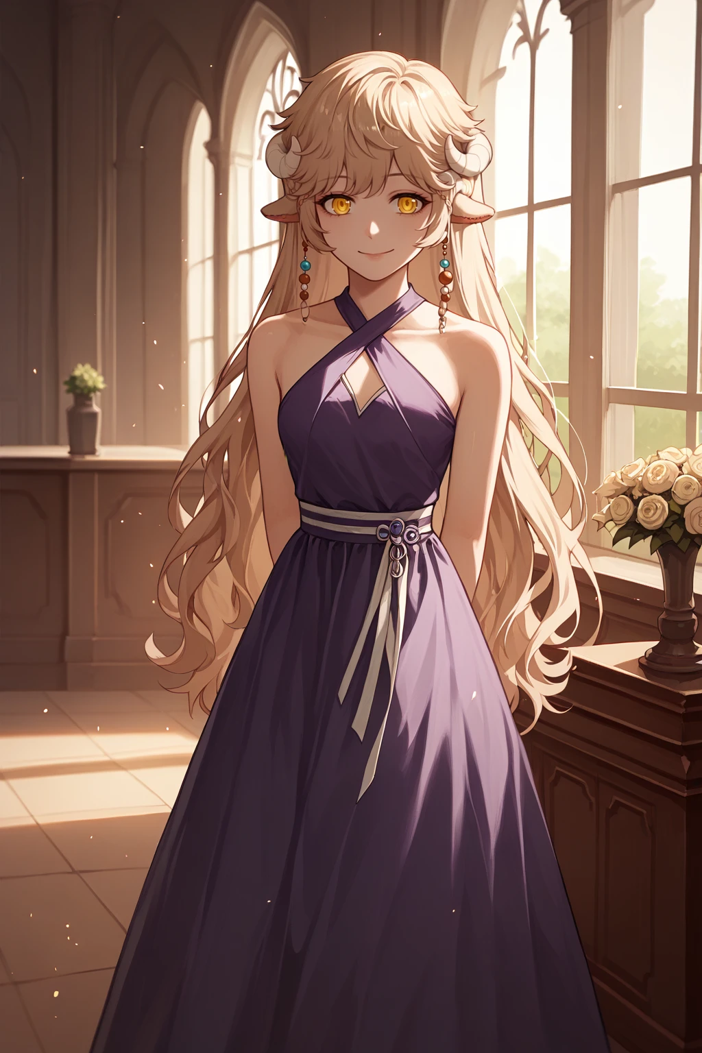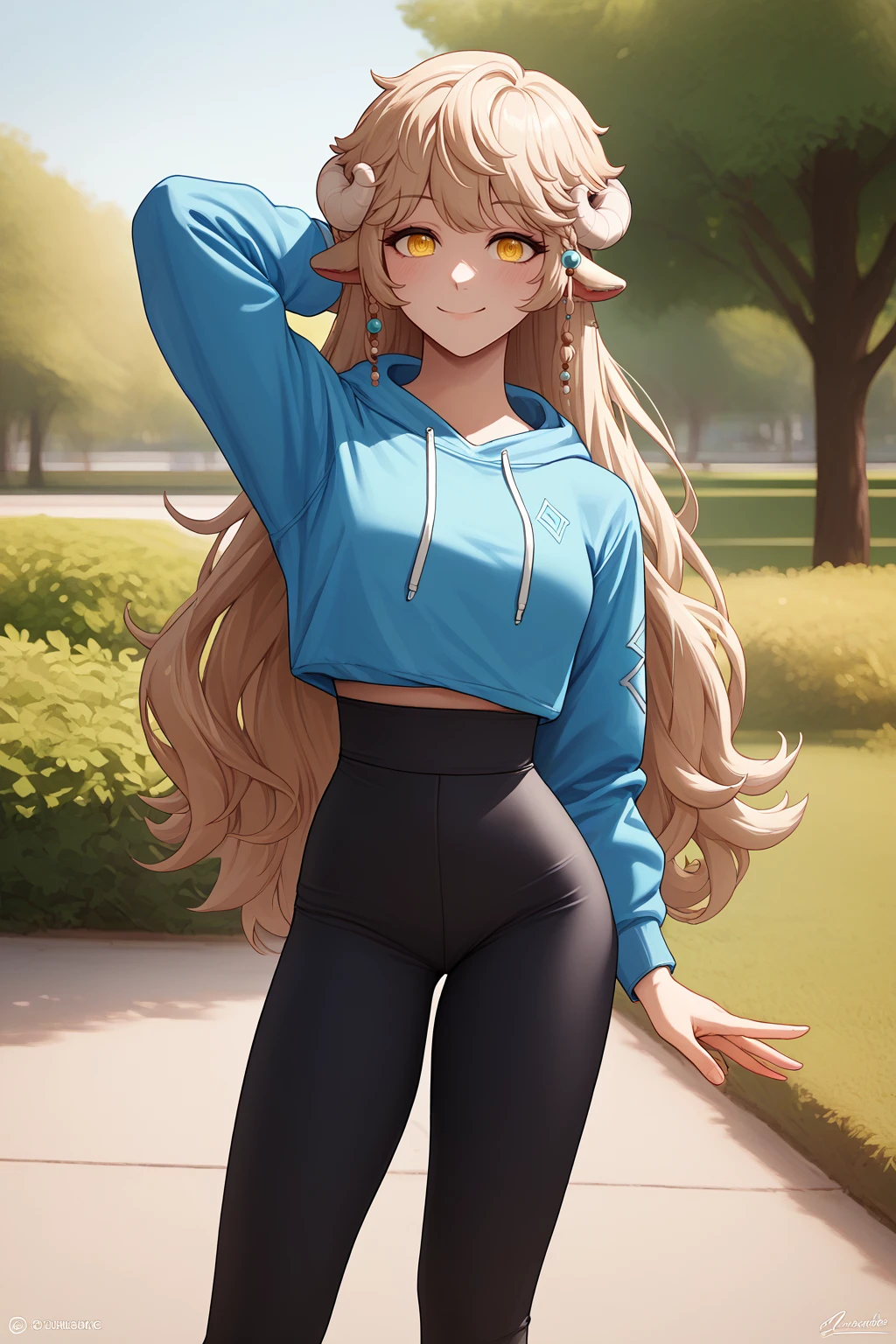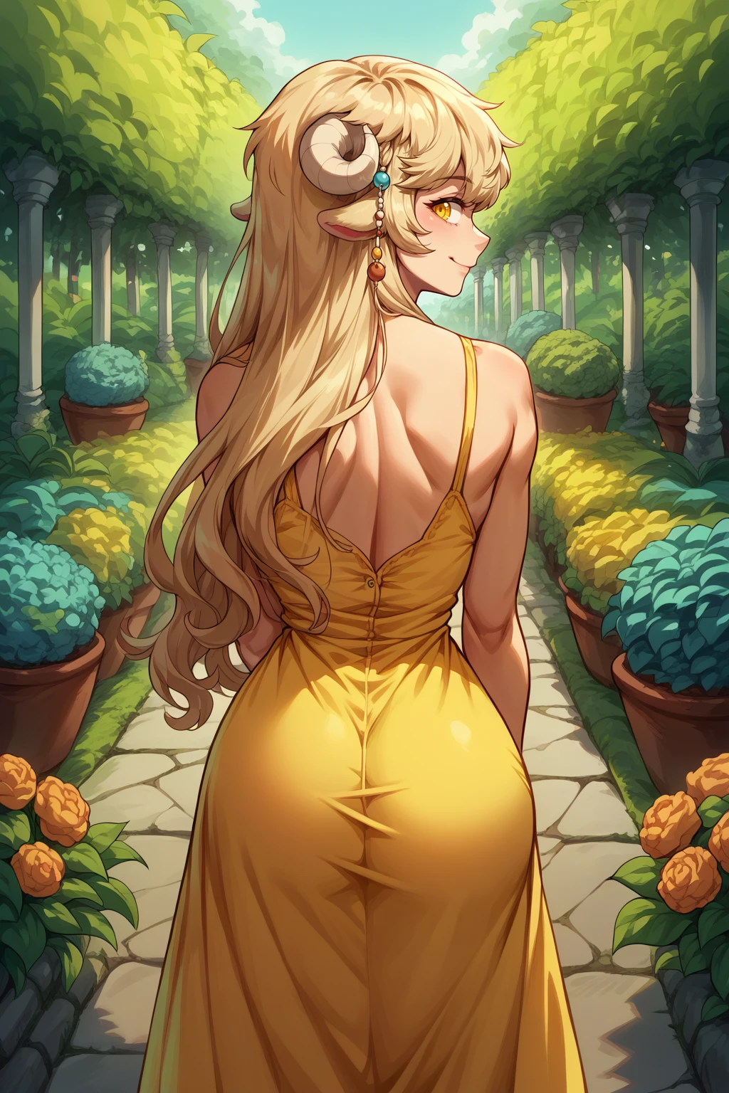 Main prompts: NSLaraMisc, blonde hair, long hair, yellow eyes, curled horns, animal ears, hair beads