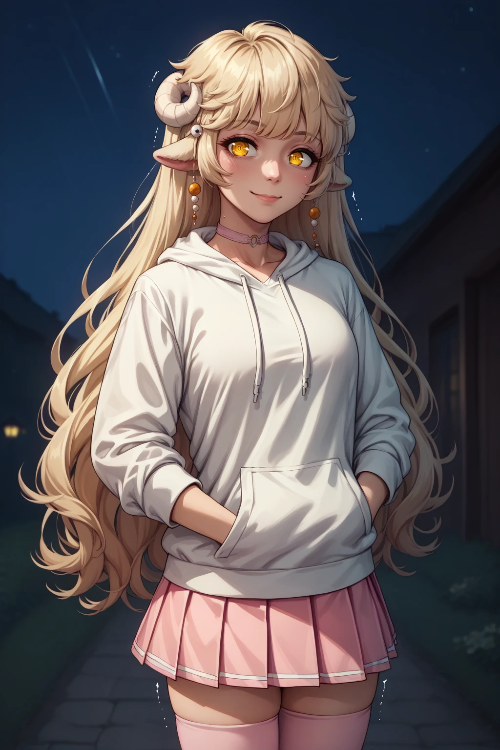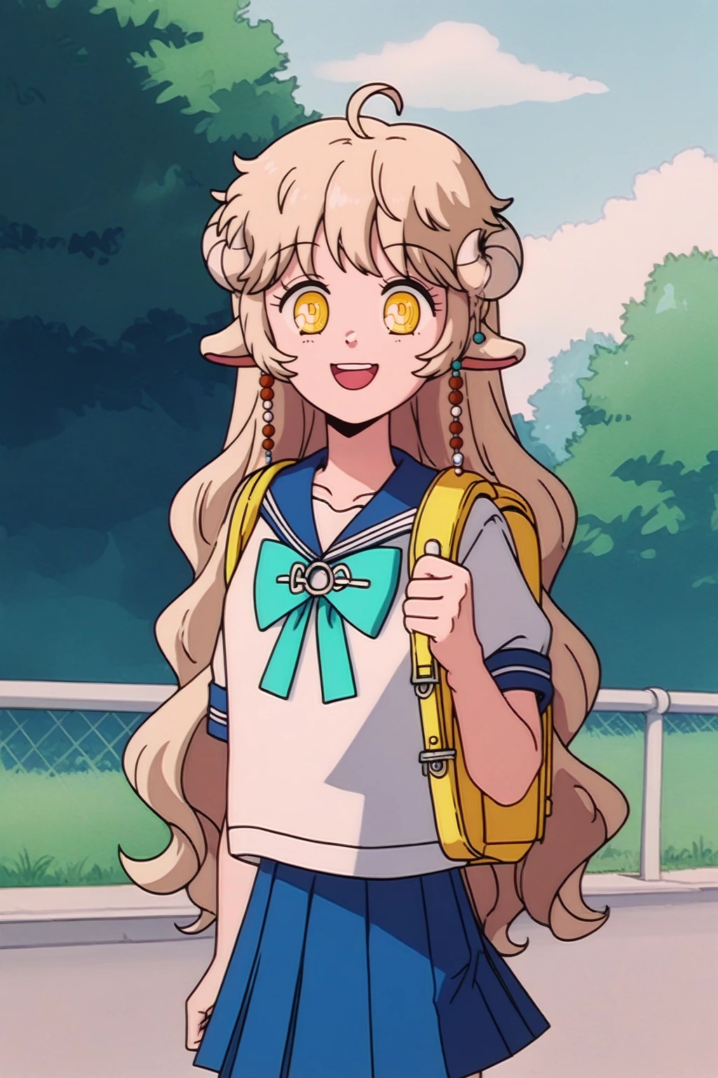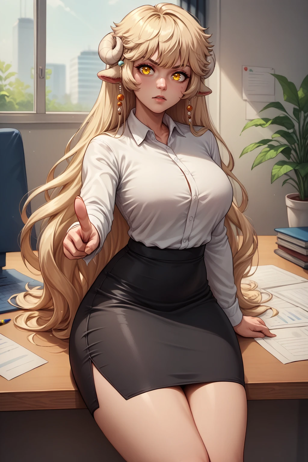 Main prompts: NSLaraMisc, blonde hair, long hair, yellow eyes, curled horns, animal ears, hair beads