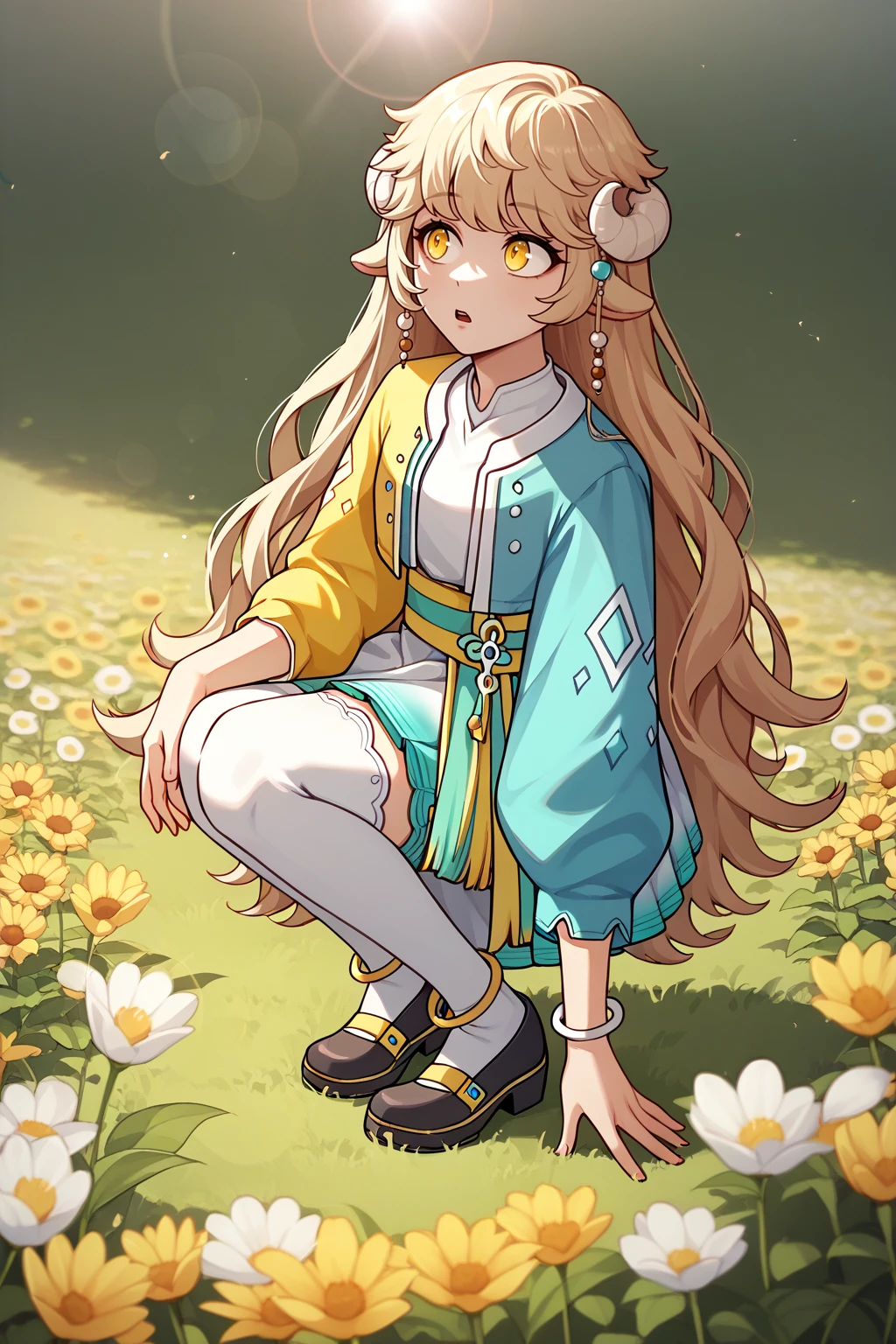 For her main outfit use: NSLaraBase, blonde hair, long hair, yellow eyes, curled horns, animal ears, hair beads, multicolored clothes, anklet, white thighhighs, white bloomers, frilled dress, sash, open jacket, two-tone jacket, cropped jacket, long sleeves, mismatched sleeves, bracelet