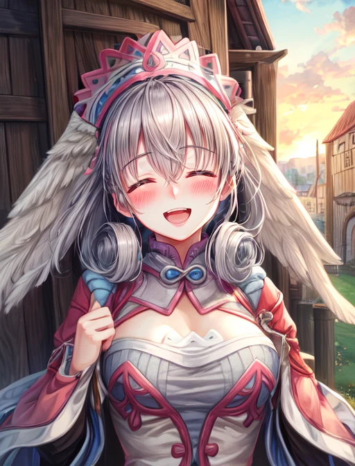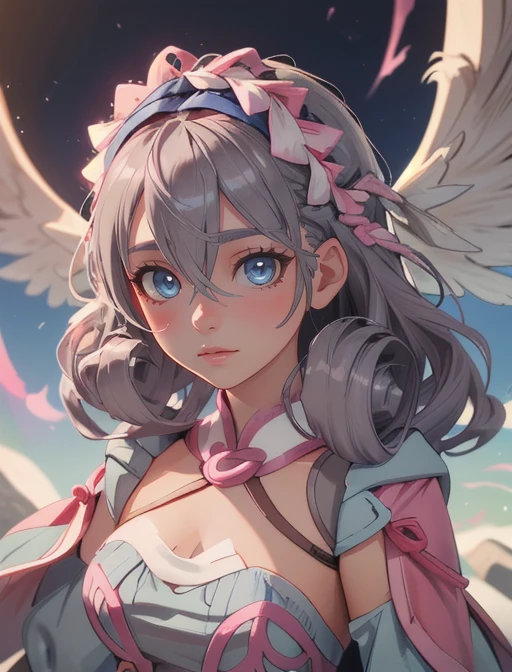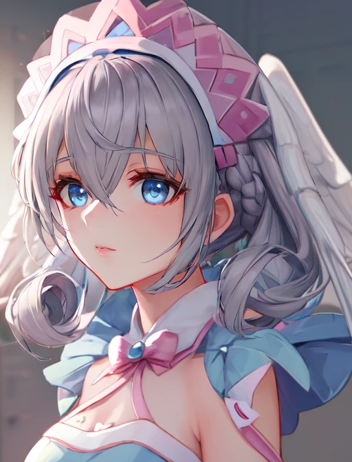 Additional words that may help: blue eyes, head wings, hair between eyes, grey hair