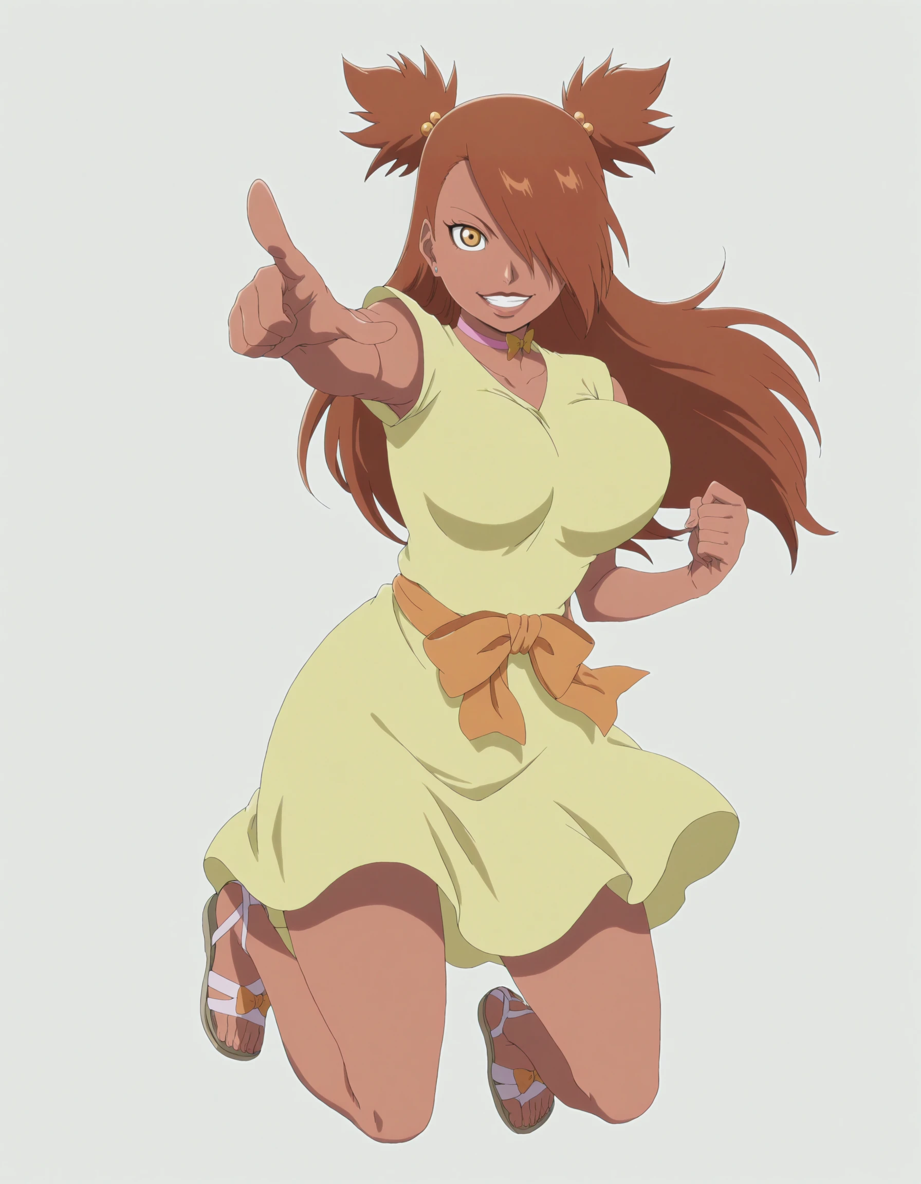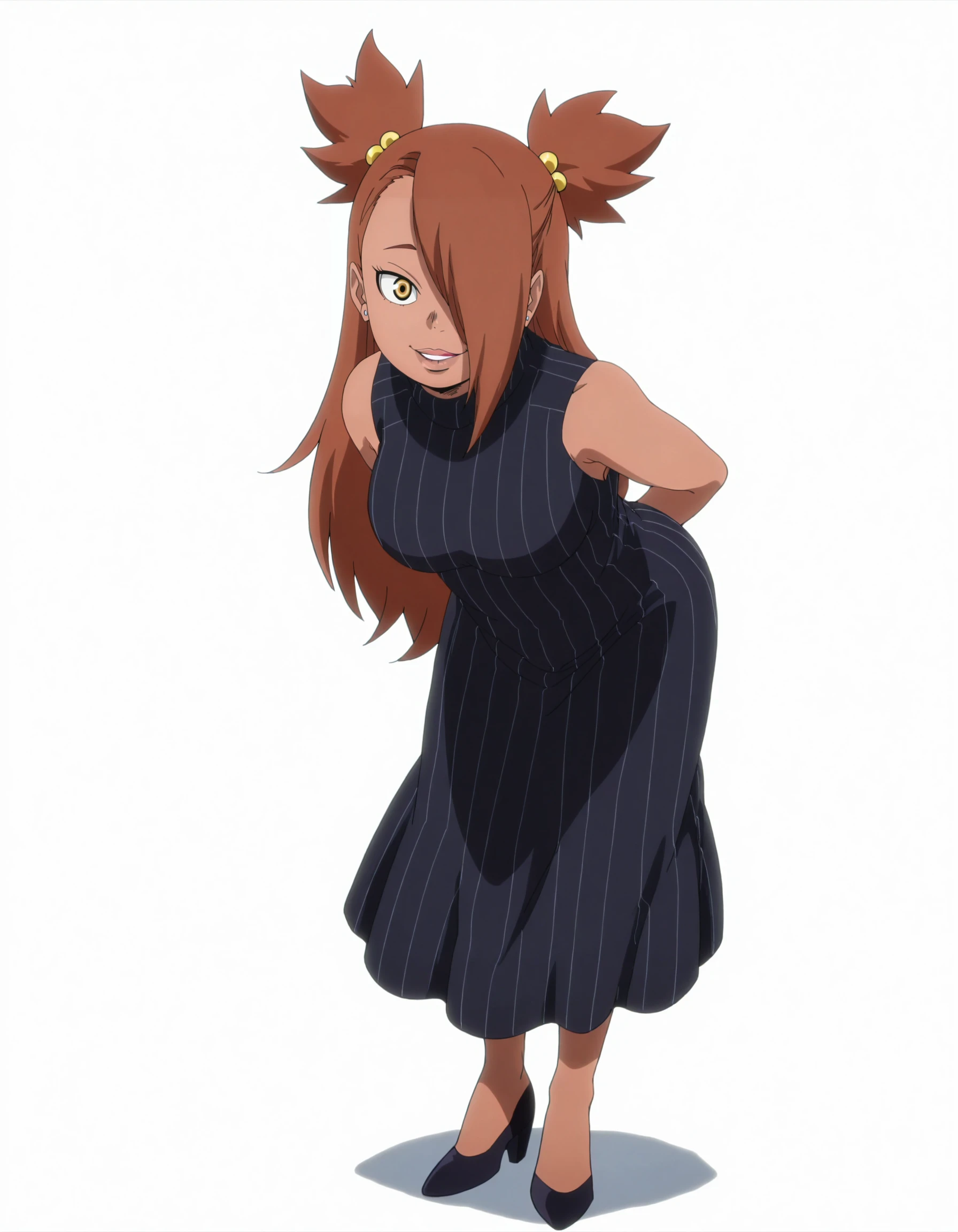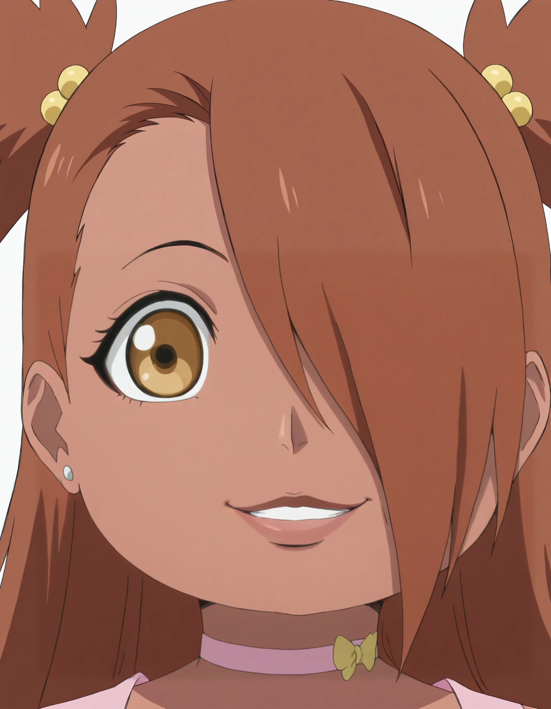 ch0ch0, 1girl, dark-skinned female, hair_bobbles, hair covering one eye, earring