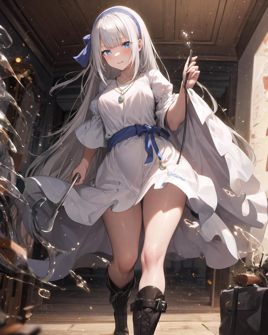 mylene_rafa_holfort,sliver hair,long hair,blue hairband,hair_behind_ear,blue eyes,white long_dress,pendant,boot,