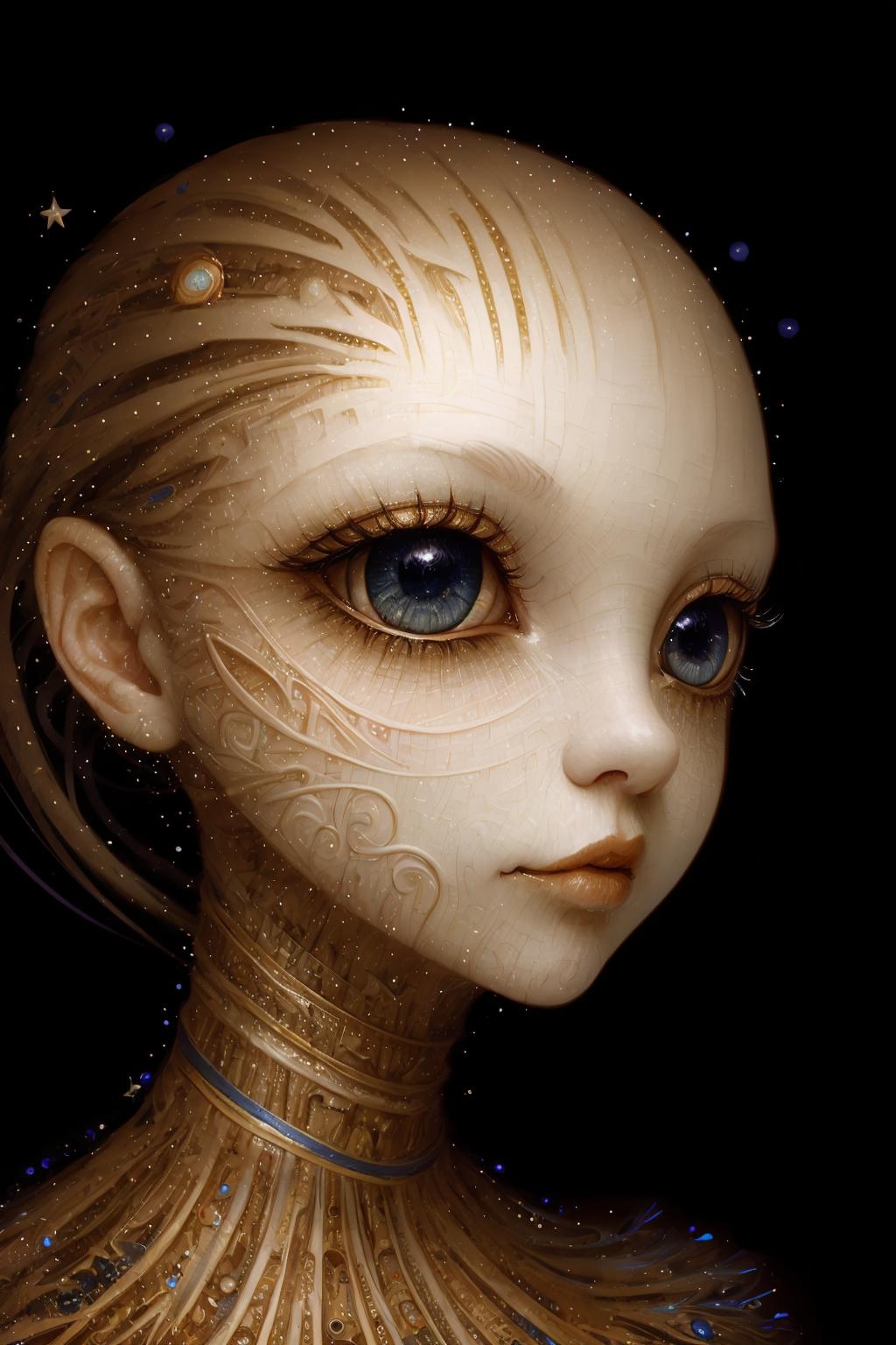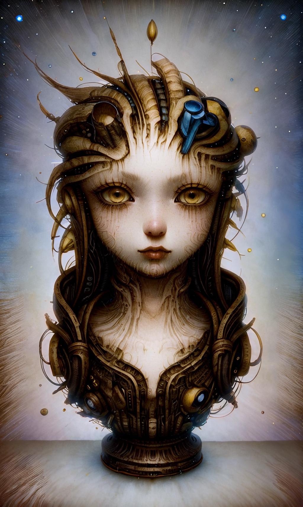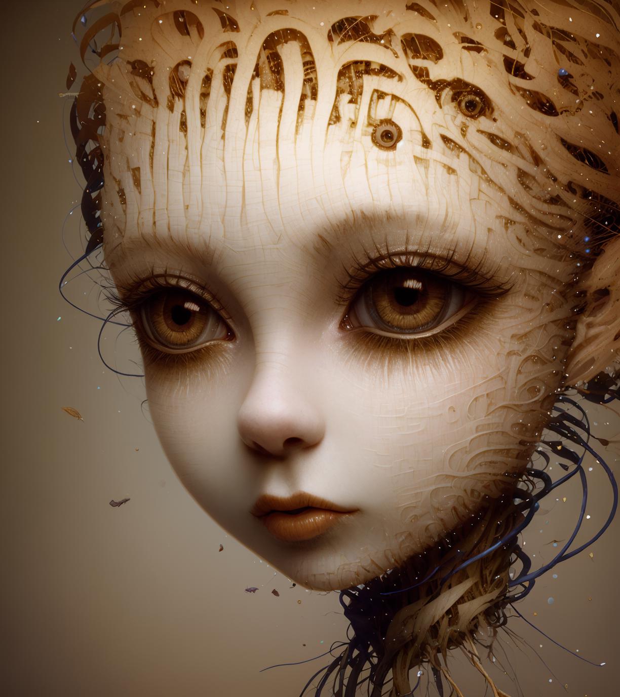 LoRA for SD1.5 trained with CivitAI on 120 (60 originals + 60 mirrored) 680x680 surrealistic mostly female (sometimes doll, android, unisex) portraits in style of Naoto Hattori with manually fixed BLIP2 captions.