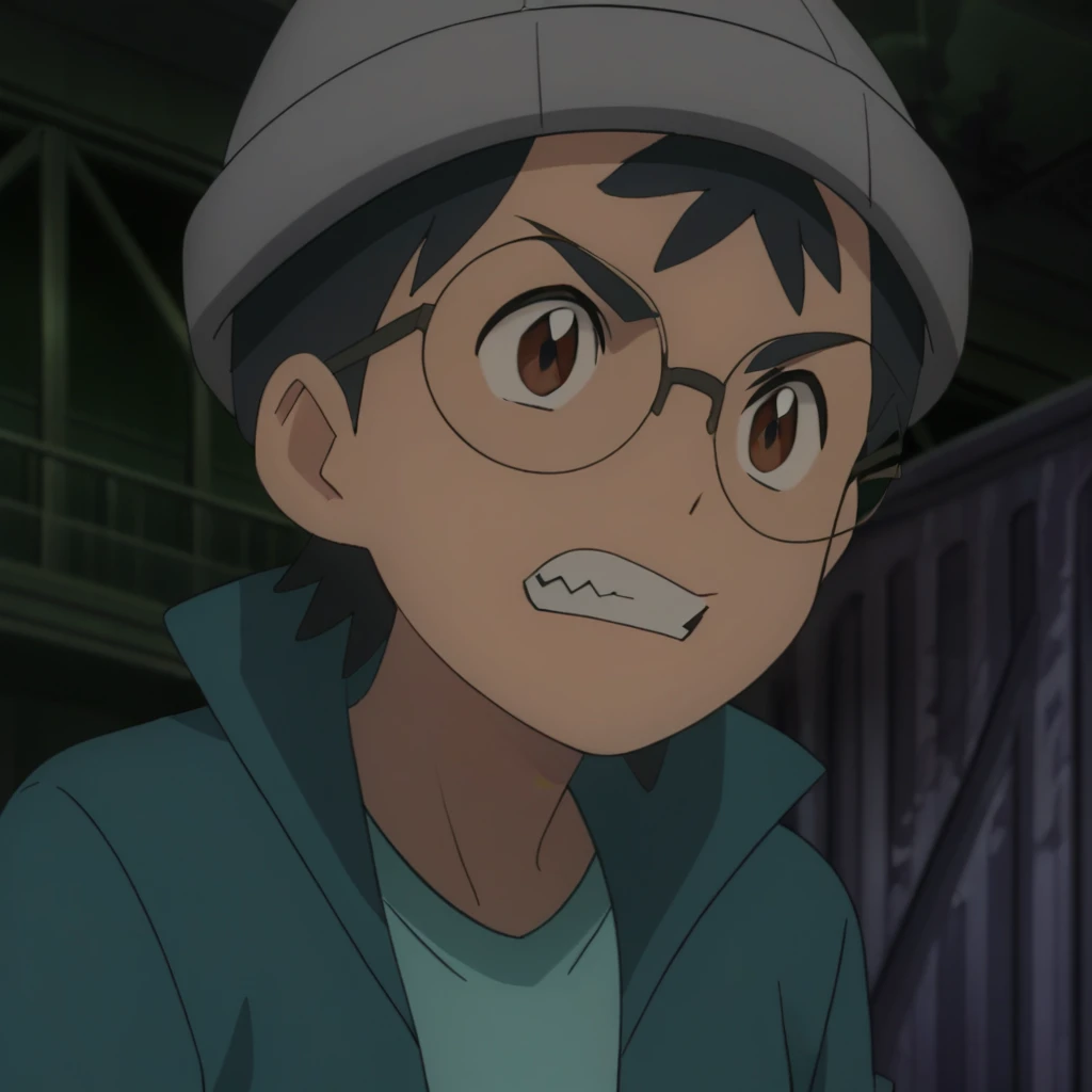 Prompts: male, dark teal hair, beanie, brown eyes, glasses, turquoise undershirt, jacket, long sleeves, , tan pants, blue footwear, holding poke ball, poke ball (basic), indoors (stairs), ship interior