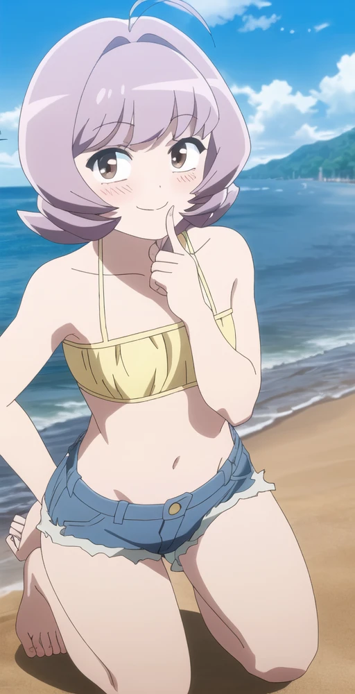Swimsuit, "yellow ?????? top, denim shorts,"