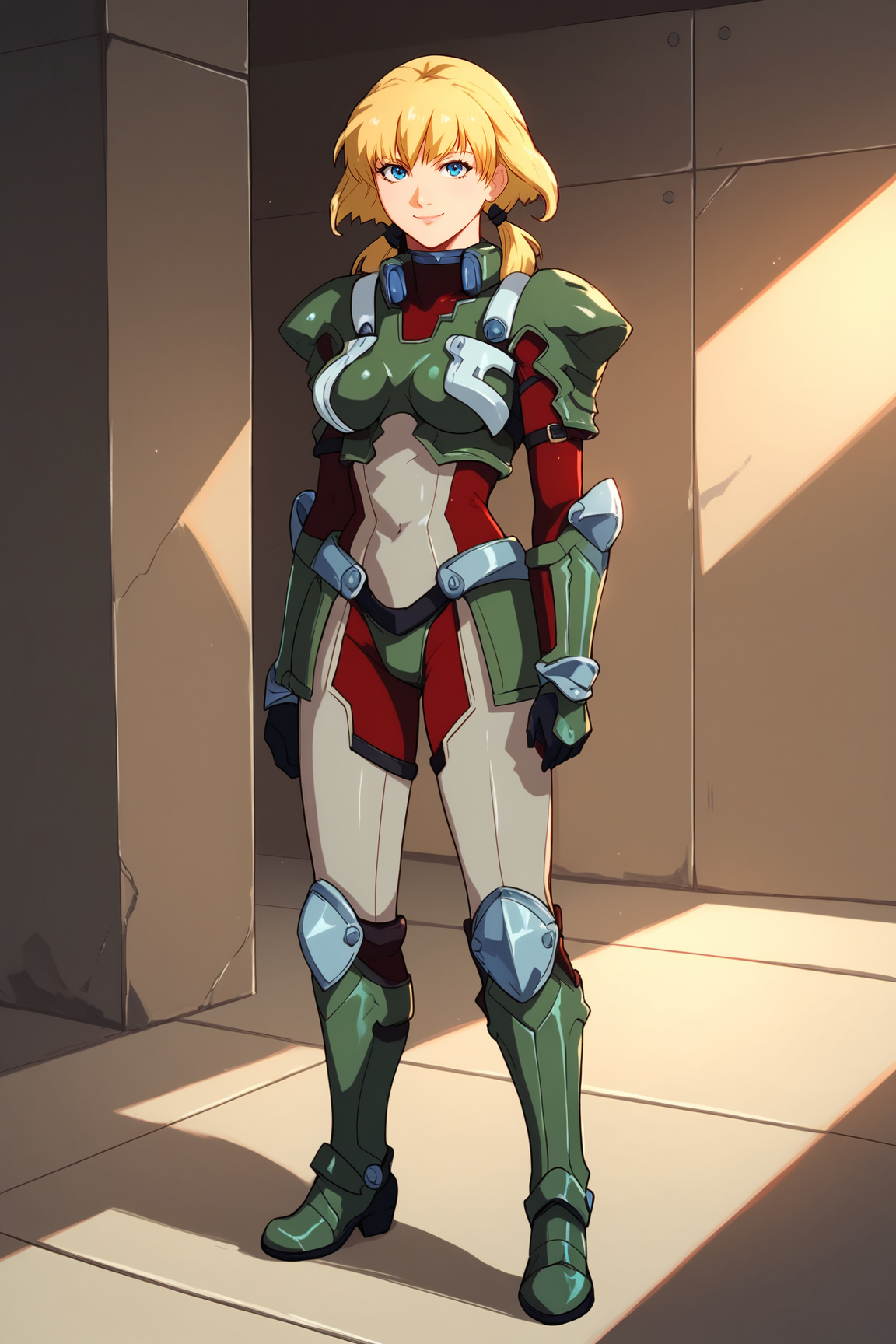 MarleneAngelBGXL, blue eyes, blonde hair, short hair, bangs, low twintails, medium breasts, green armor, shoulders armor, red bodysuit, green guantlets, black gloves, green knee pads, green boots