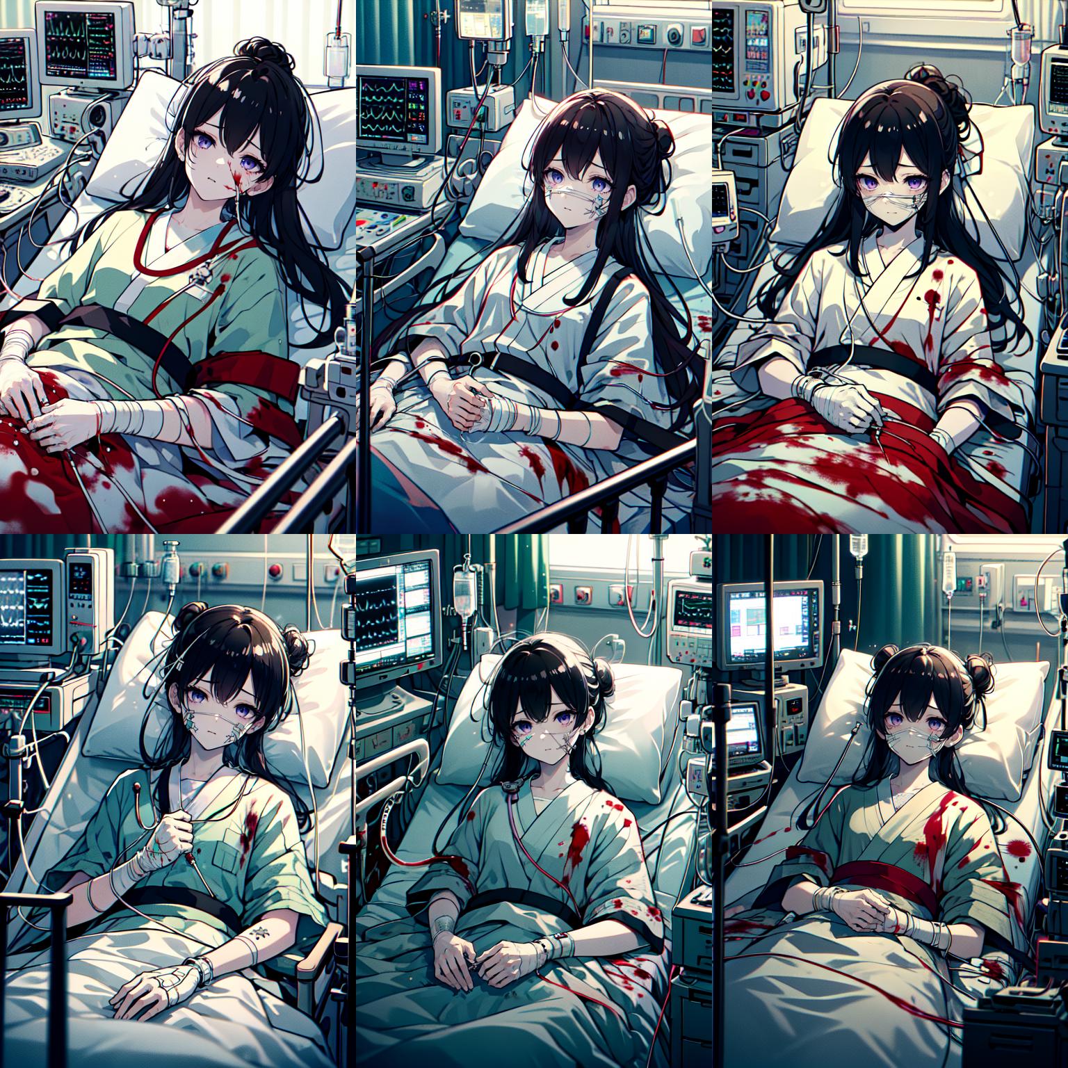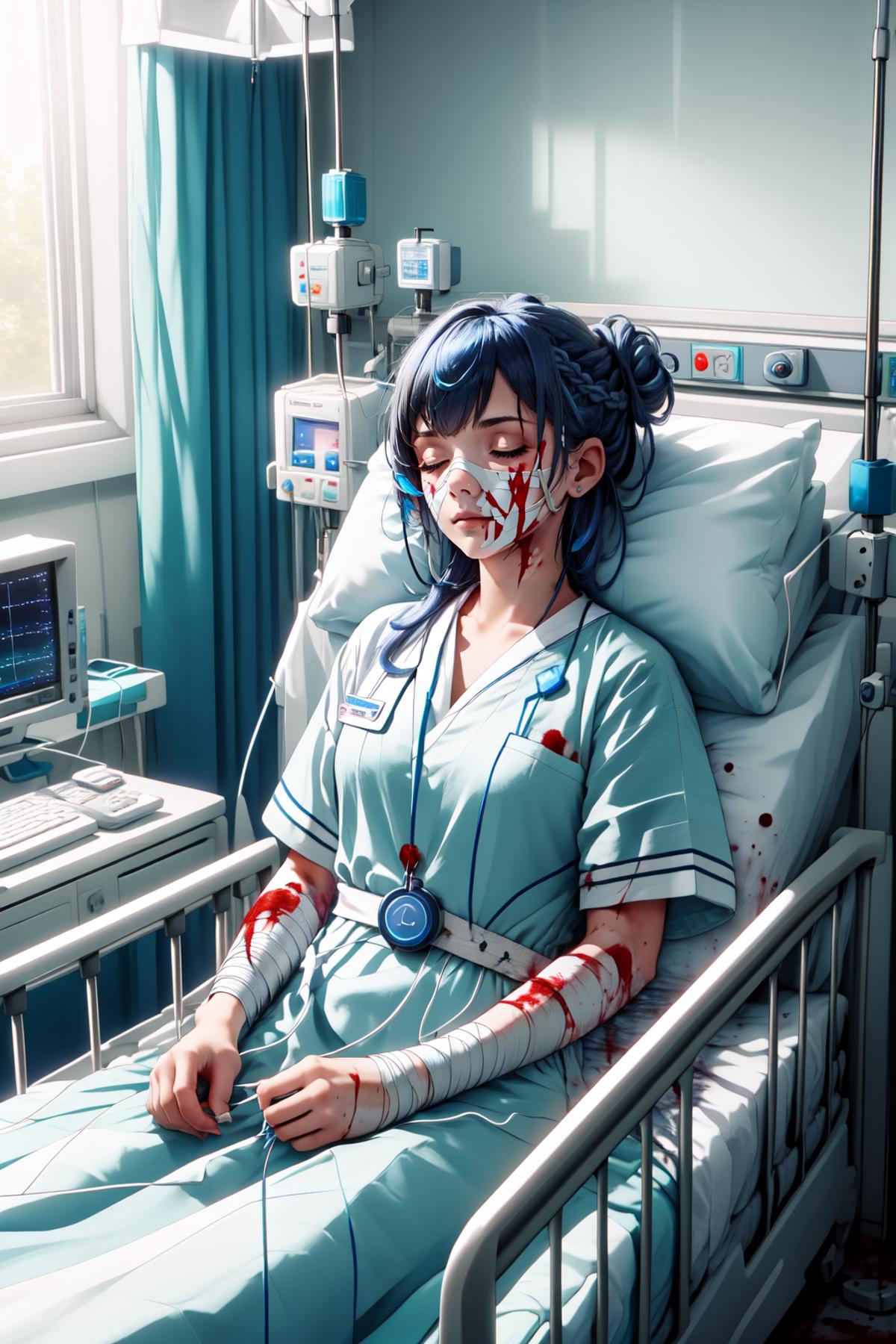 life support machine,lying on hospital bed,lying,sleeping,hair bun,stethoscope,hospital gown,bandages,monitor,thermometer,blanket,cable,on bed,tape measure,computer,(((bloody, blood on gown))),bandages on face,