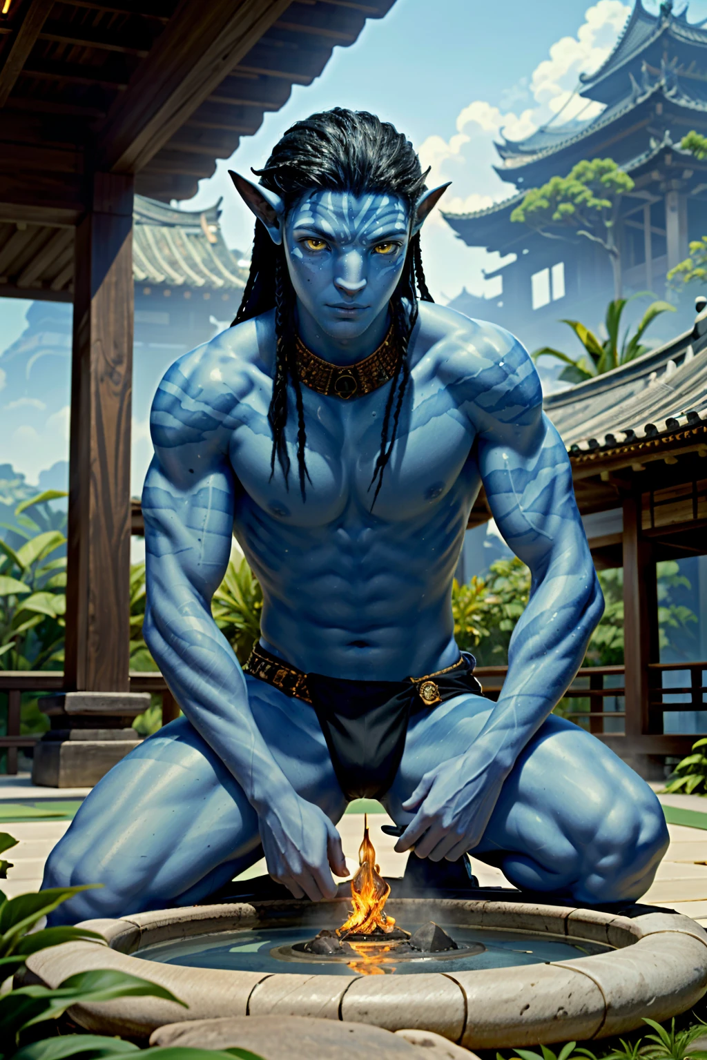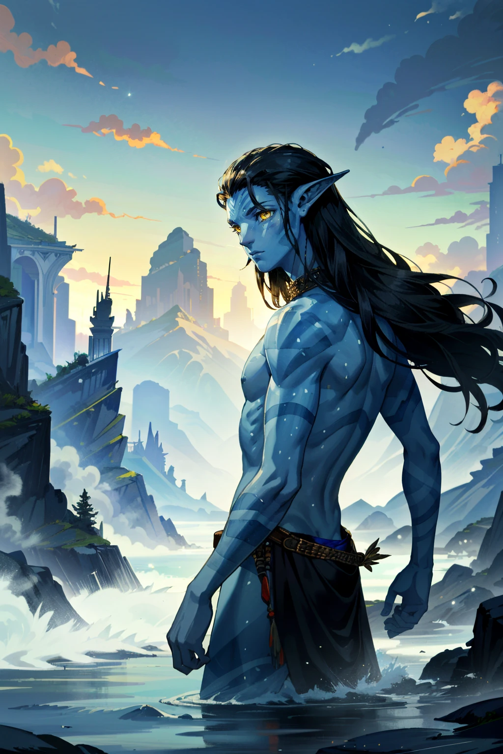 AvNeteyam, 1boy, blue skin, yellow eyes, black hair
