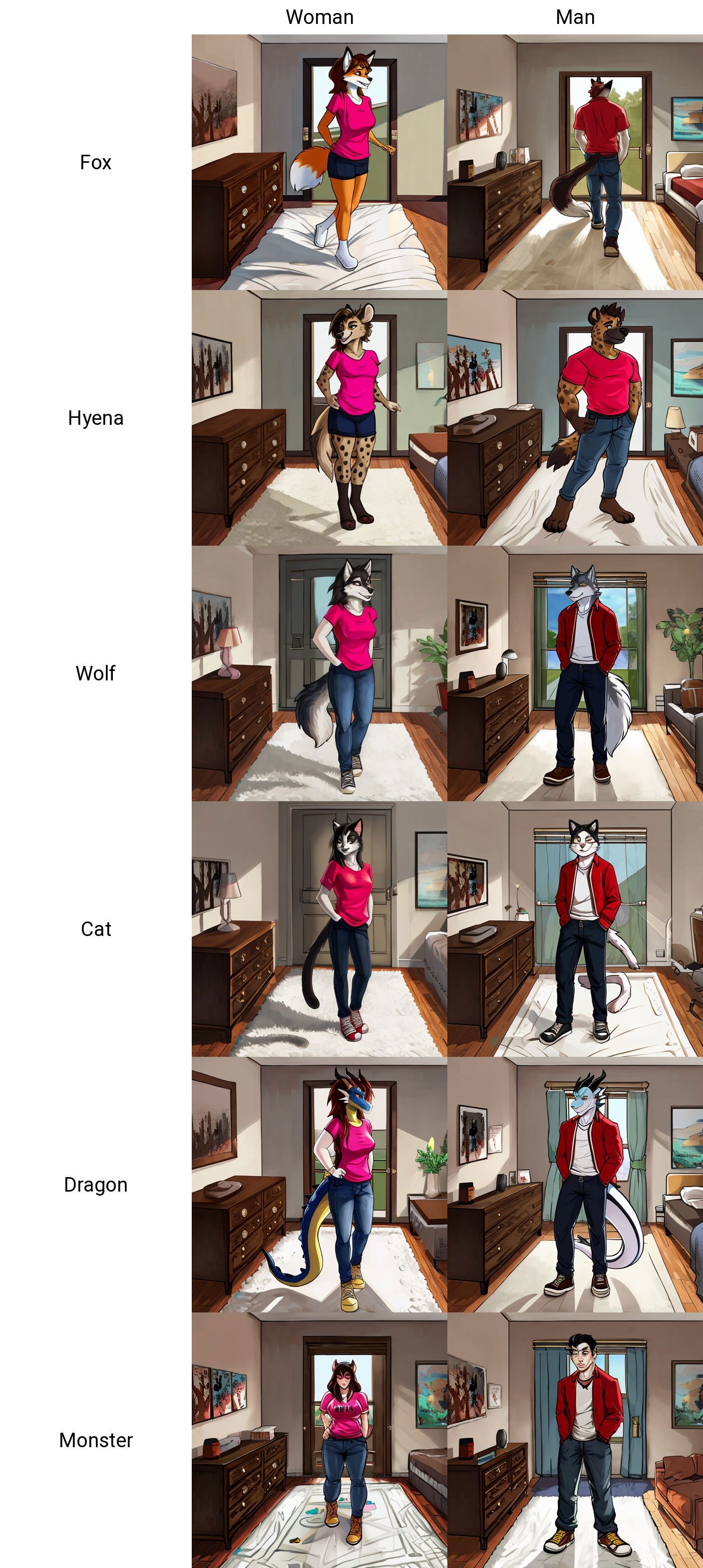 {{"animal species" "Gender" shows "??????? of choice"}} ????? in bedroom, realistic