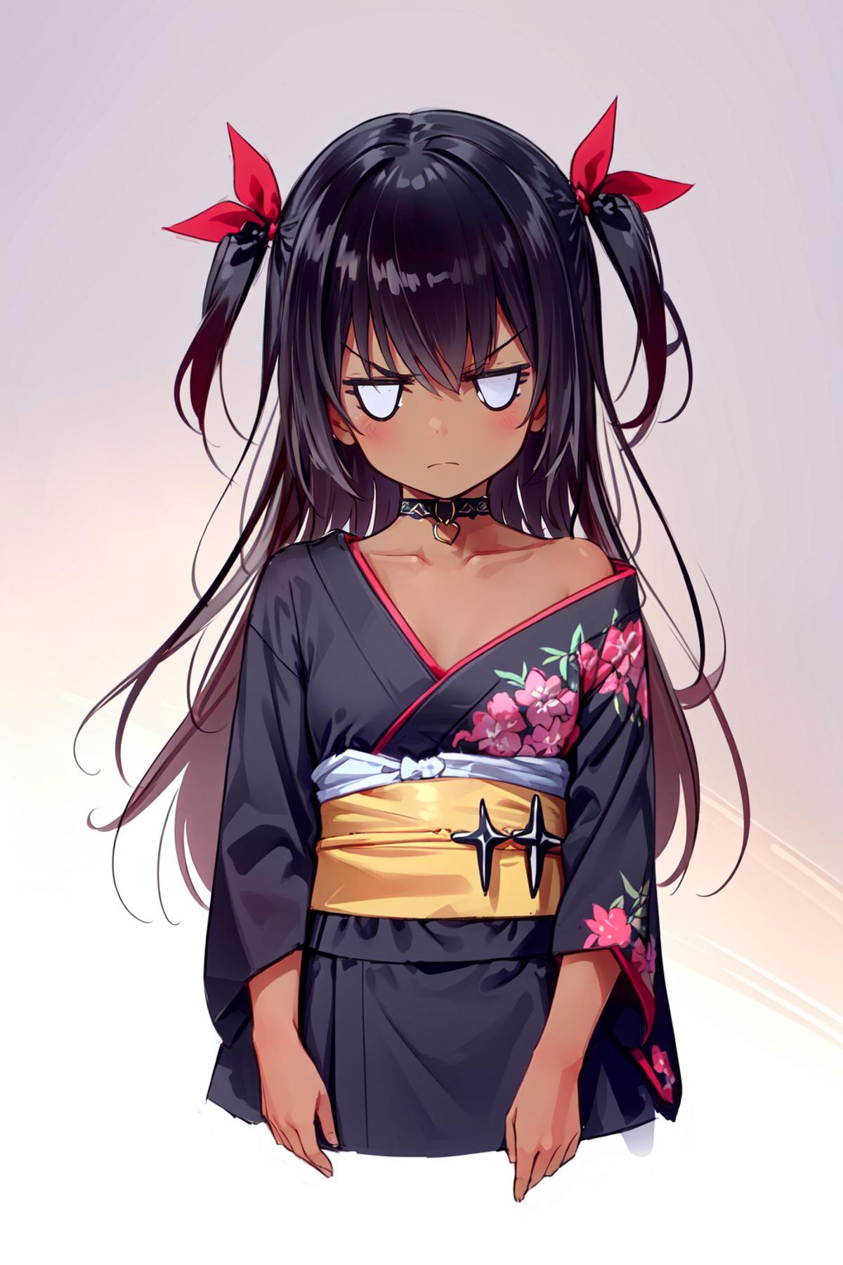 MasterNemesis, dark skin, long hair, two side up, hair ribbon, choker, black kimono, sash
