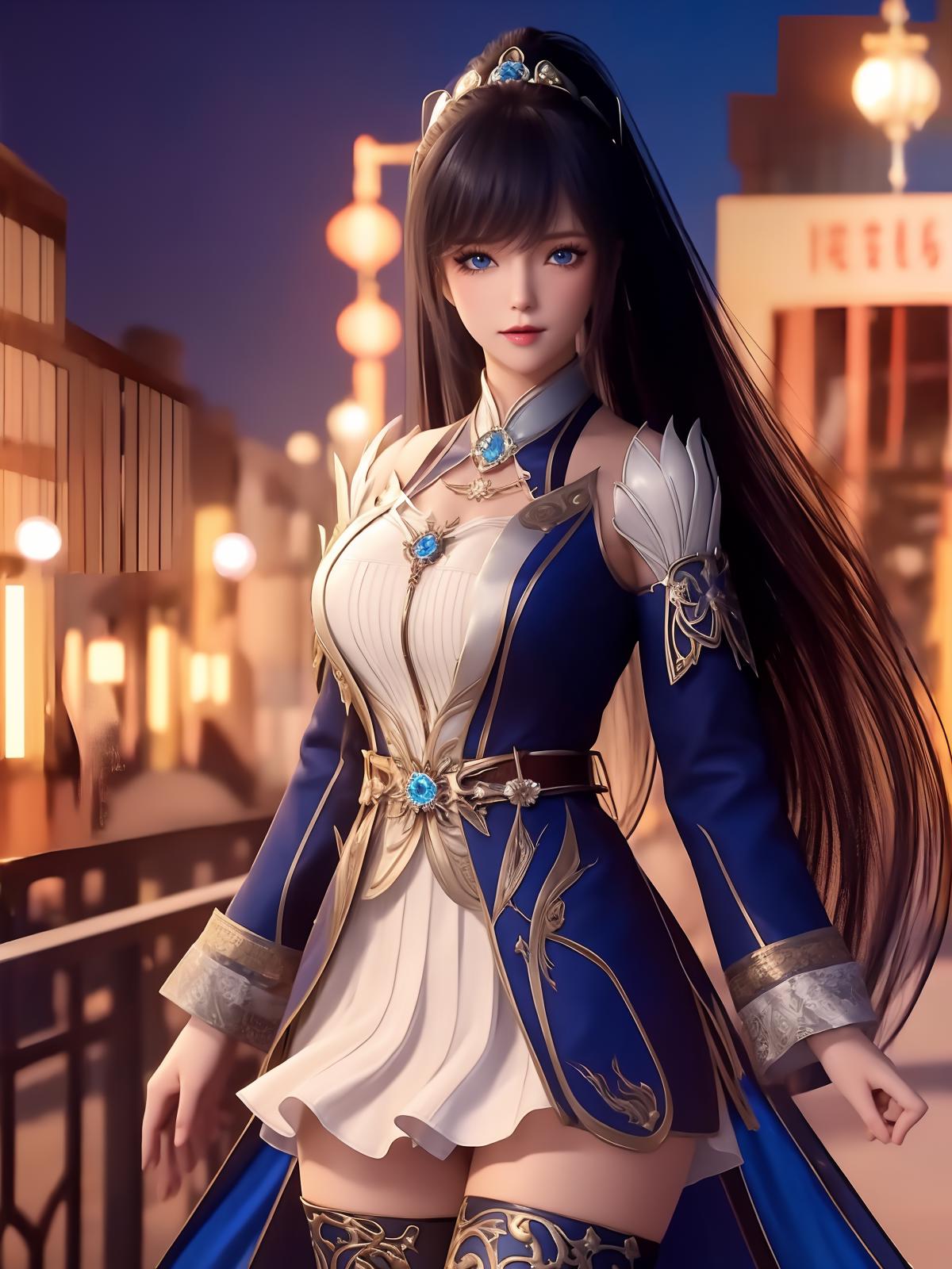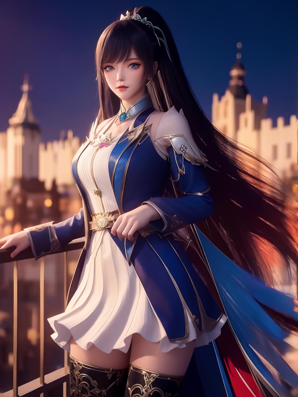 • 1girl,long hair,dress,hair ornament,looking at viewer,mature female,cityscape,night,thighhighs,clothing cutout,bangs,white skirt,ponytail,cowboy shot,long sleeves,belt,blue eyes,makeup,blush,black thigh boots,armor,jewelry, gem,