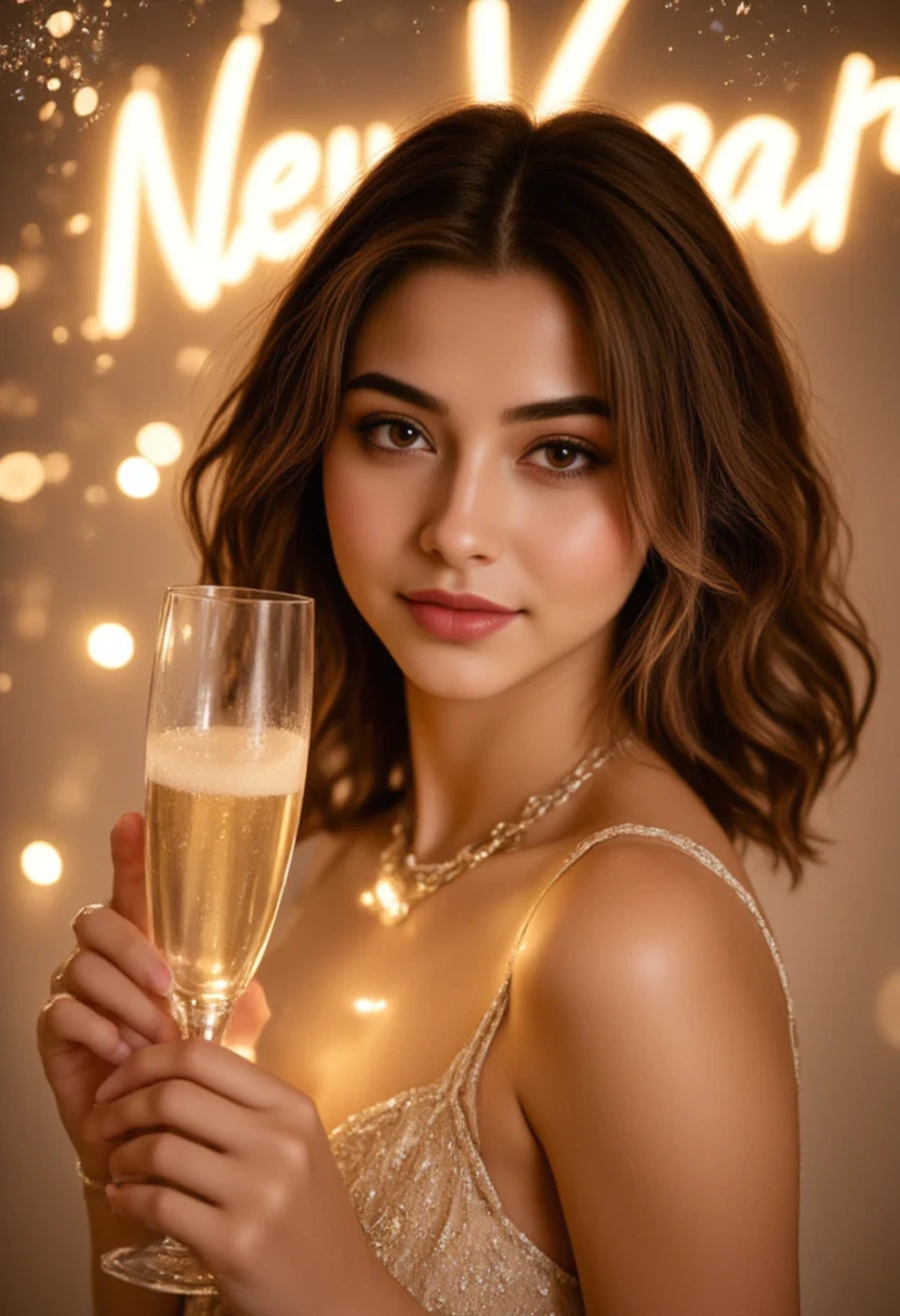 Parlak 'Yeni Yıl' yazılı şampanya kadehi tutan güzel genç bir kadın.