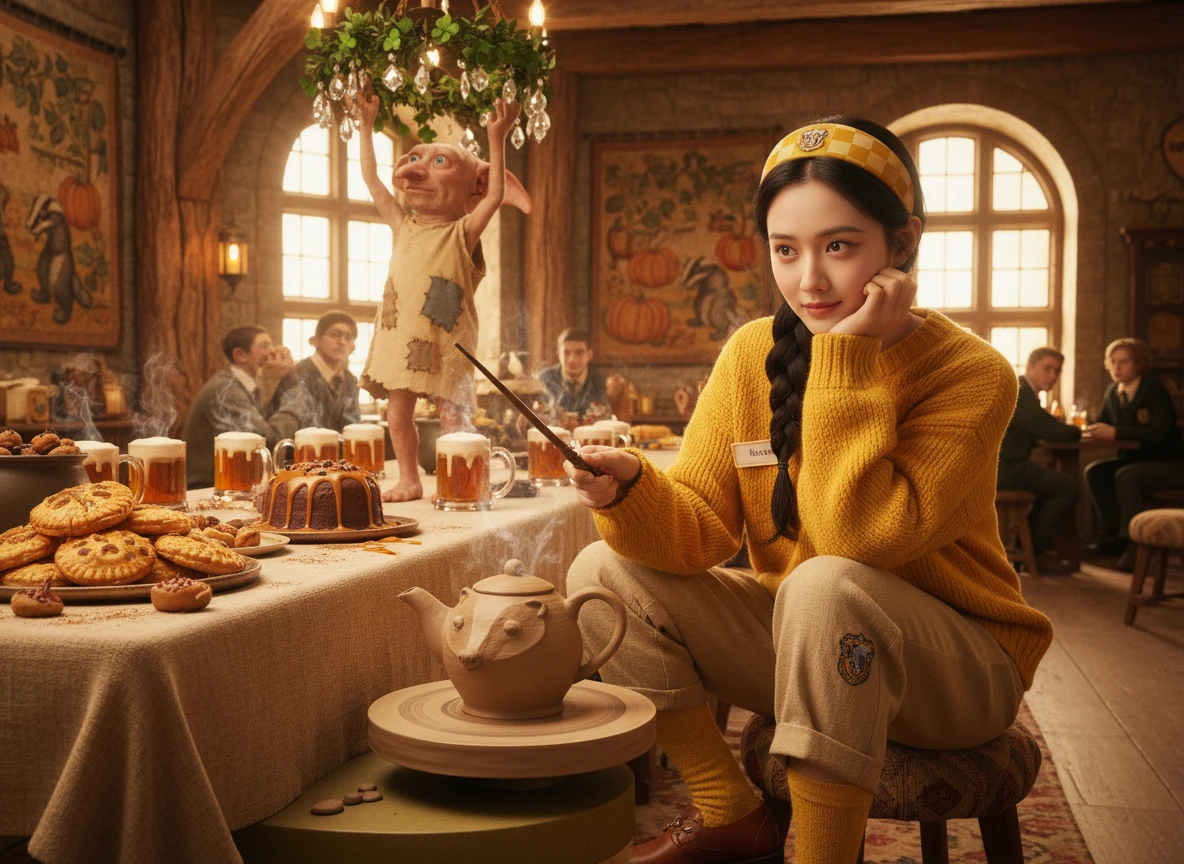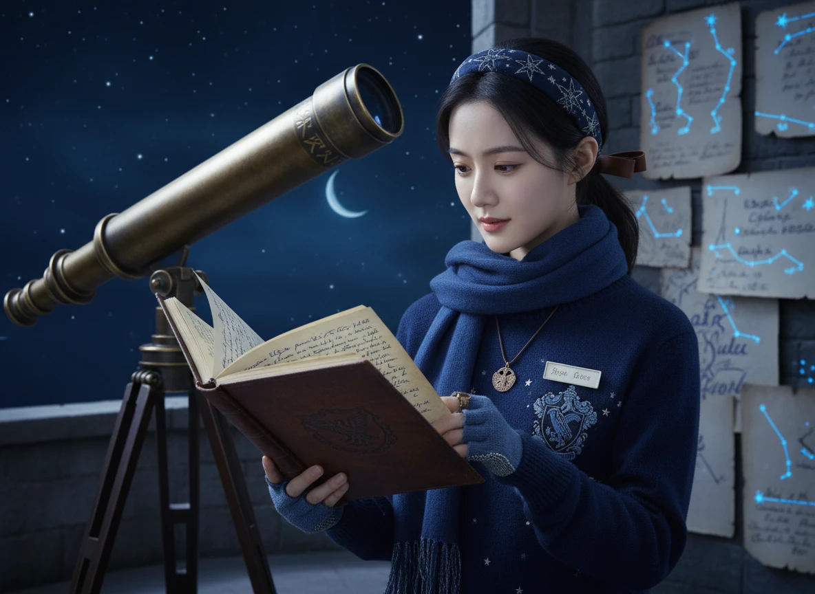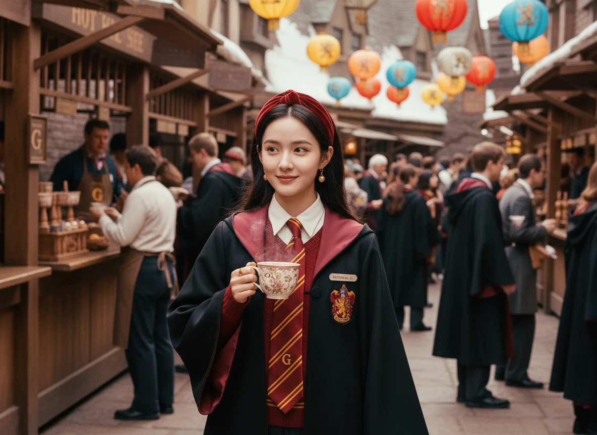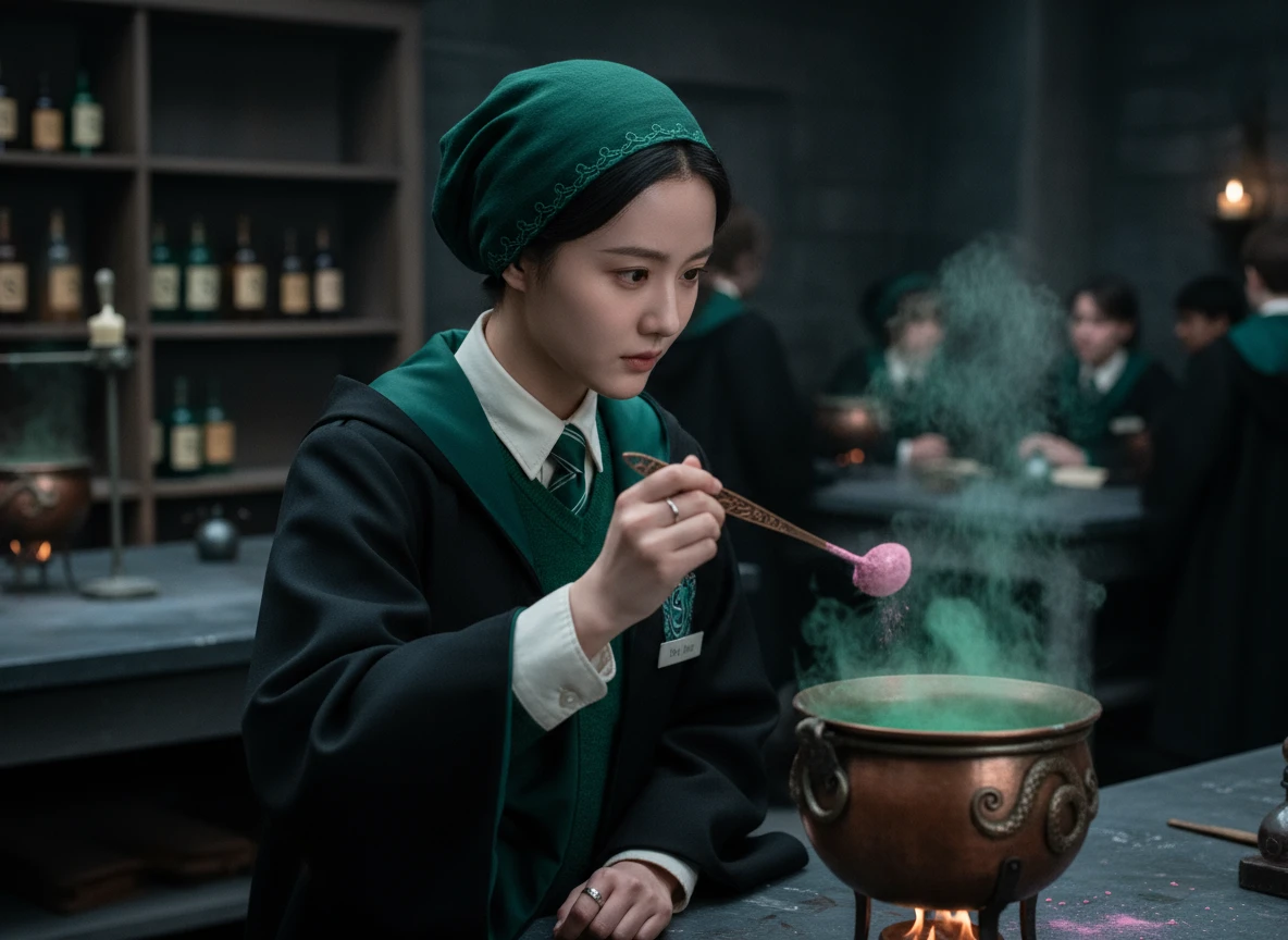 Koyu Yeşil 💚, altın🟡, derin kahverengi🟤—vintage ve büyüleyici, with subtle glitter effects✨ on the wizard outfit and portal to highlight the academy's mysterious vibe.