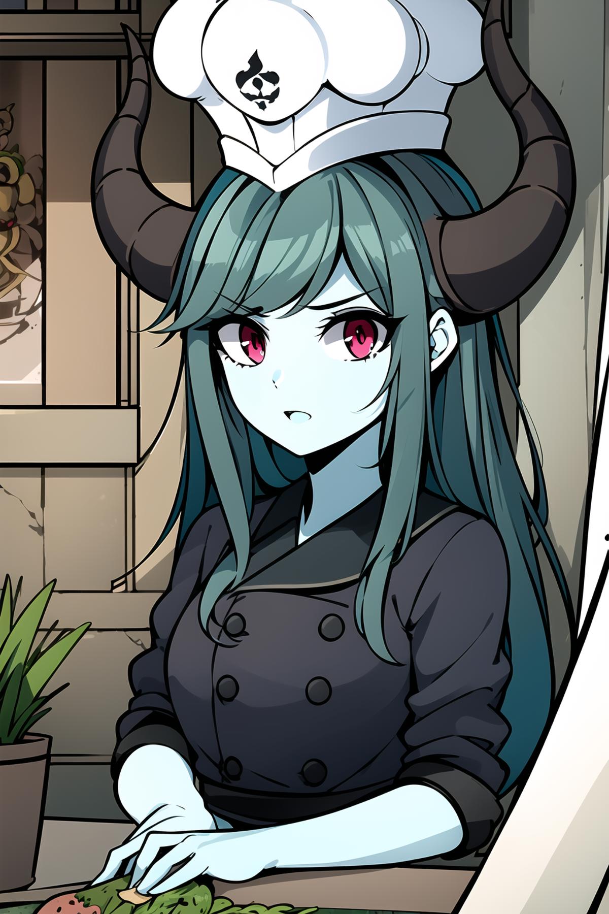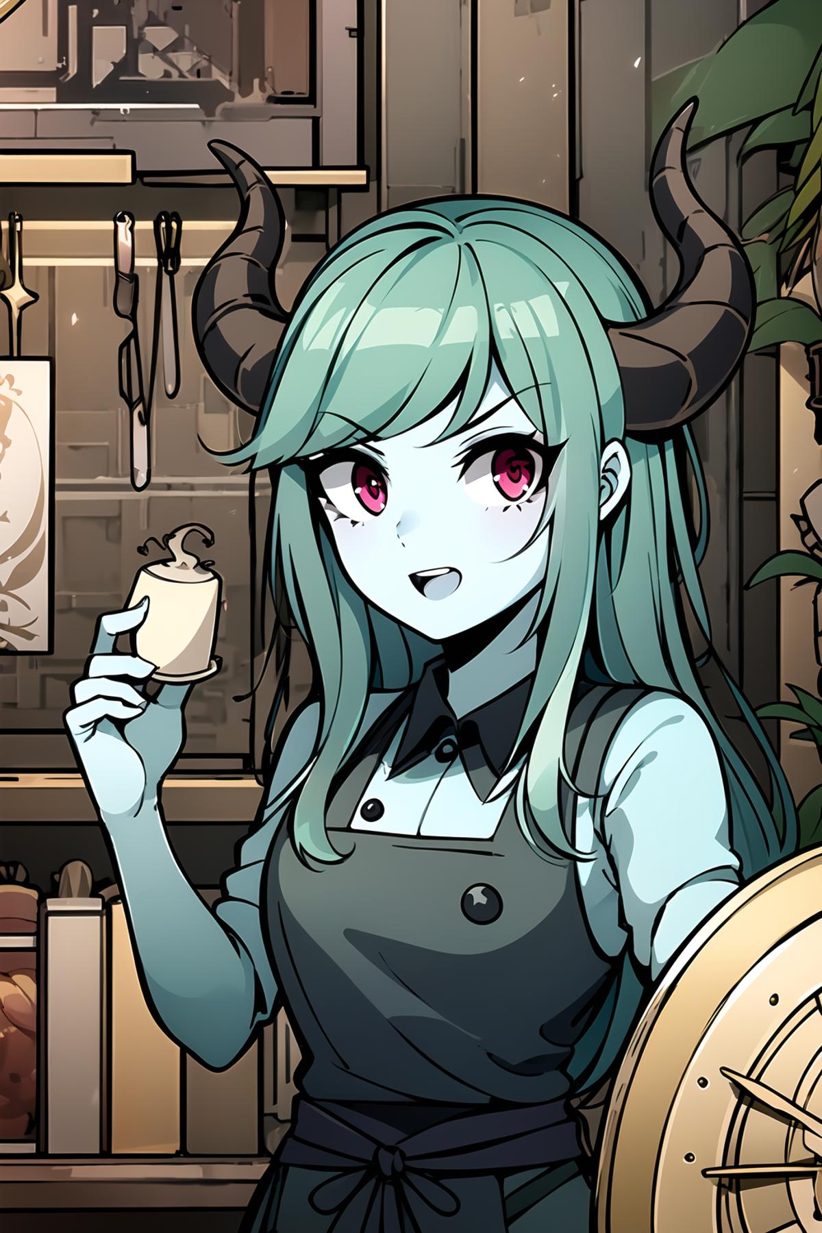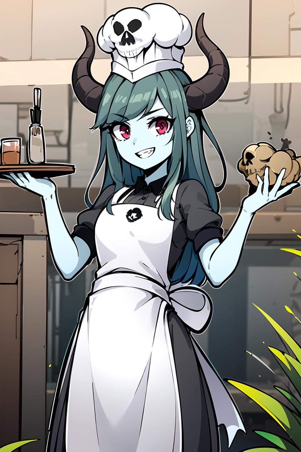 colored skin, horns, hat, apron, green skin, green hair, red eyes