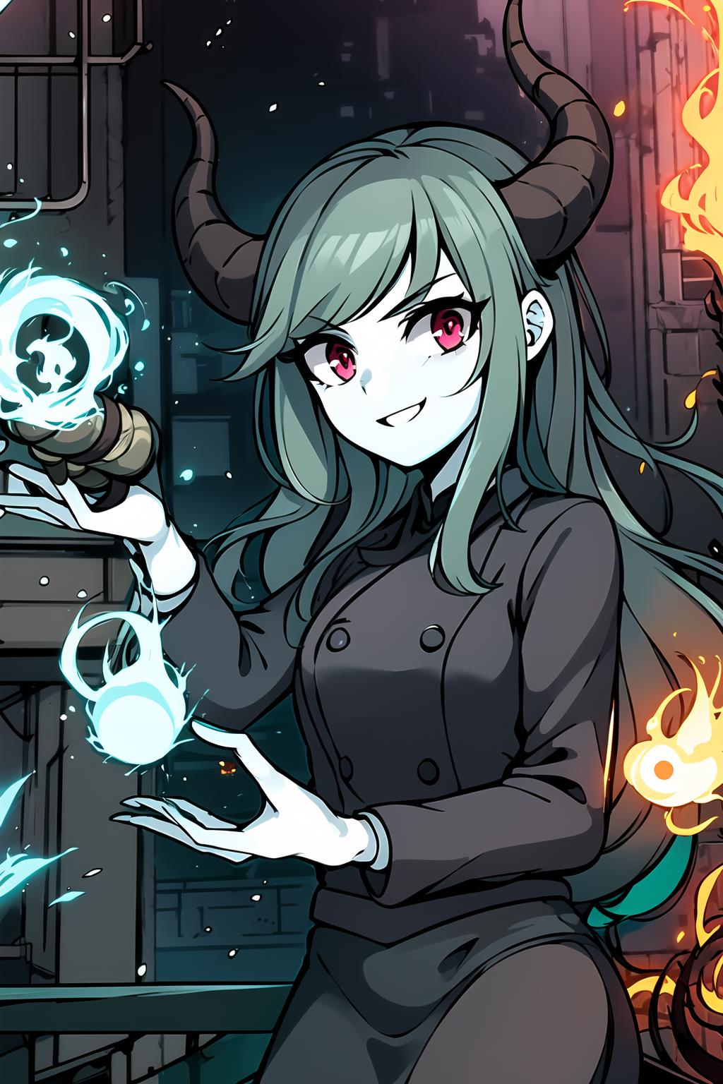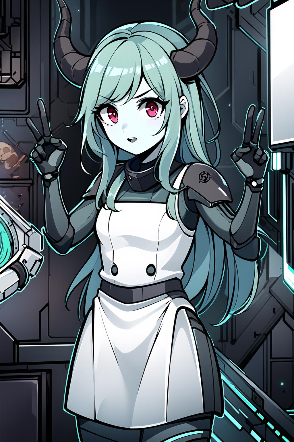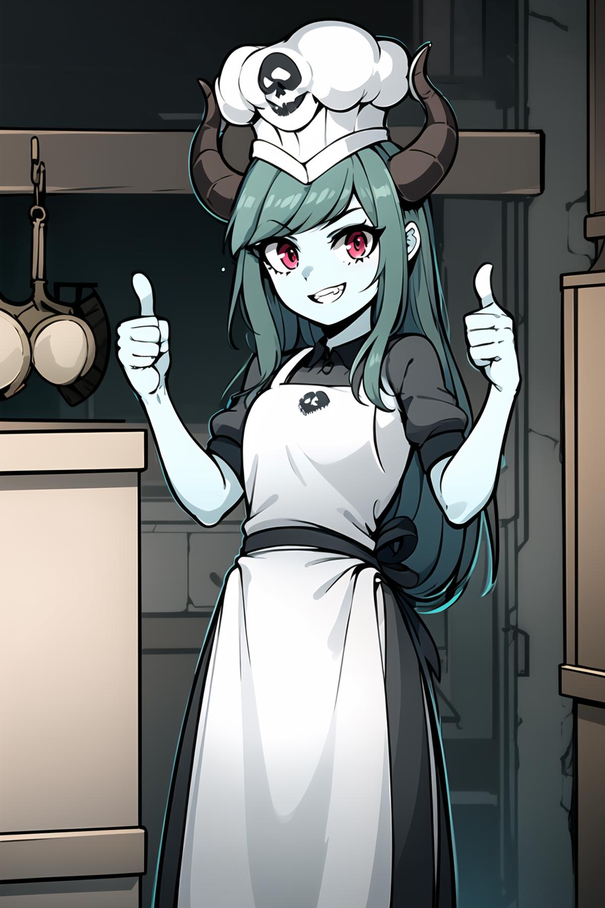 colored skin, horns, hat, apron, green skin, green hair, red eyes