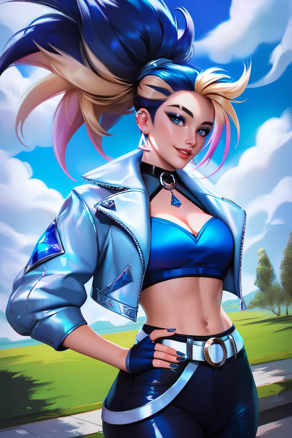 Allout, 1girl, long hair, multicolored hair, ponytail, blue eyes, earrings, eyebrow cut, choker, crop top, crop jacket, fingerless gloves, midriff, belt, pants, shoes, makeup, nail polish