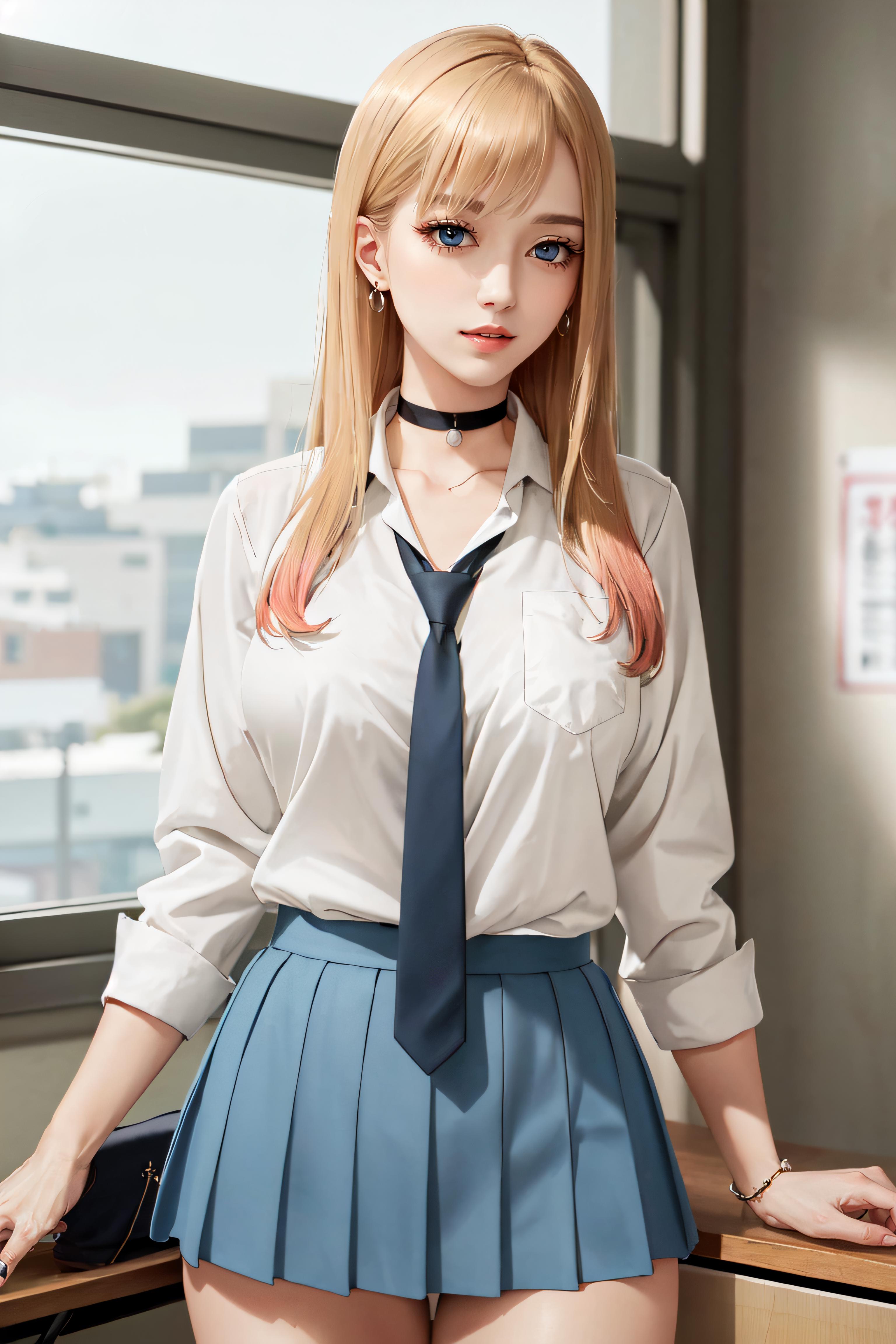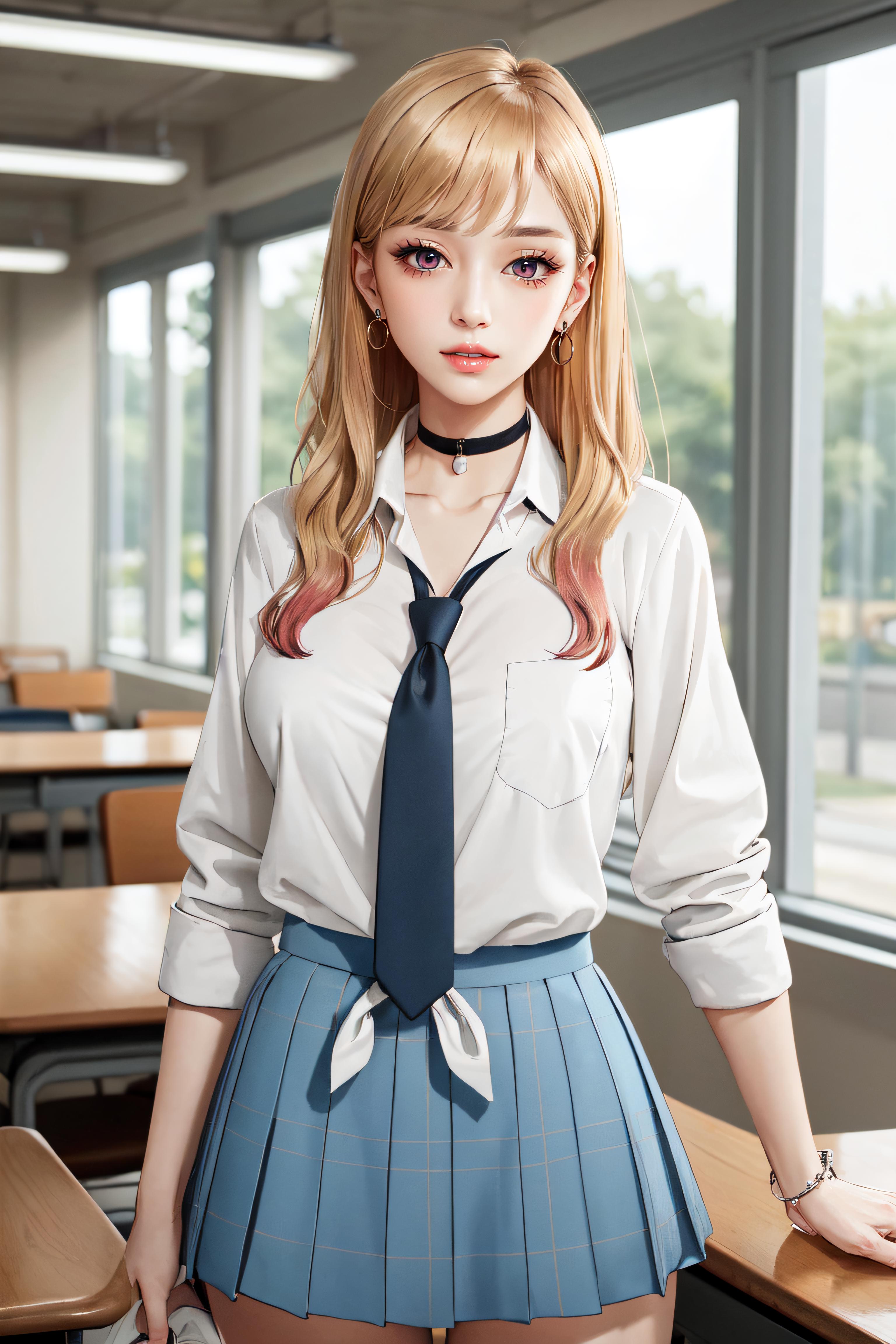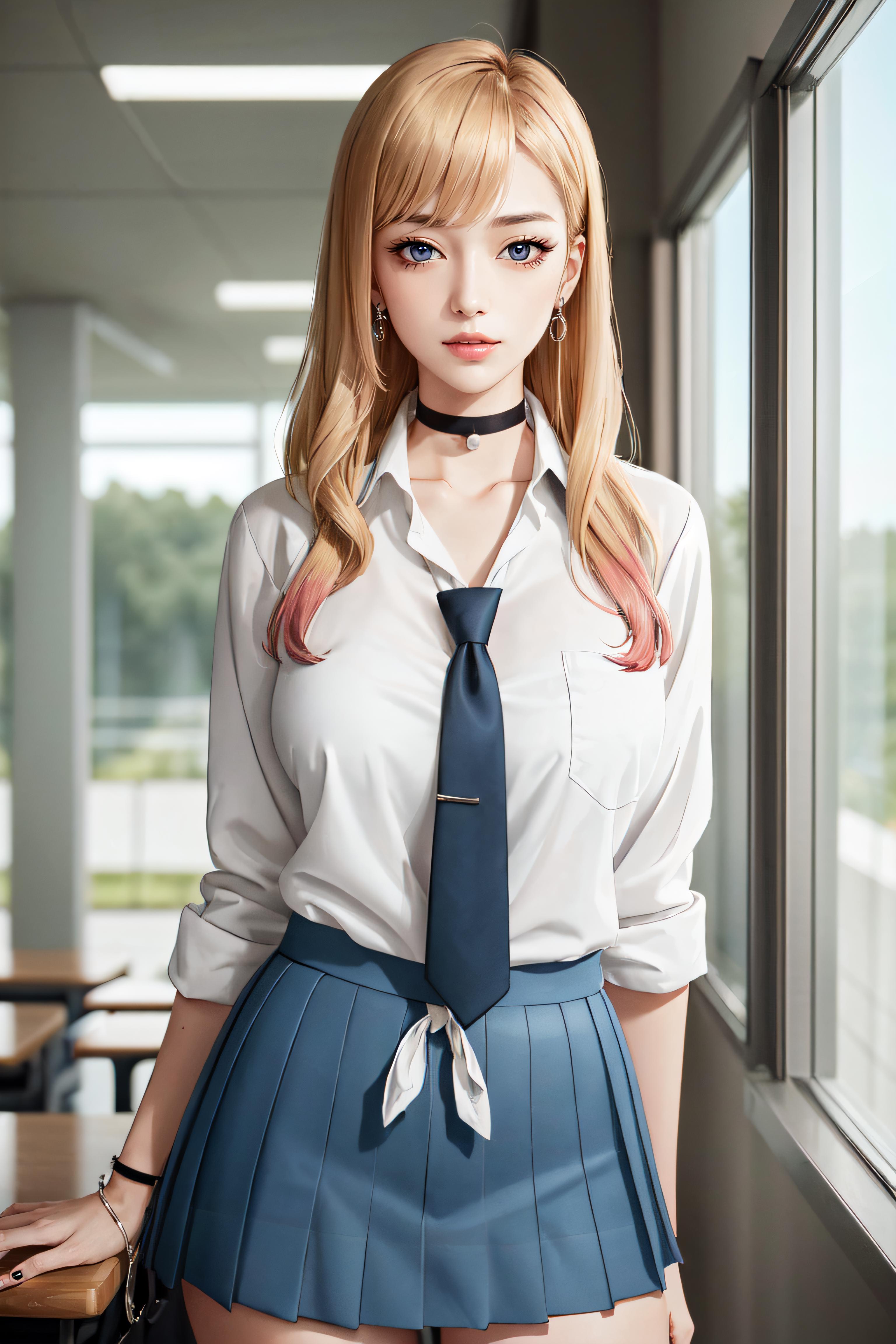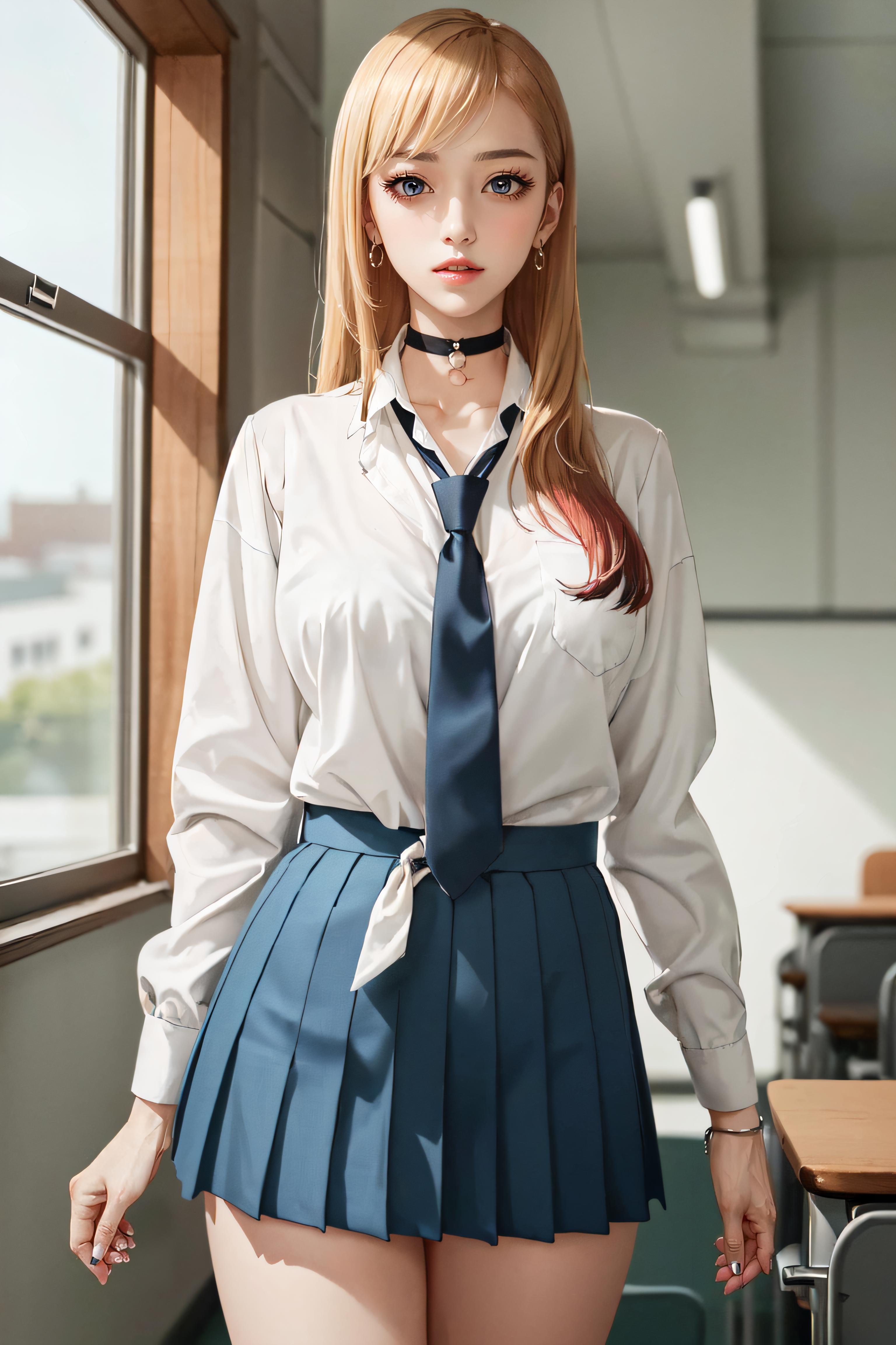 • For her original outfit use the tags: pikkymarin, 1girl, solo, looking at viewer, blonde hair, multicolored hair, gradient hair, long hair, bangs, red eyes, ???????, ??????????????, ear piercing, necktie, school uniform, skirt, choker, shirt, piercing, black choker, jewelry, earrings, white shirt, plaid skirt, tied shirt, plaid, pleated skirt, collared shirt, blue skirt