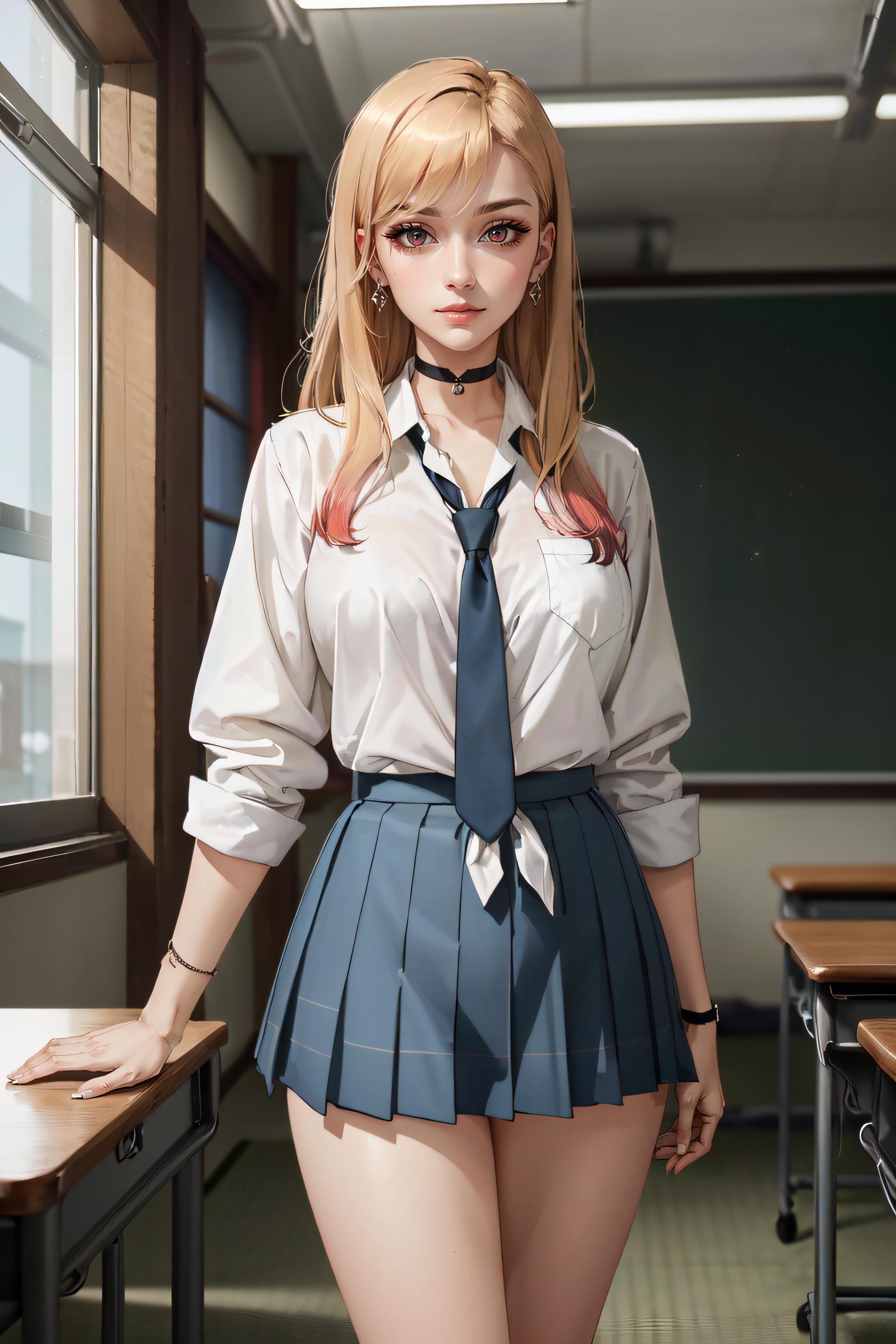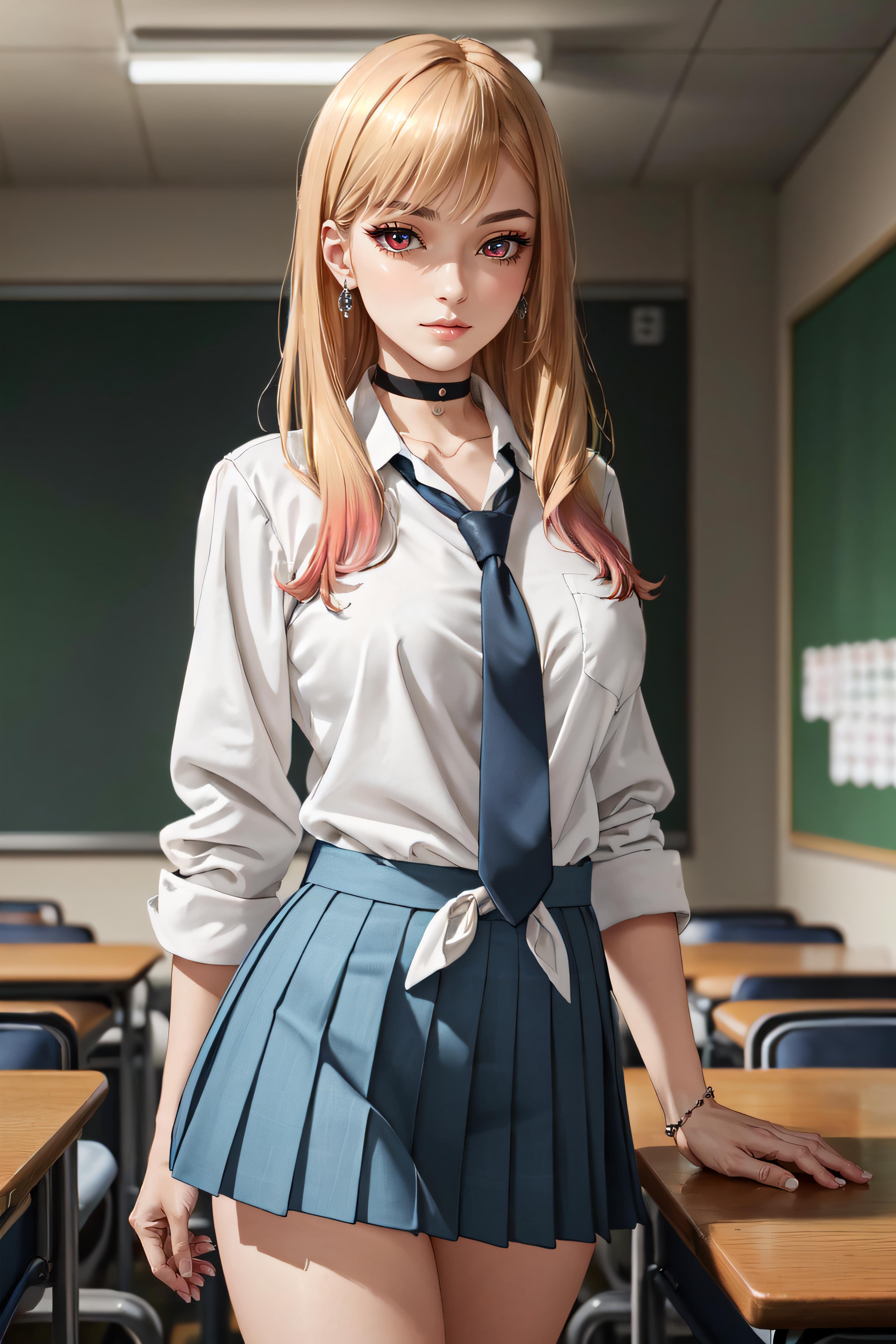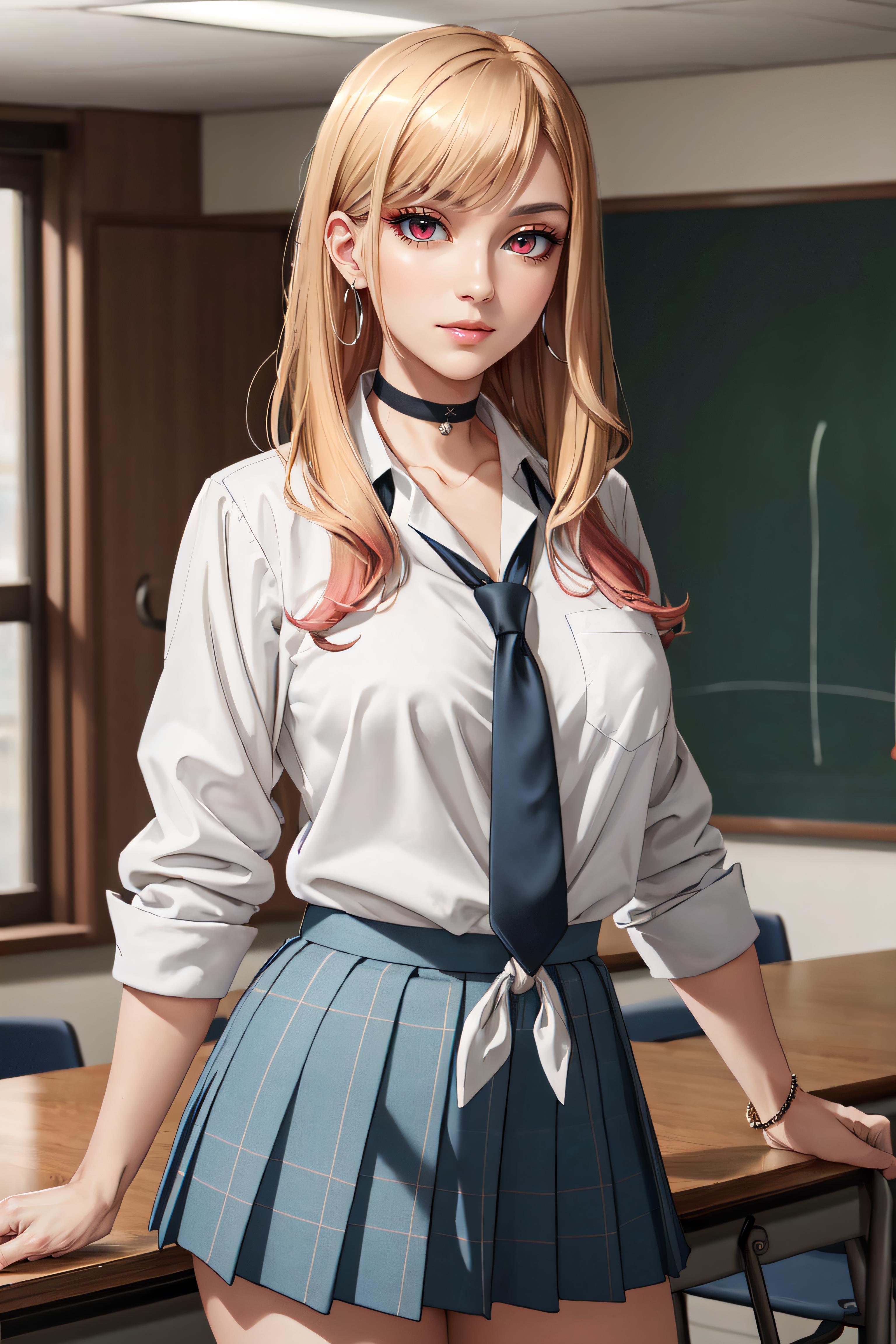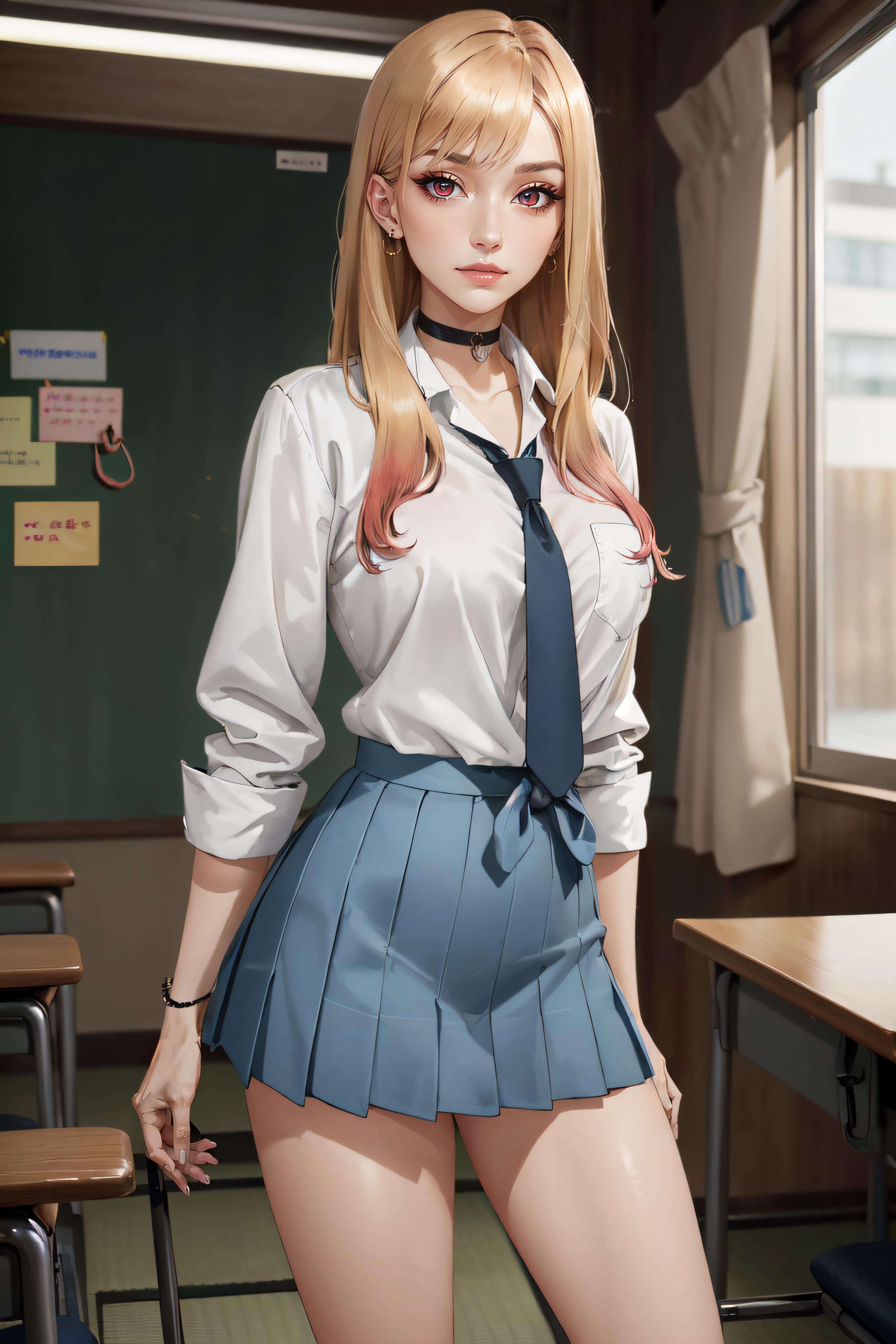 • For her original outfit use the tags: pikkymarin, 1girl, solo, looking at viewer, blonde hair, multicolored hair, gradient hair, long hair, bangs, red eyes, ???????, ??????????????, ear piercing, necktie, school uniform, skirt, choker, shirt, piercing, black choker, jewelry, earrings, white shirt, plaid skirt, tied shirt, plaid, pleated skirt, collared shirt, blue skirt